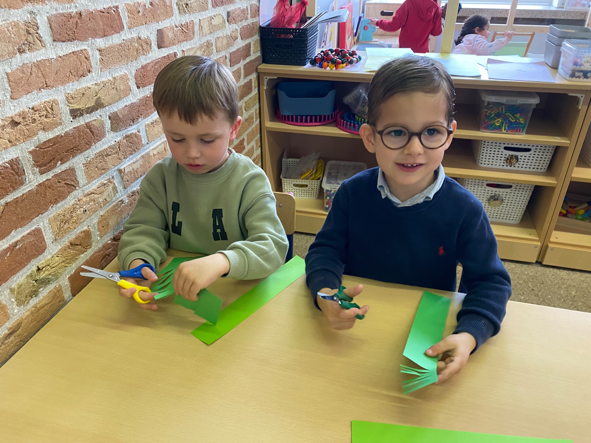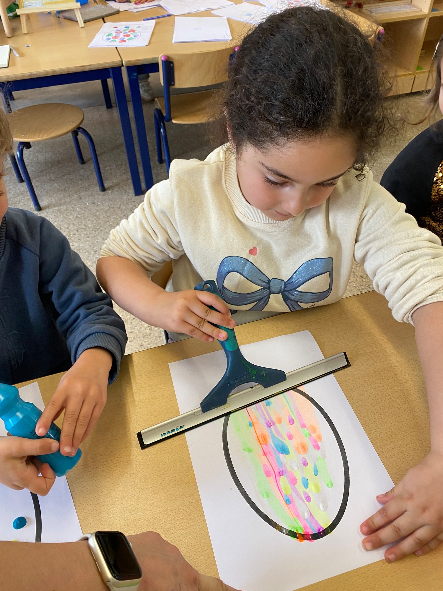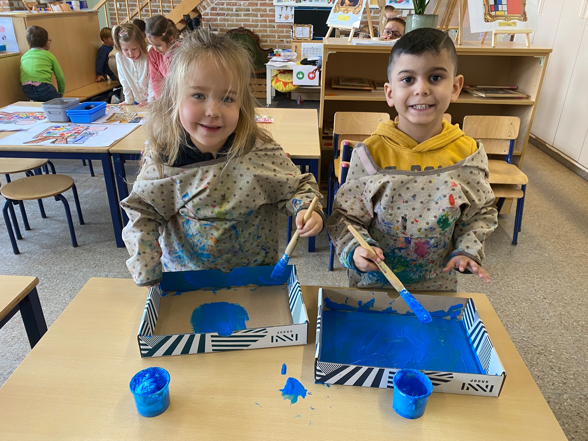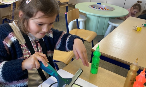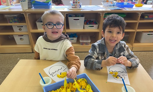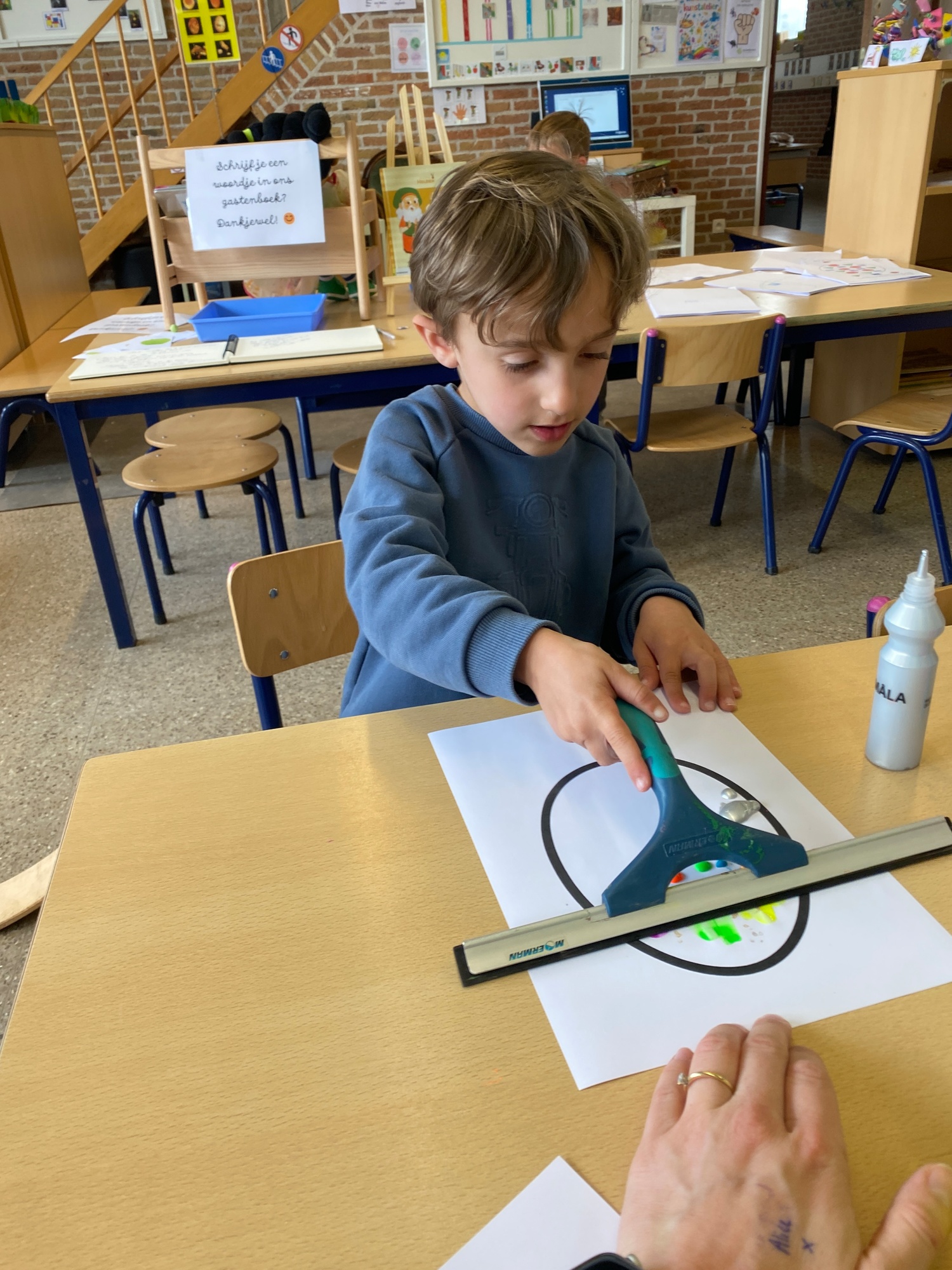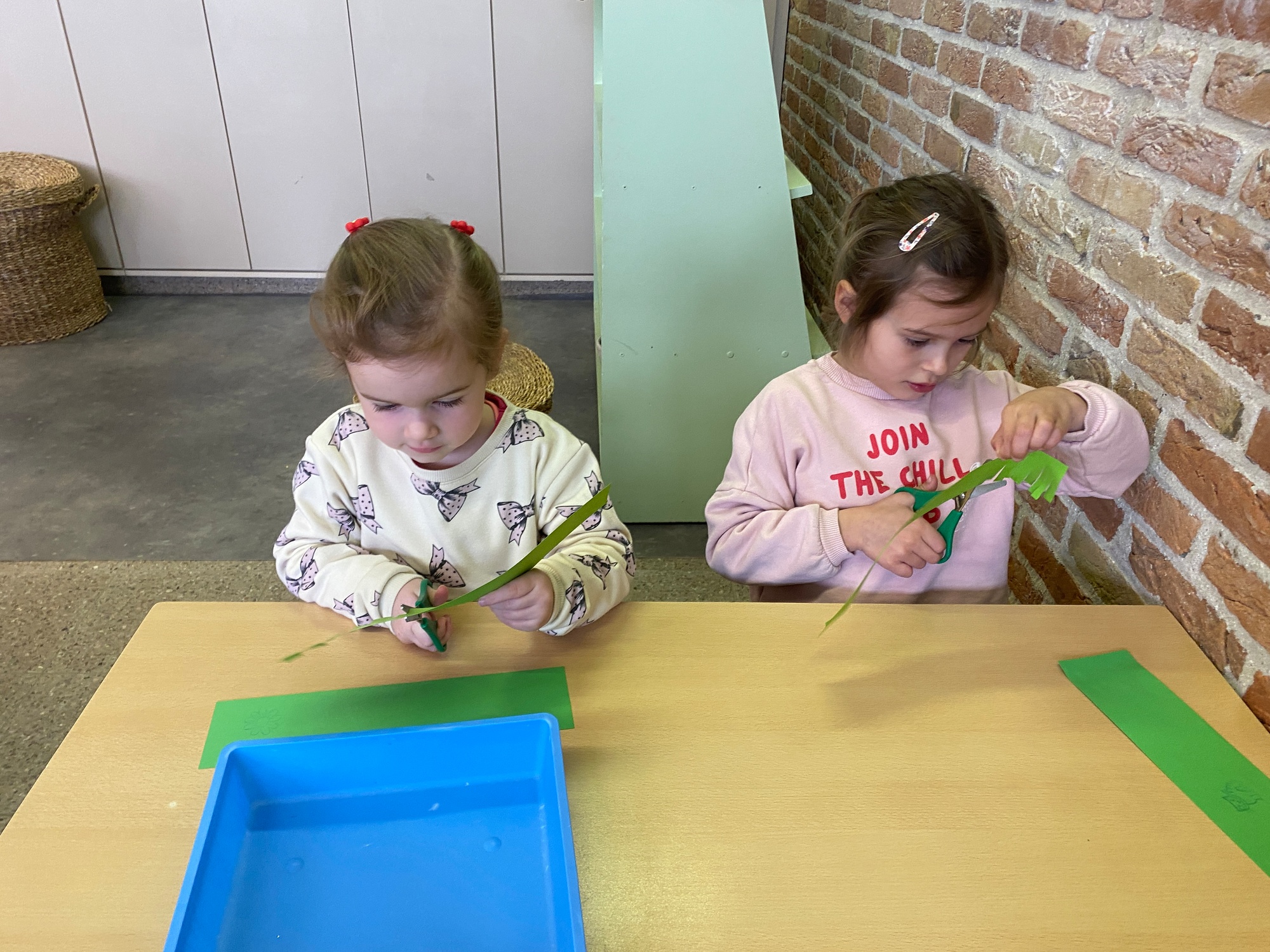 Wolken stempelen, eitjes versieren met stipjes verf en een trekkertje (Wat een mooi resultaat), kuikentje versieren, appel prikken, gras knippen...