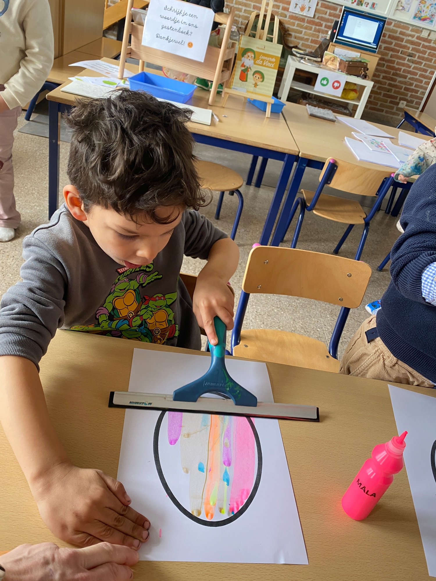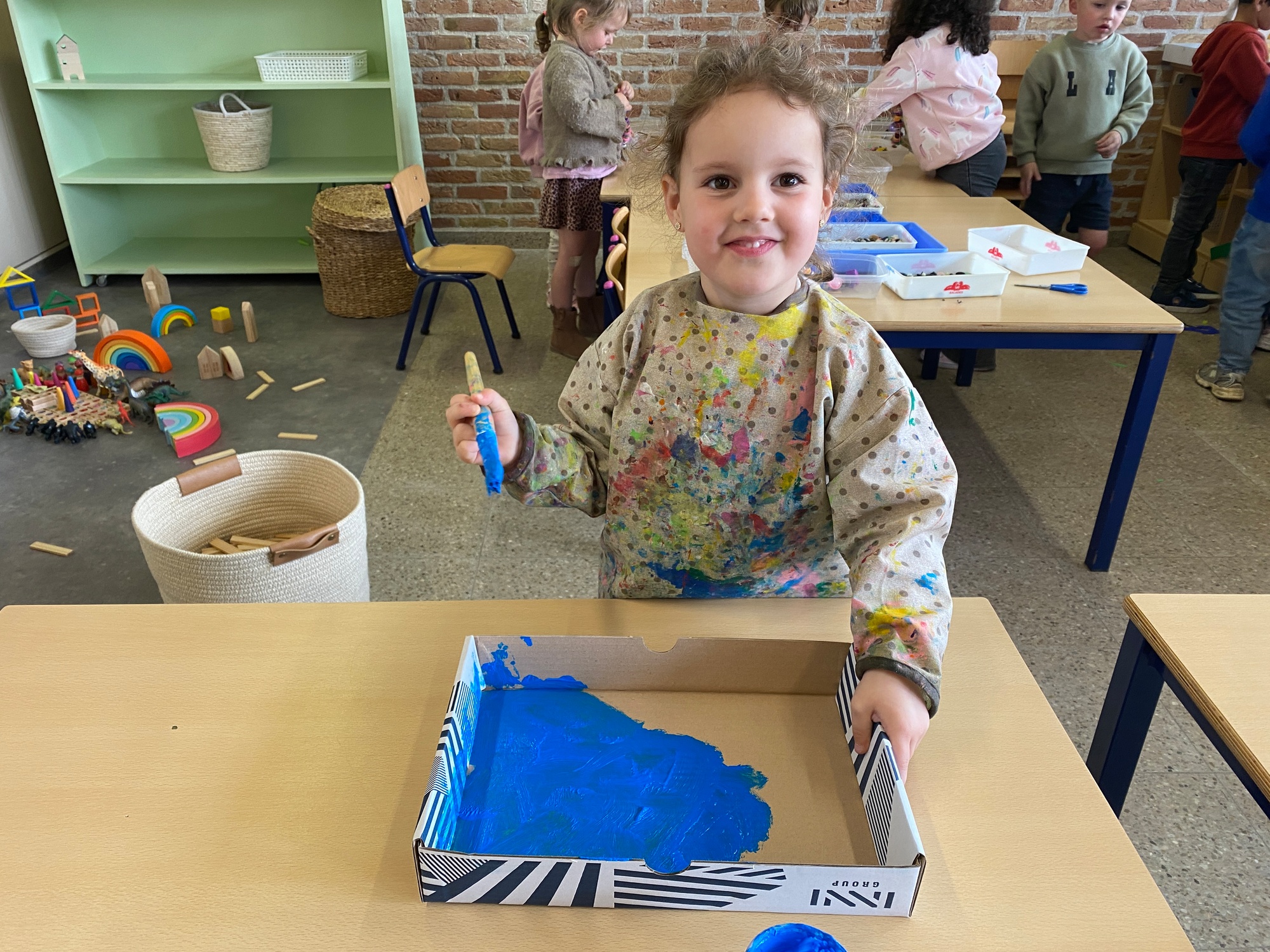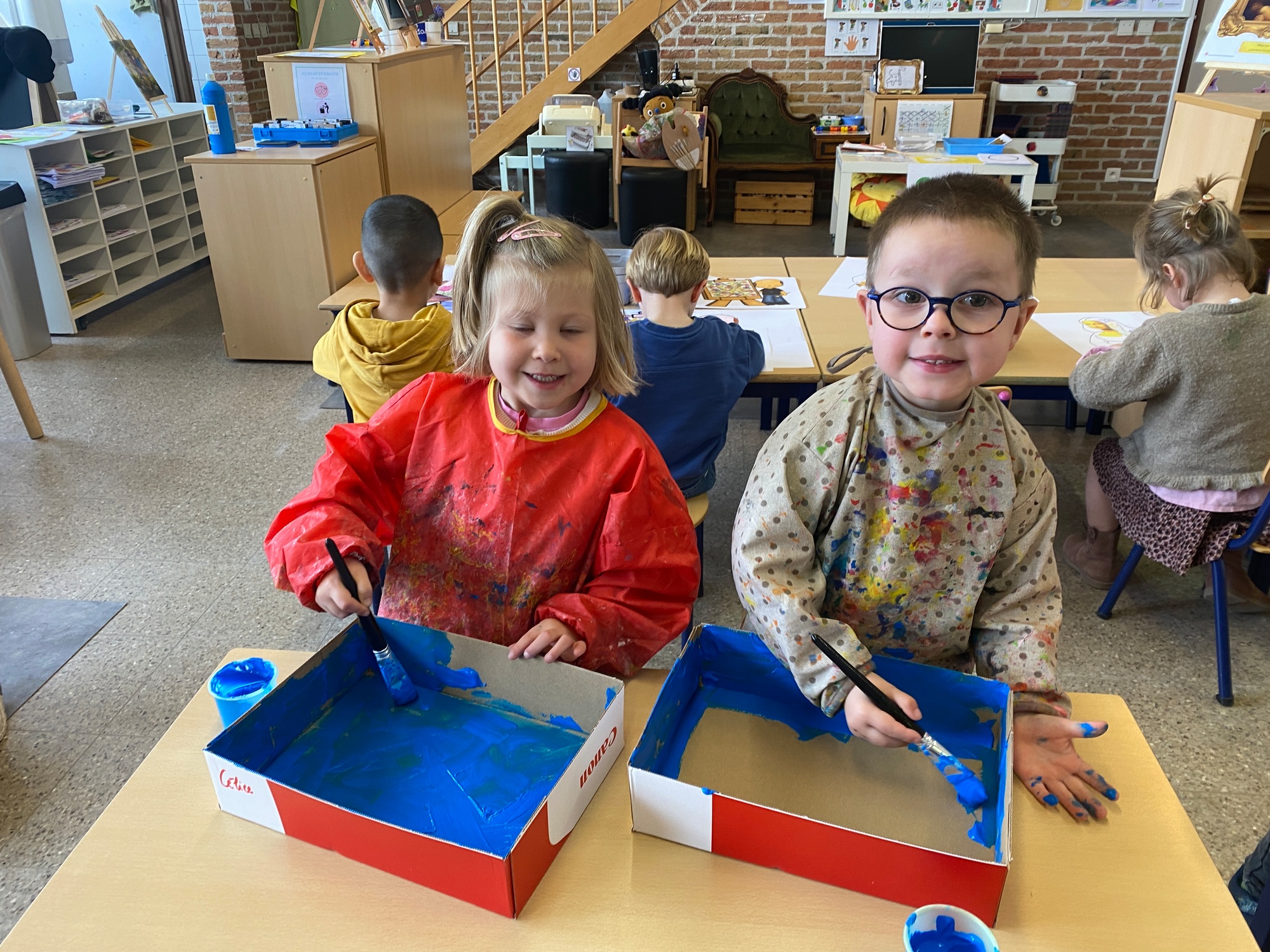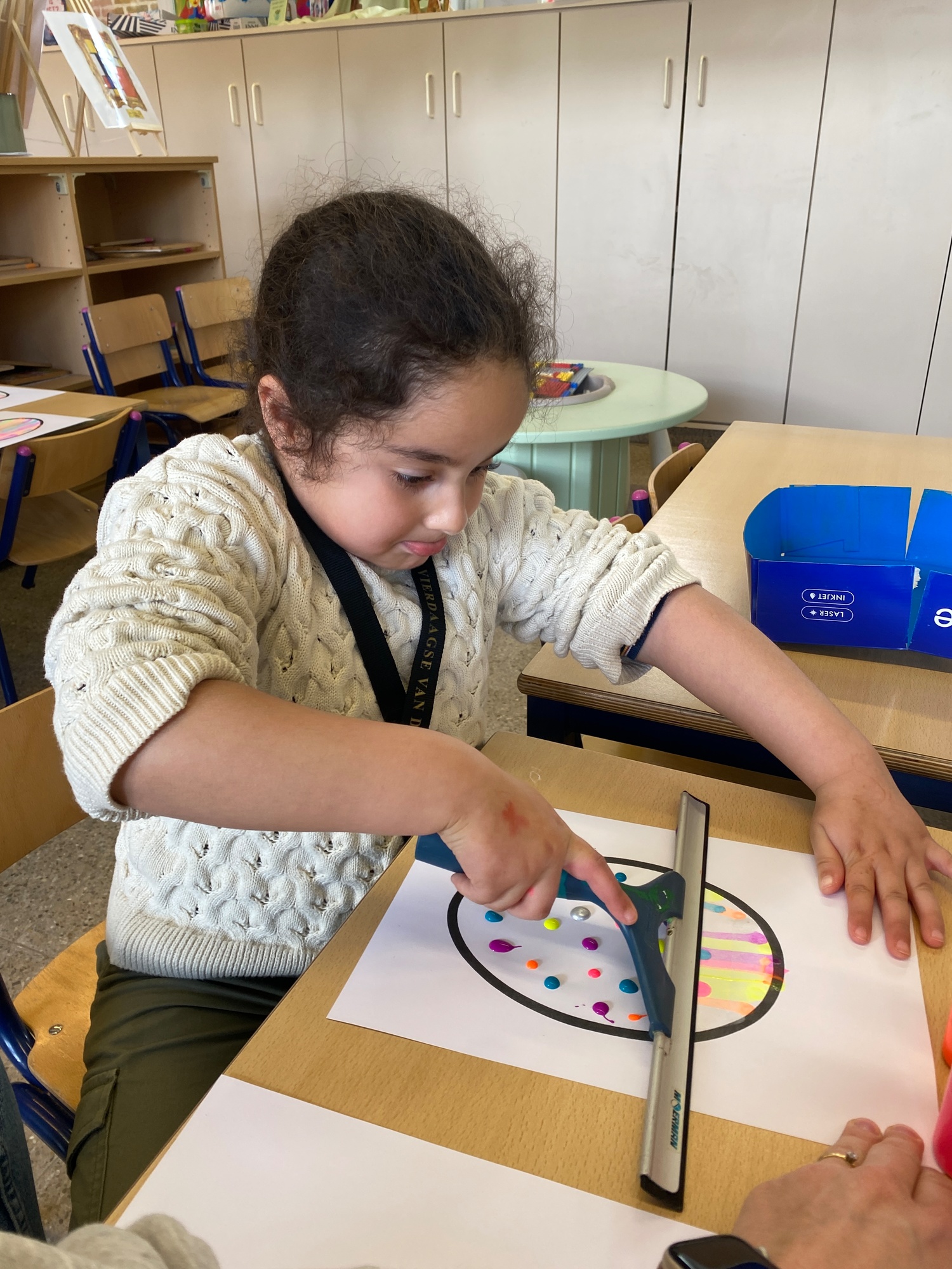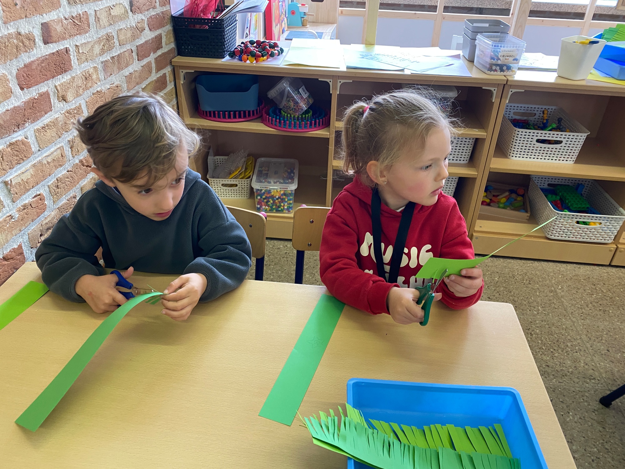 Wolken stempelen, eitjes versieren met stipjes verf en een trekkertje (Wat een mooi resultaat), kuikentje versieren, appel prikken, gras knippen...