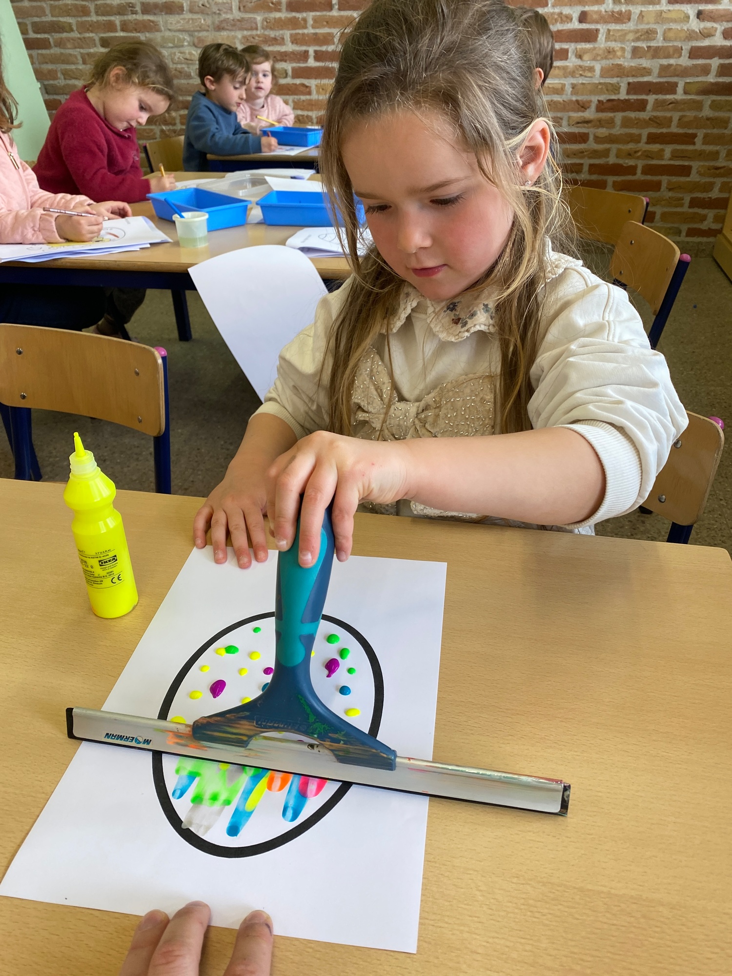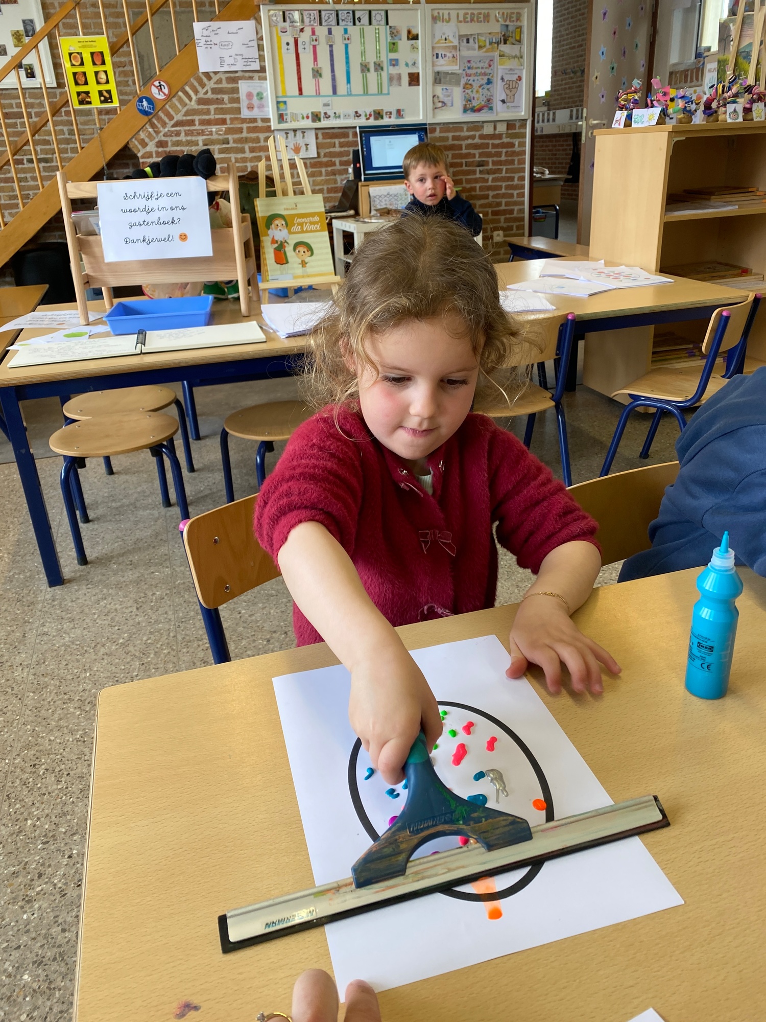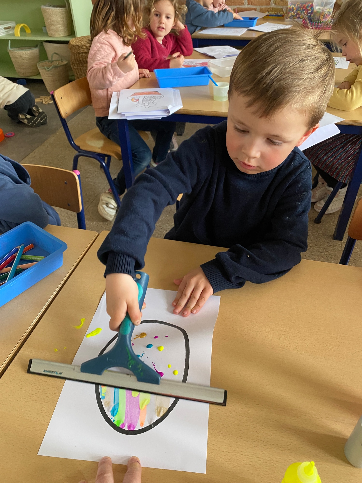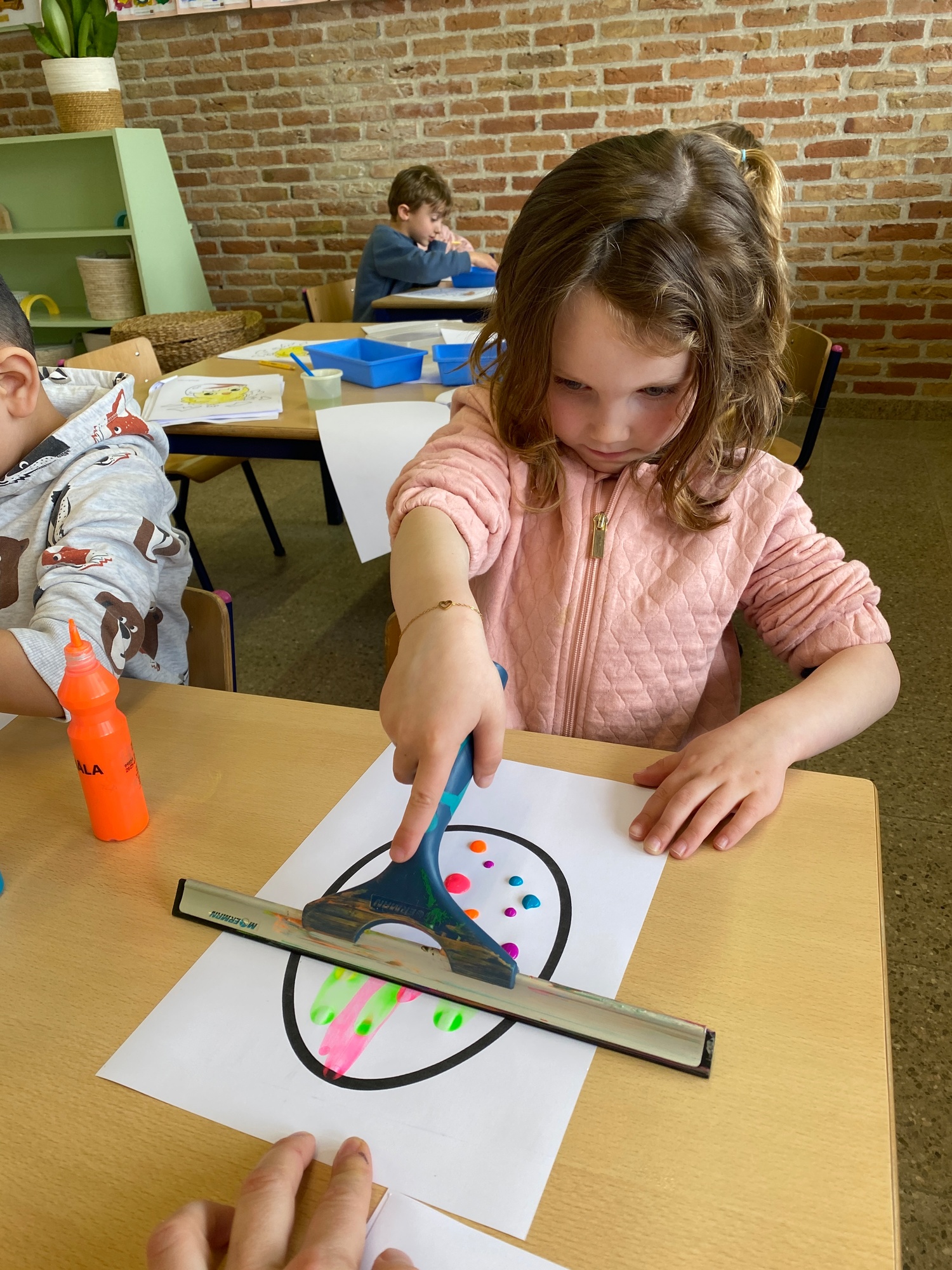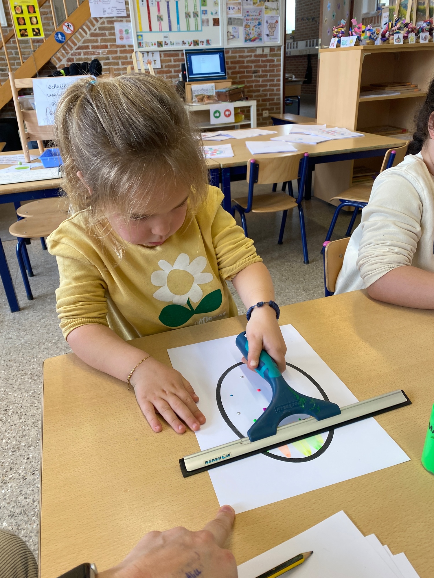 Wolken stempelen, eitjes versieren met stipjes verf en een trekkertje (Wat een mooi resultaat), kuikentje versieren, appel prikken, gras knippen...