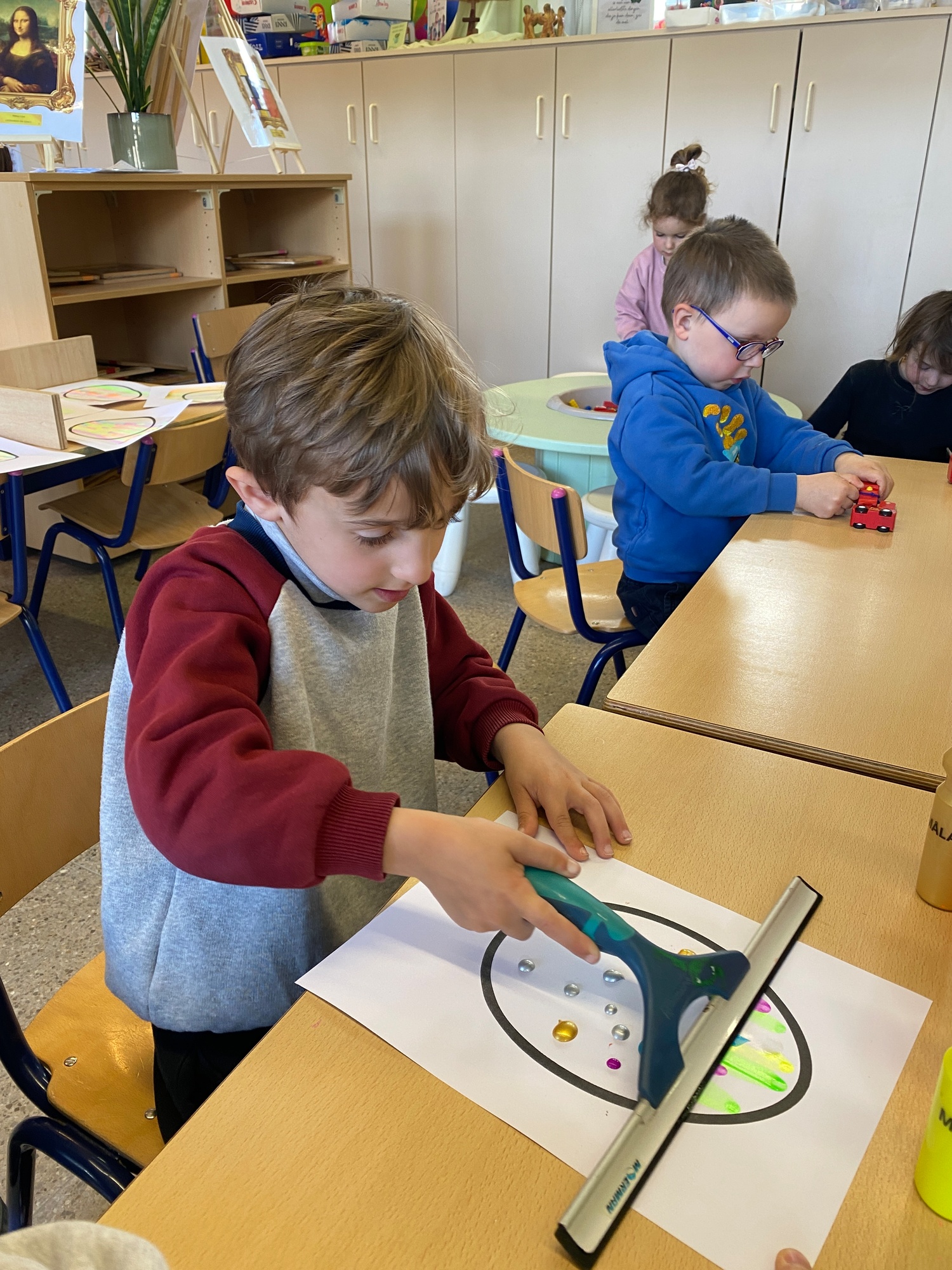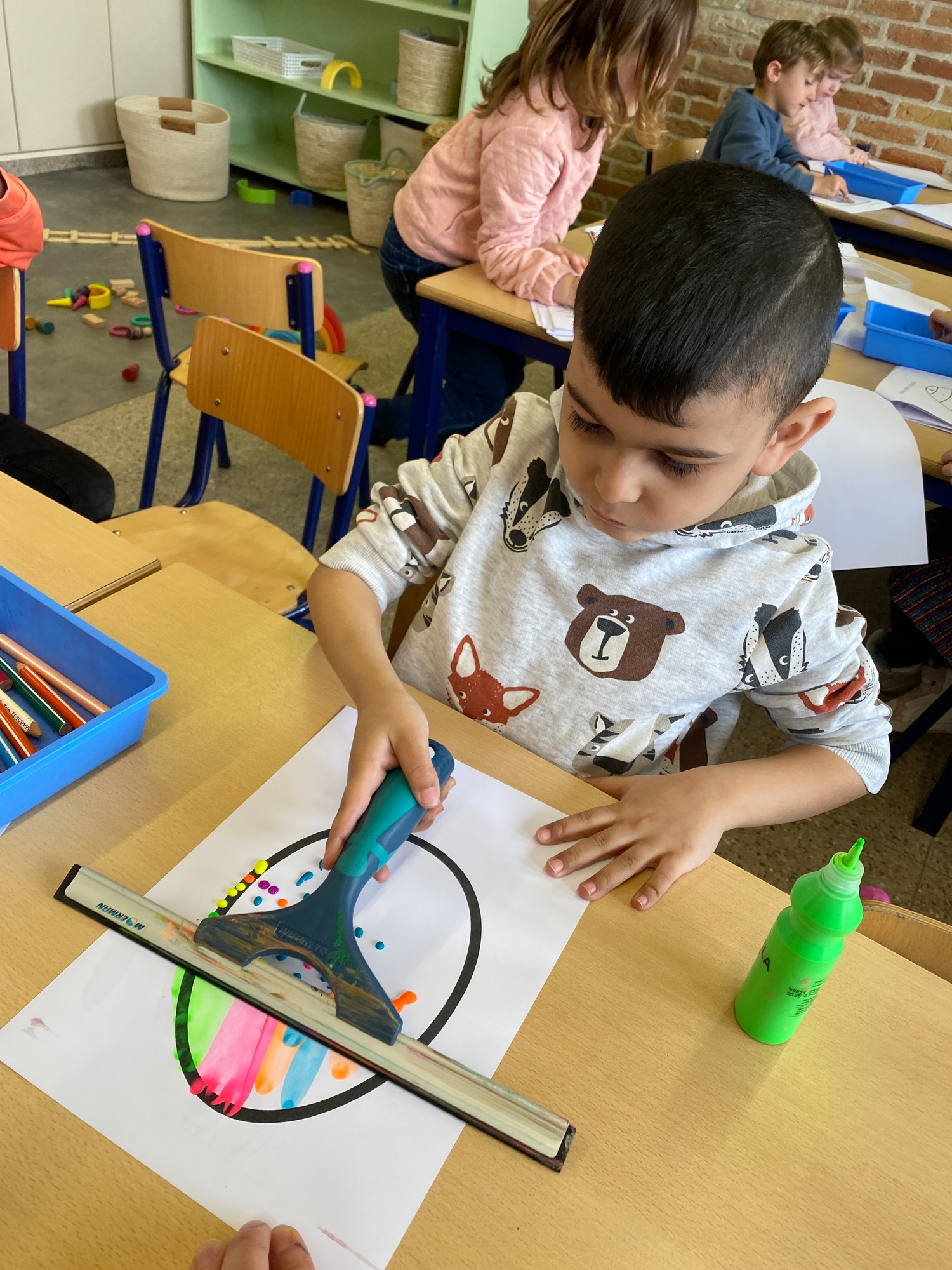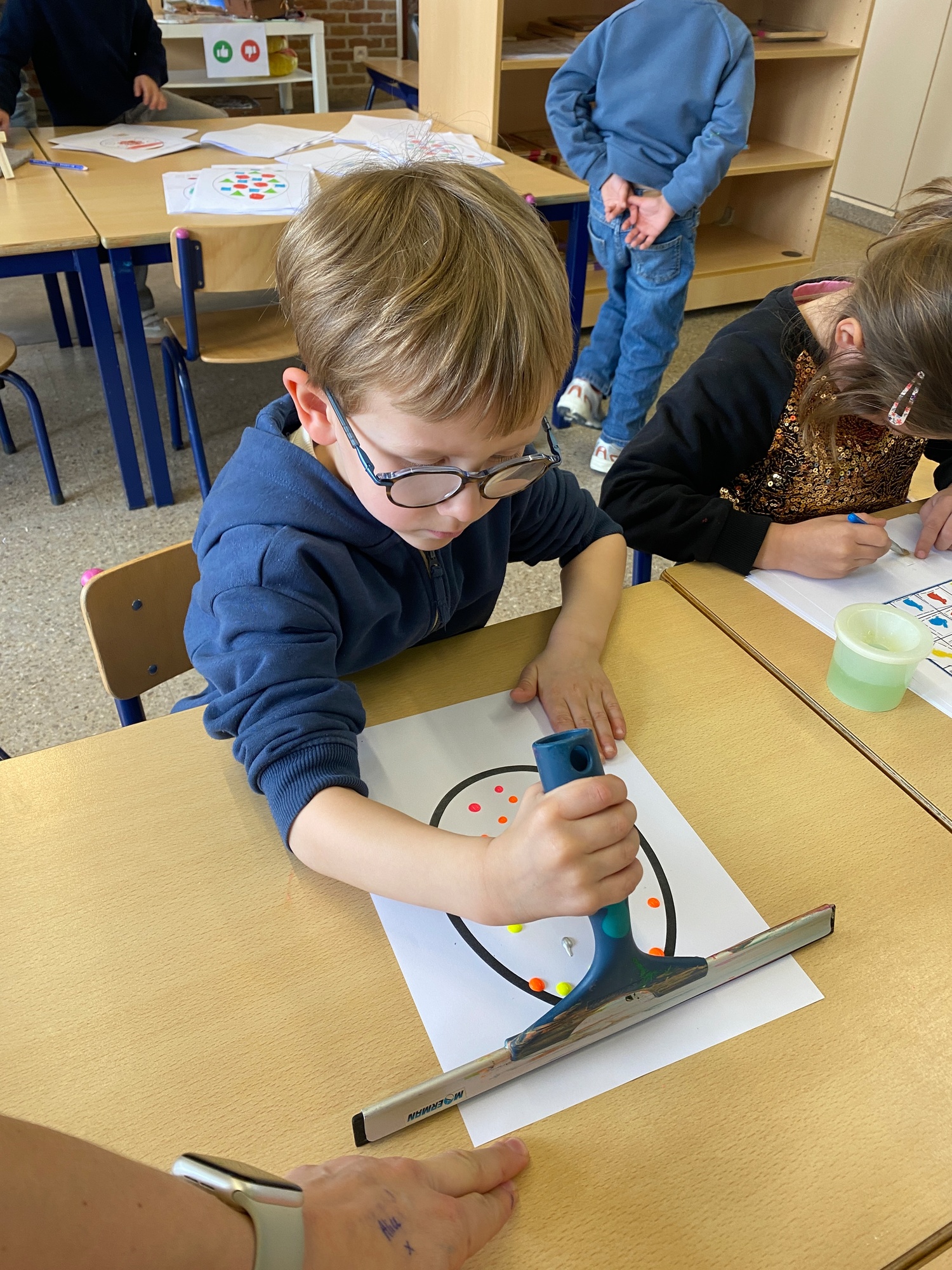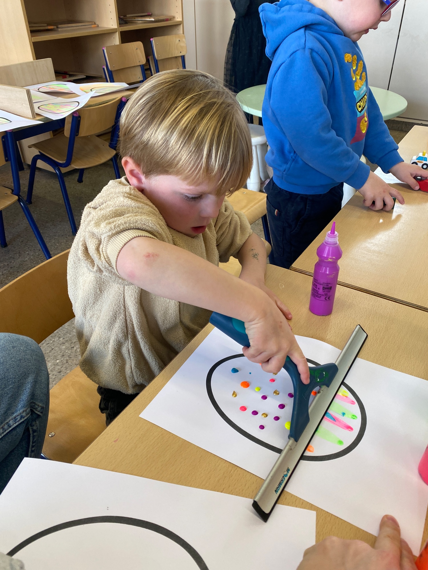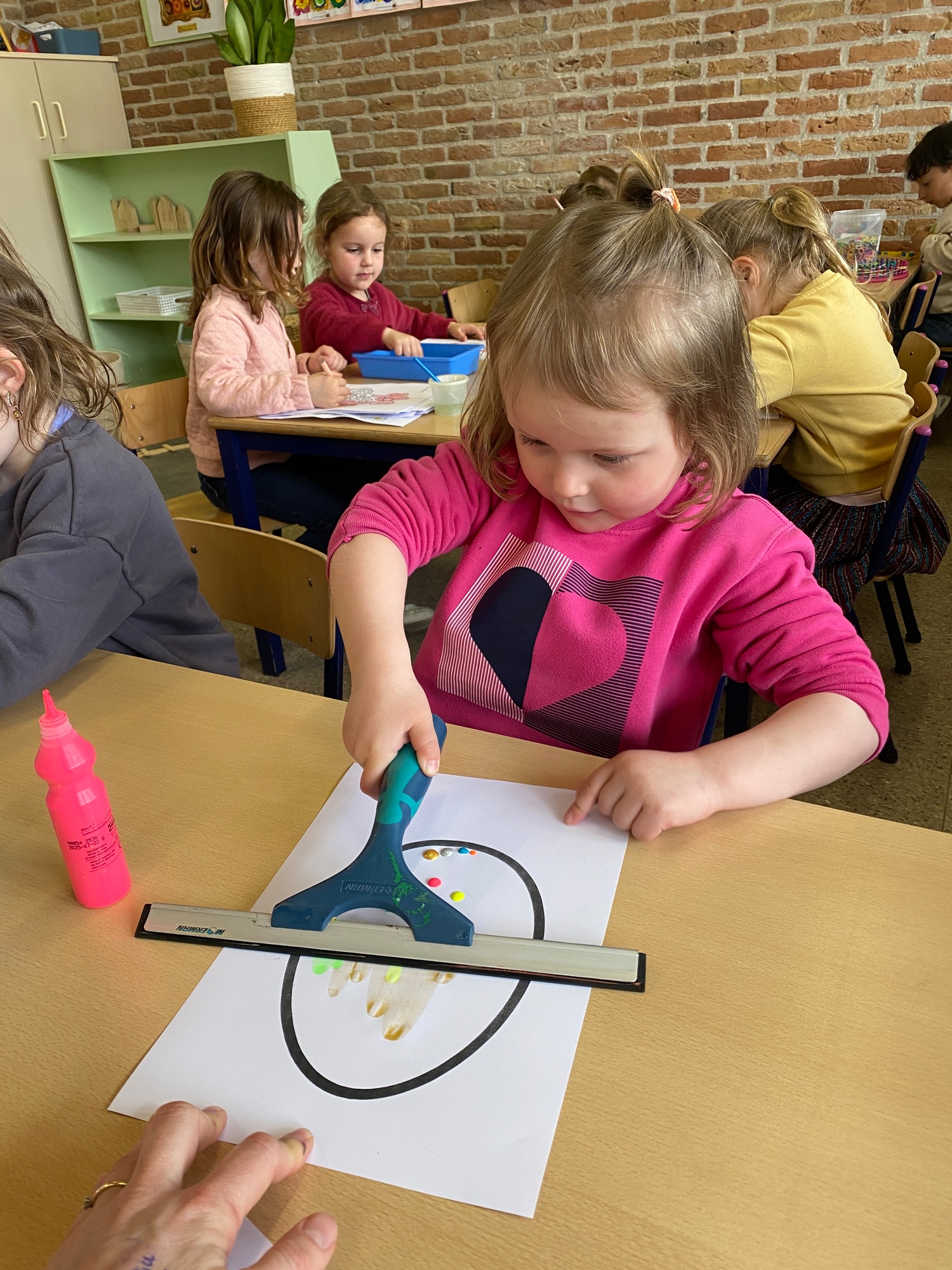 Wolken stempelen, eitjes versieren met stipjes verf en een trekkertje (Wat een mooi resultaat), kuikentje versieren, appel prikken, gras knippen...