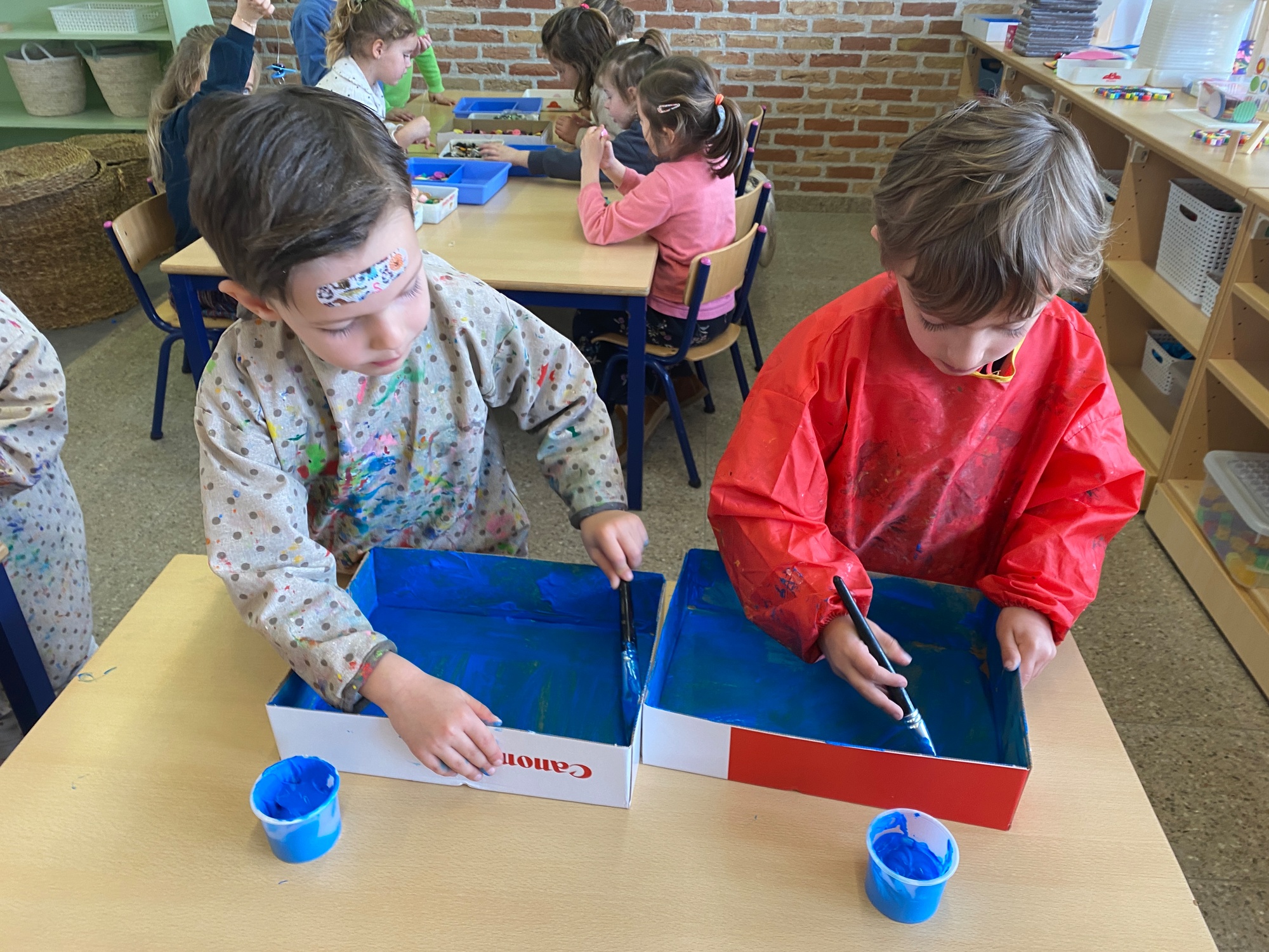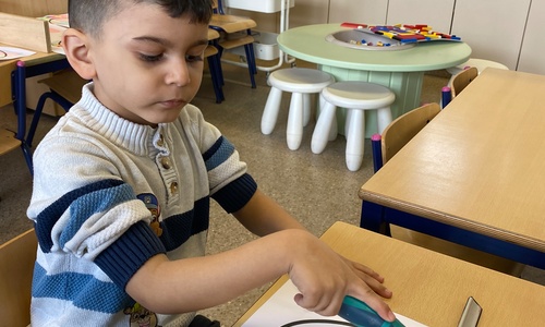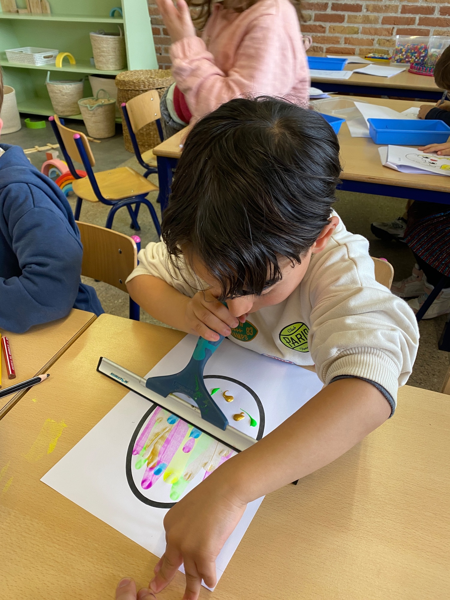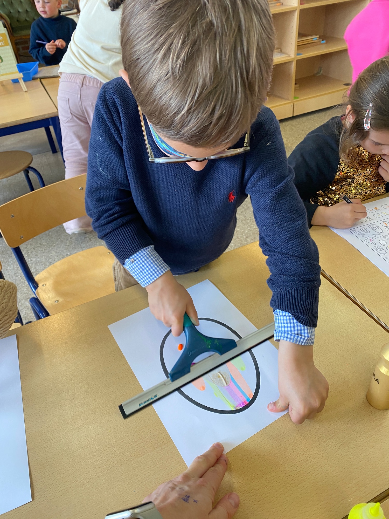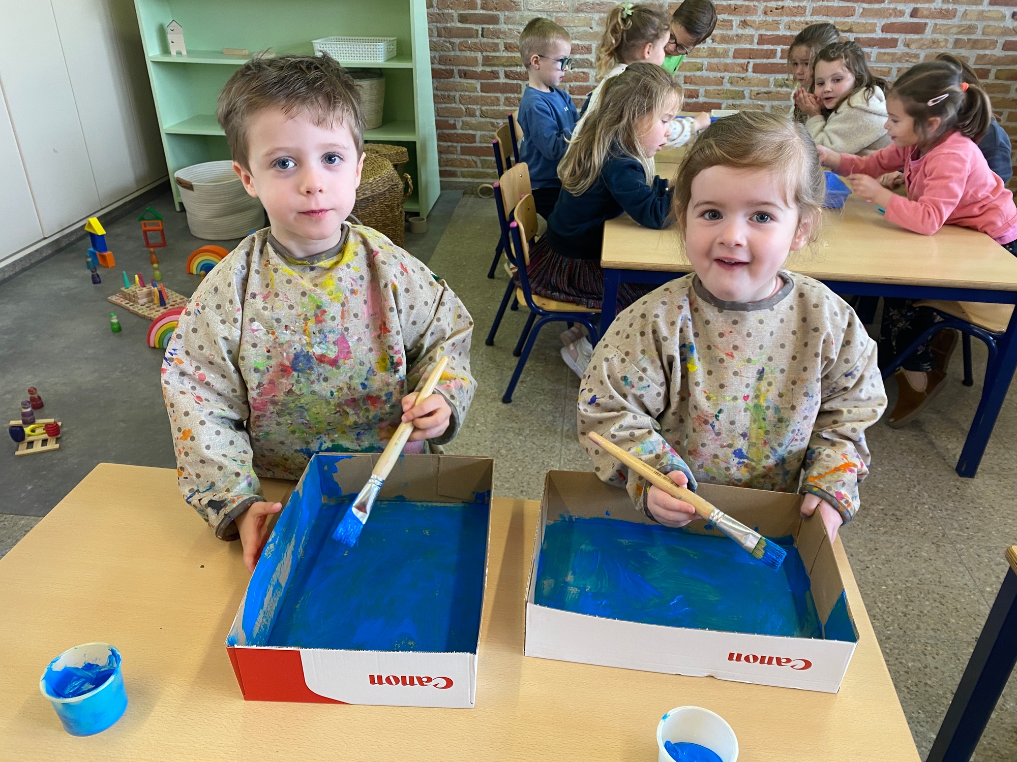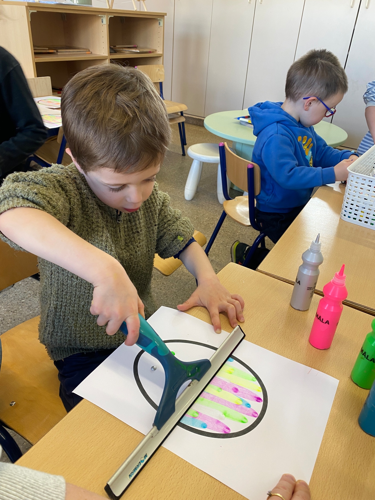 Wolken stempelen, eitjes versieren met stipjes verf en een trekkertje (Wat een mooi resultaat), kuikentje versieren, appel prikken, gras knippen...