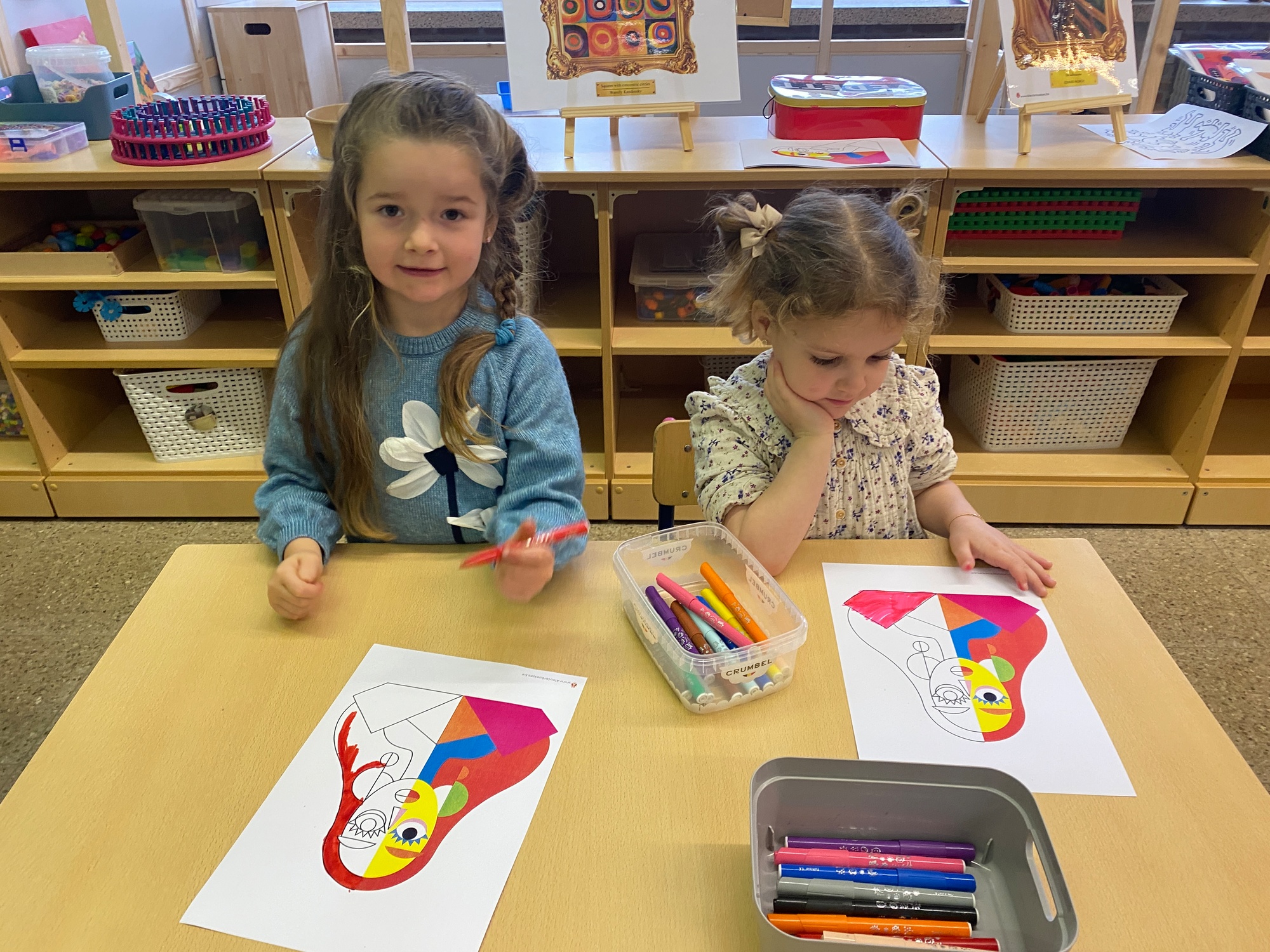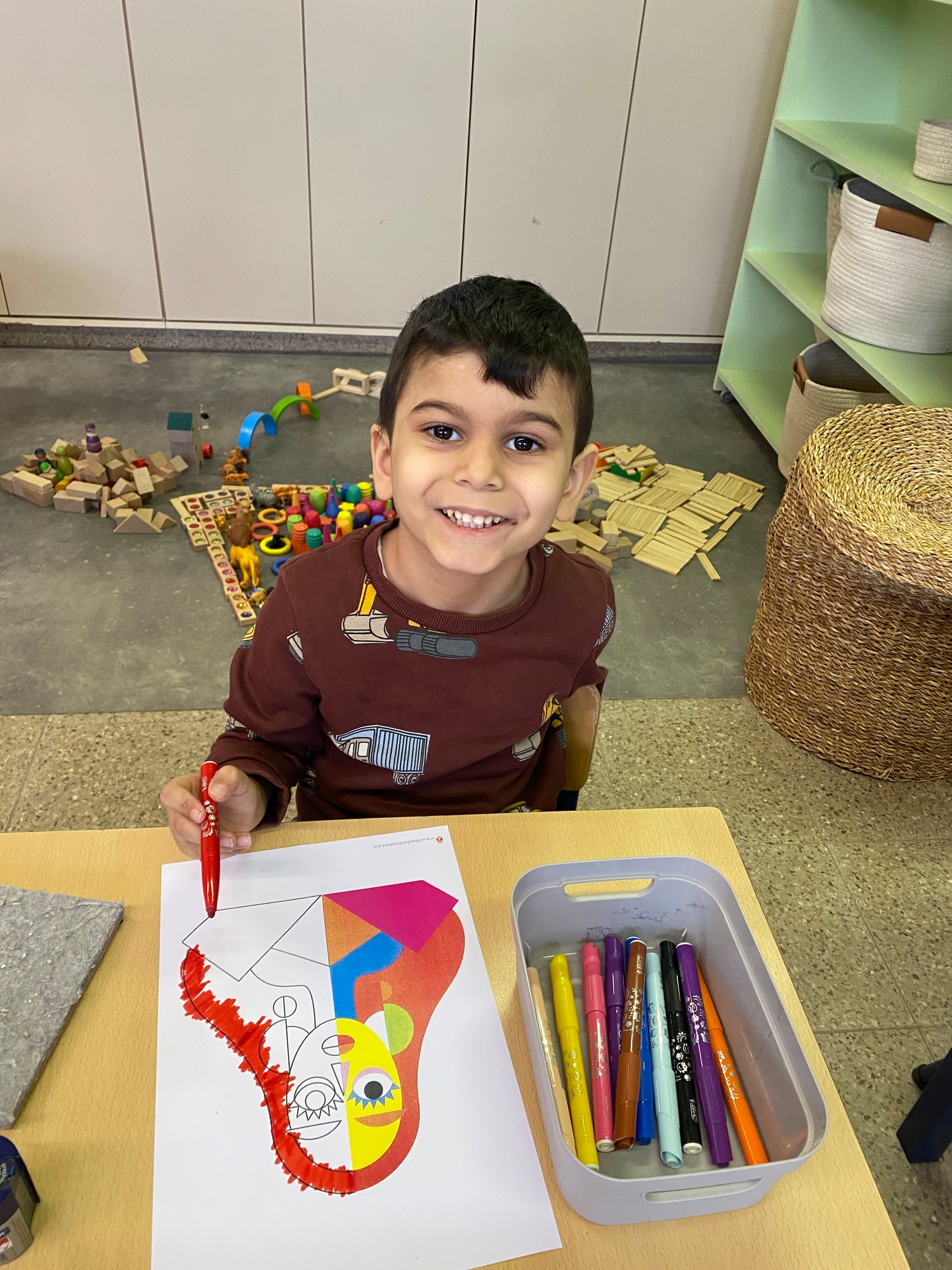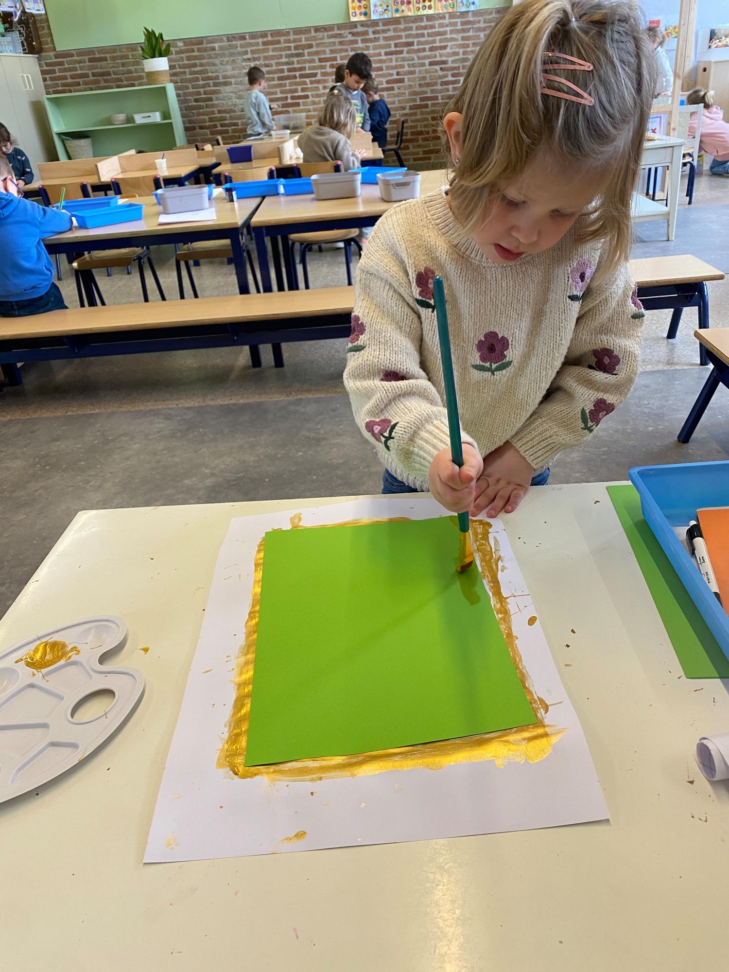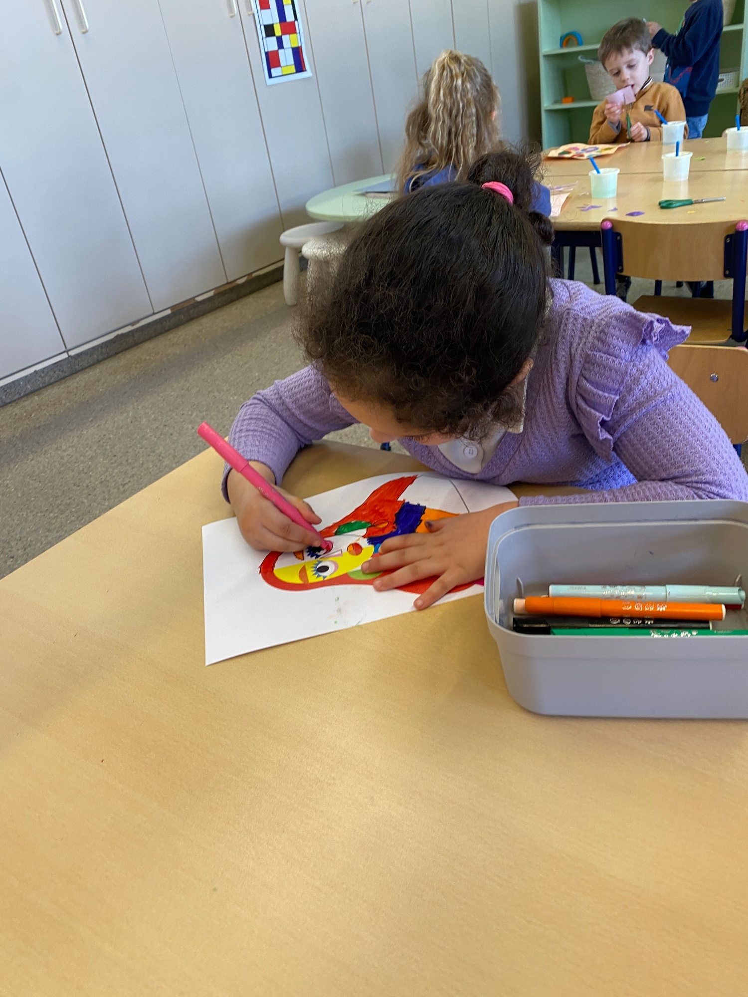 We spiegelden een beeld met stift. Een gek gezicht zoals Picasso maakte. Met een gouden lijst is het een prachtig werkje!