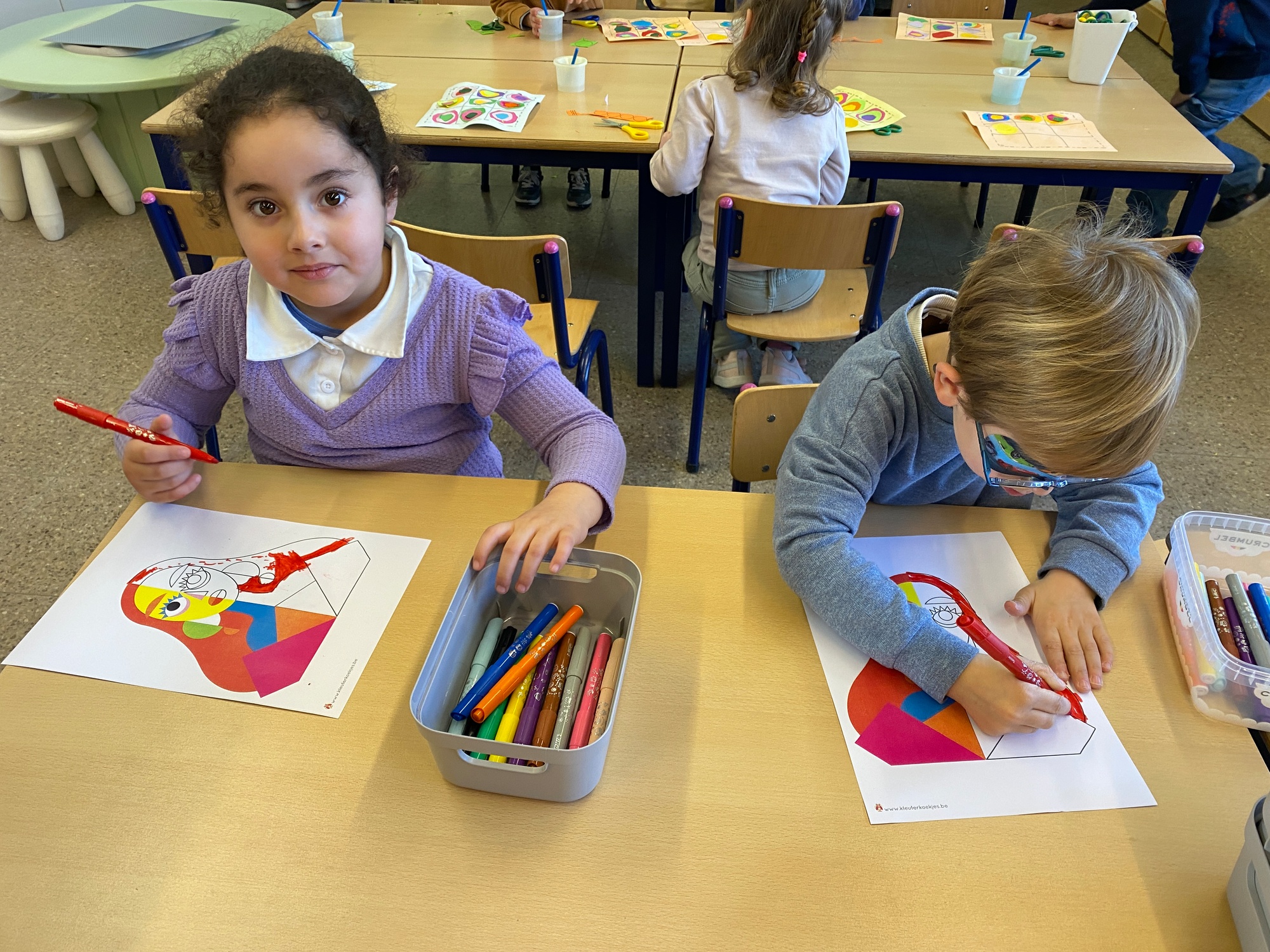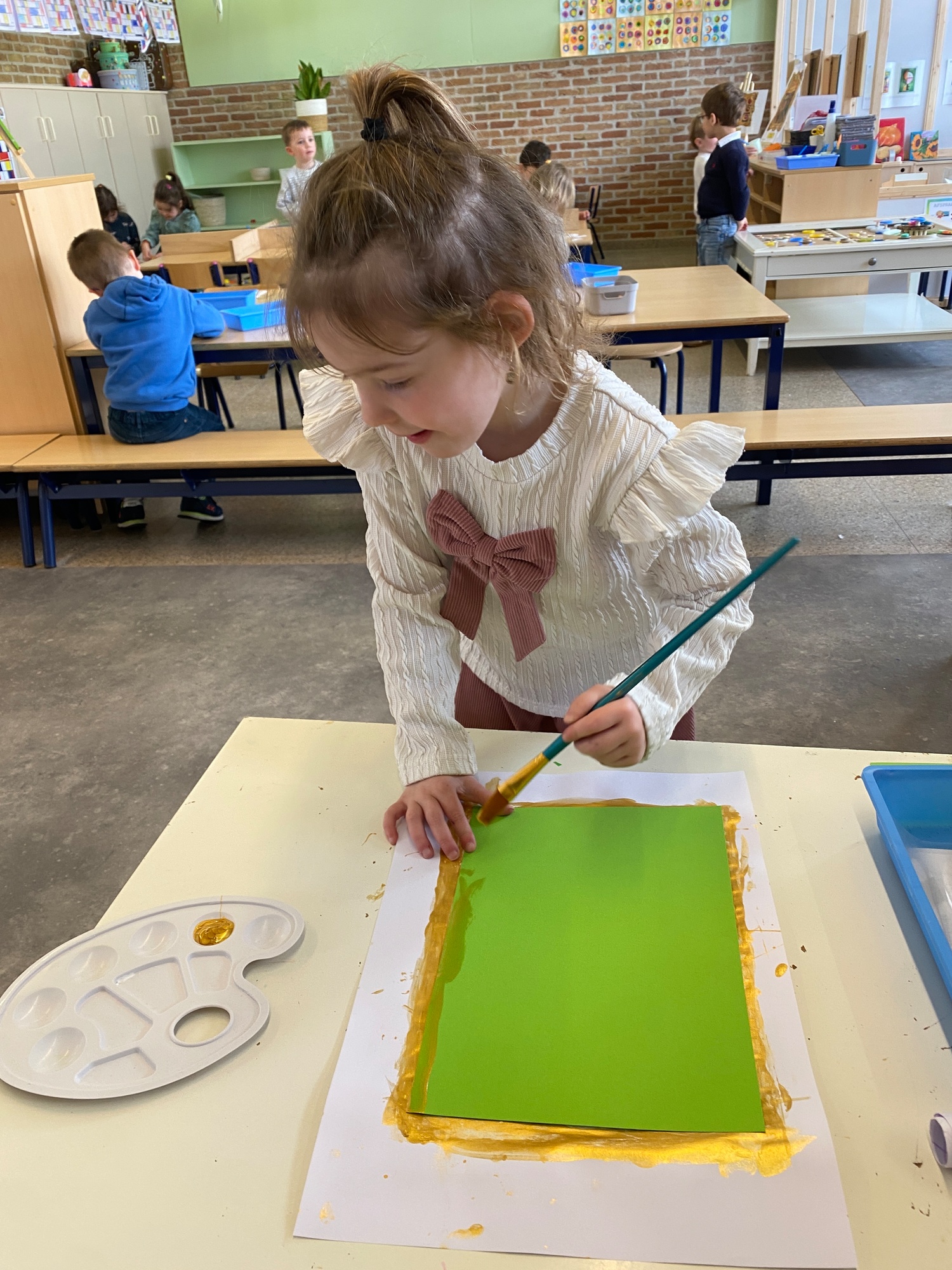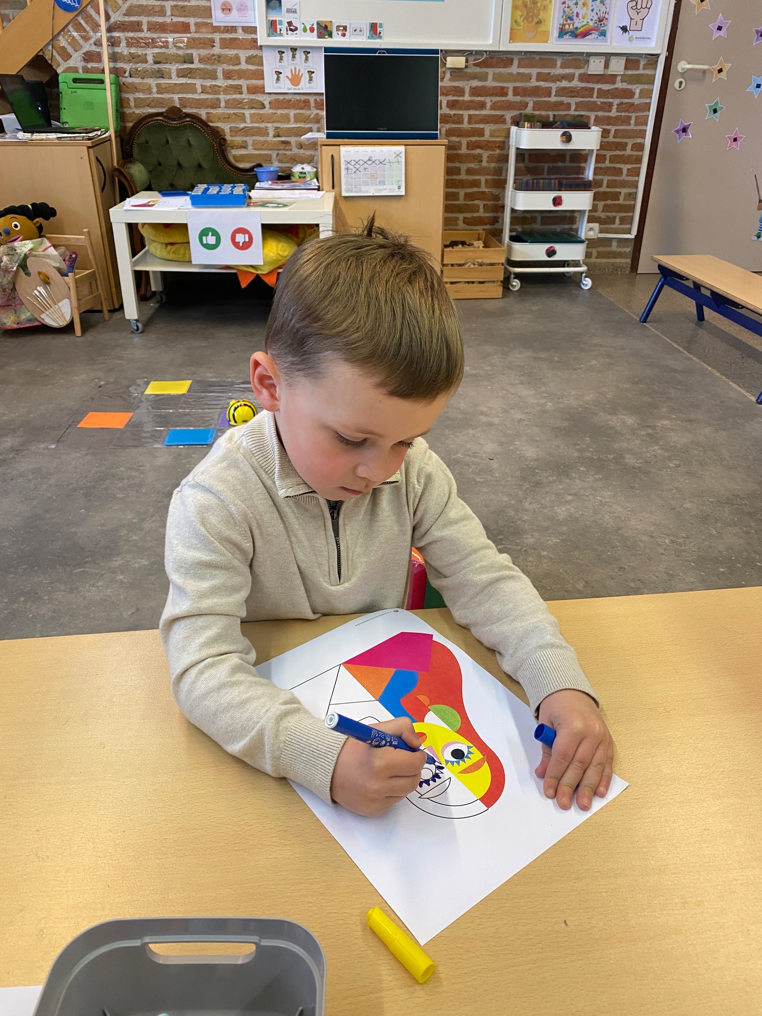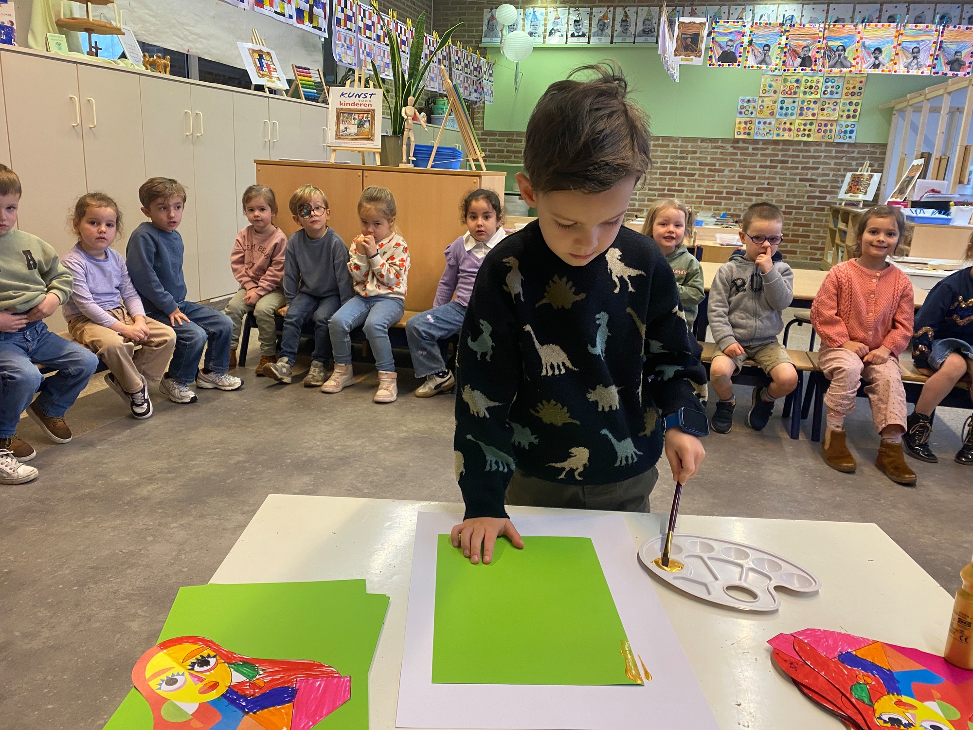 We spiegelden een beeld met stift. Een gek gezicht zoals Picasso maakte. Met een gouden lijst is het een prachtig werkje!