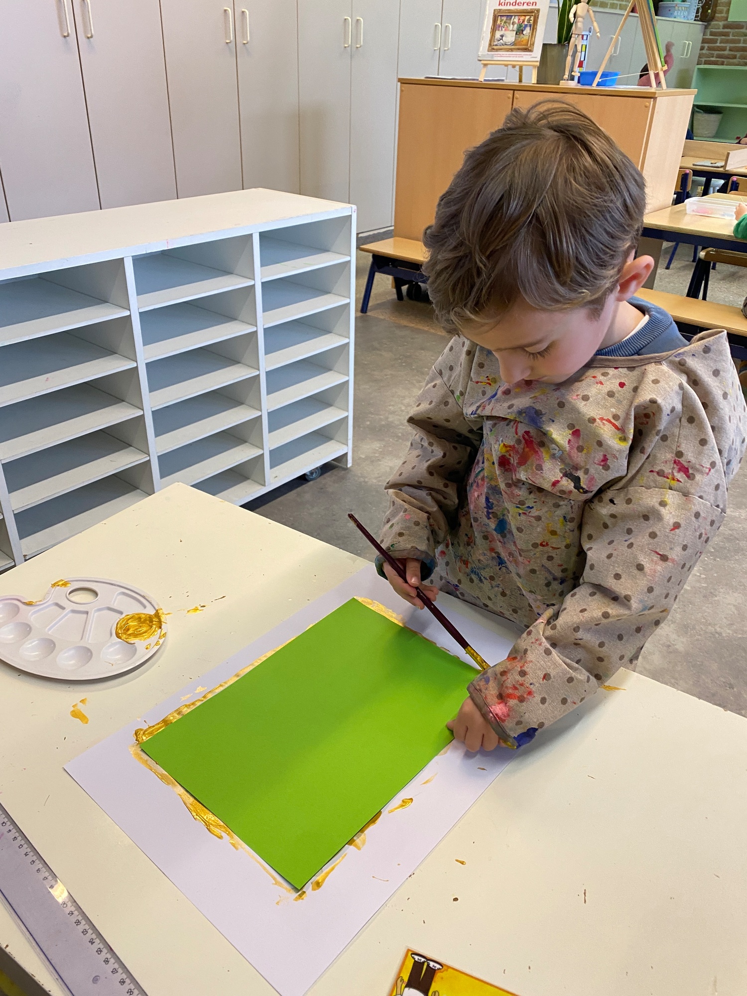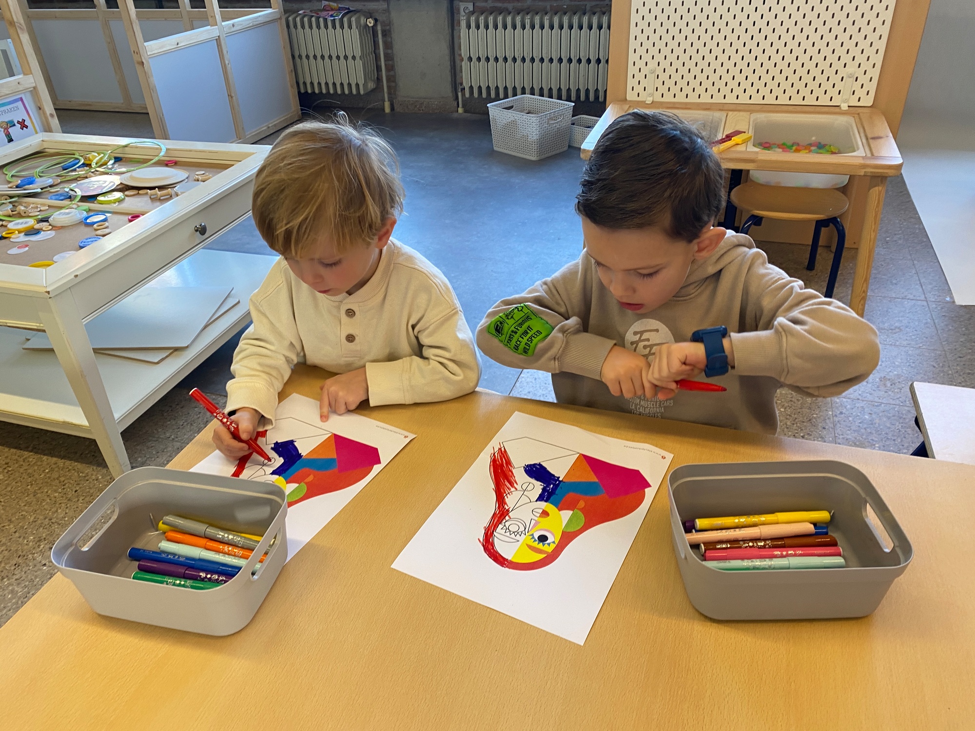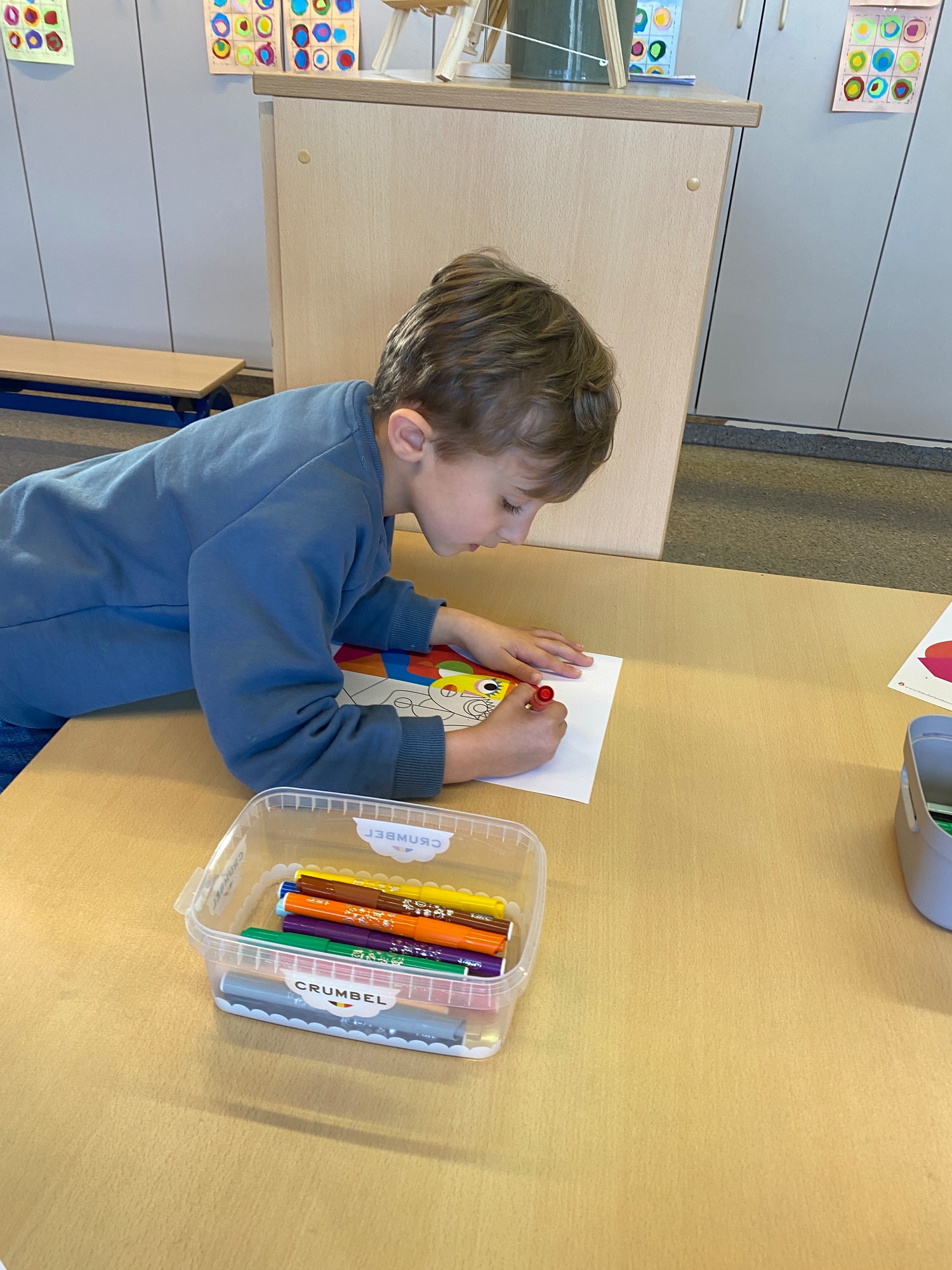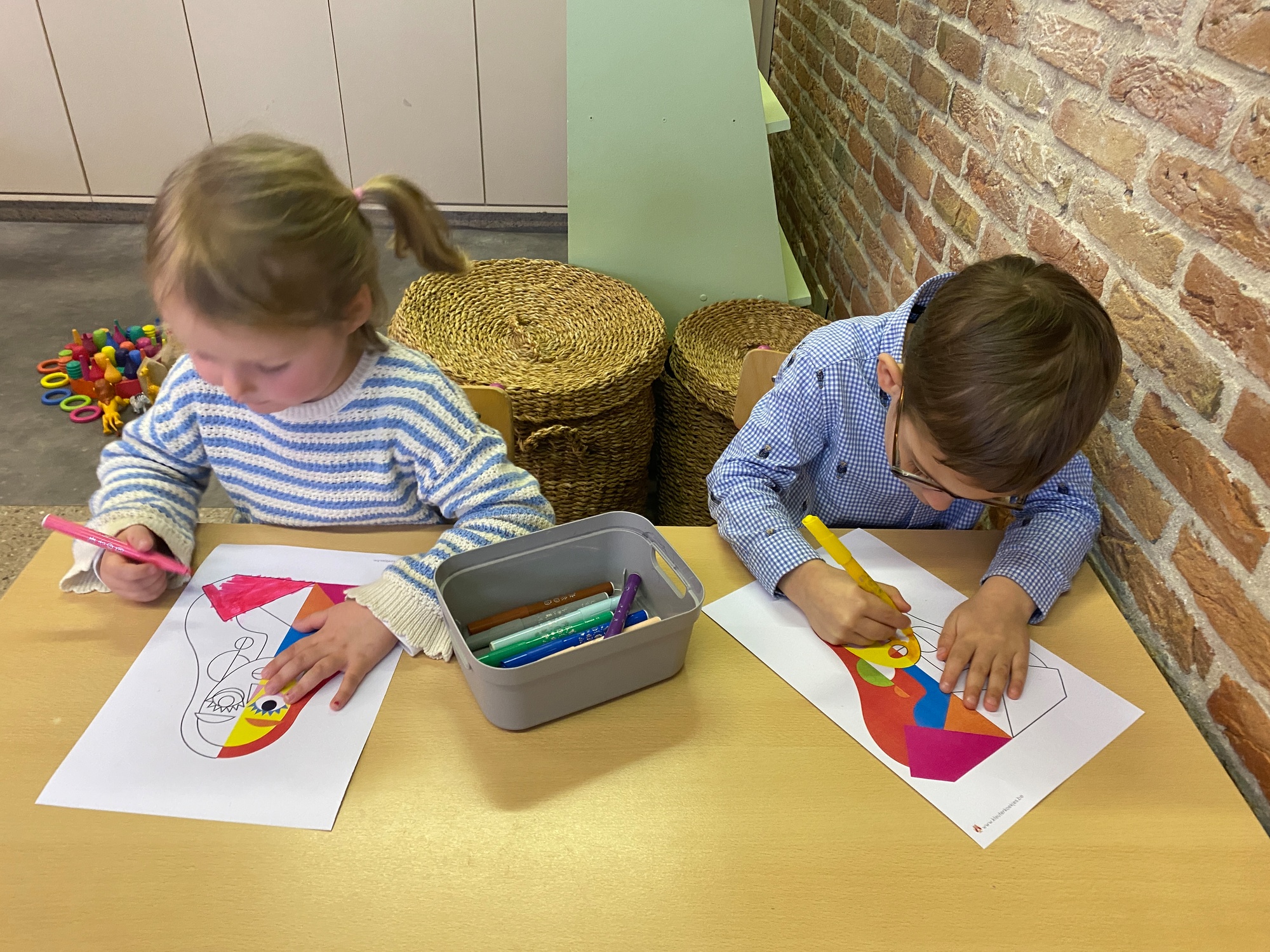 We spiegelden een beeld met stift. Een gek gezicht zoals Picasso maakte. Met een gouden lijst is het een prachtig werkje!