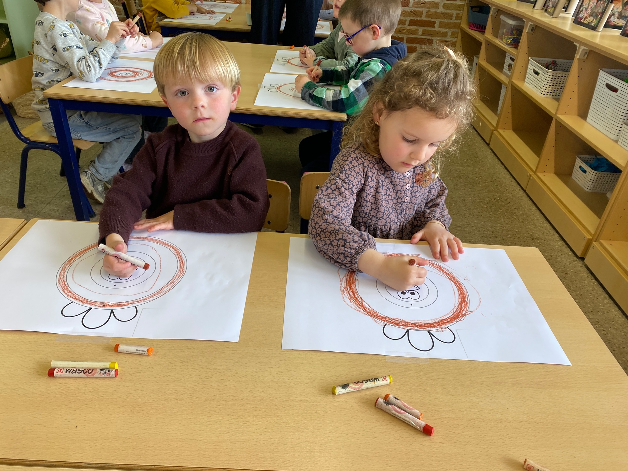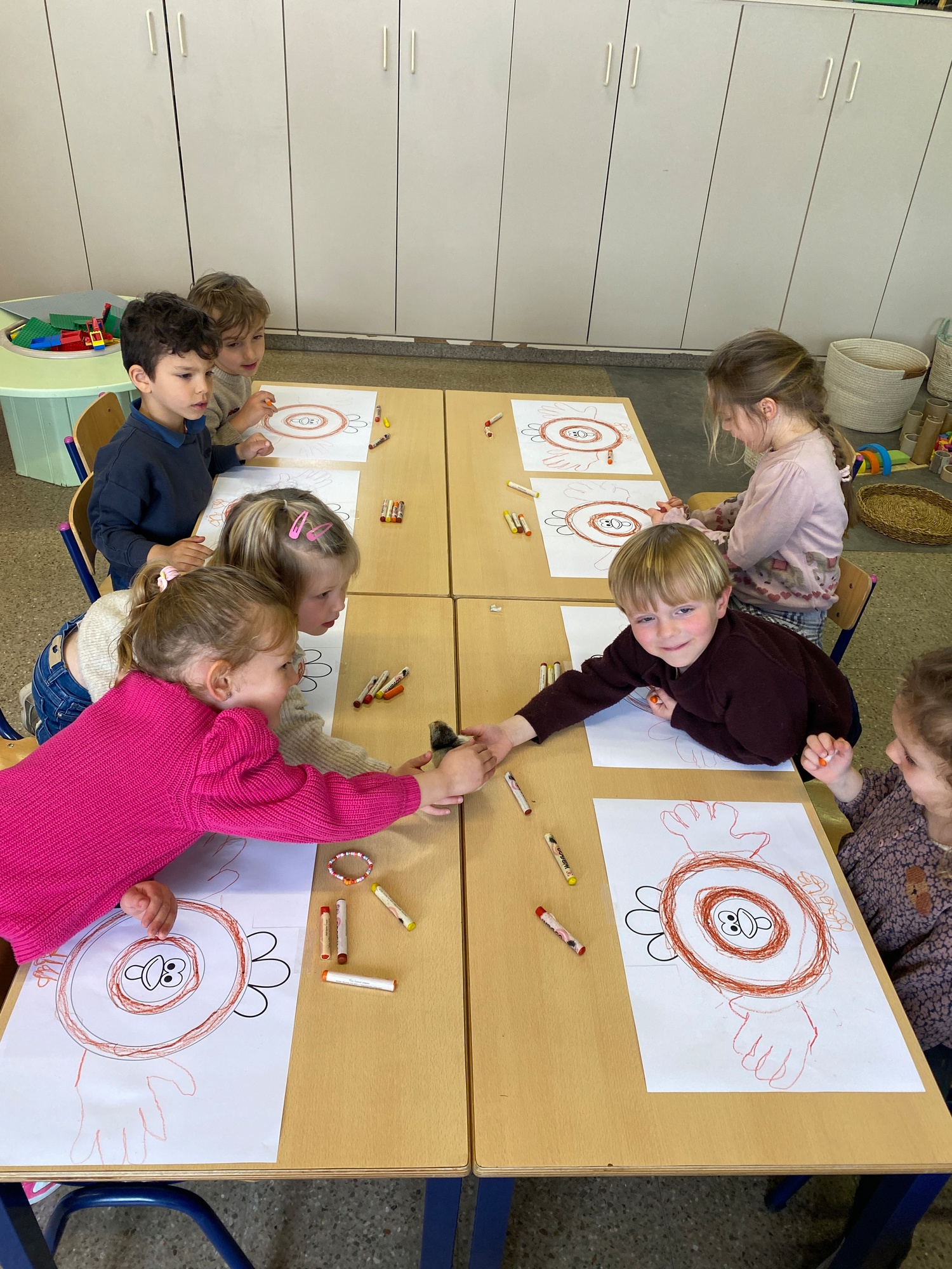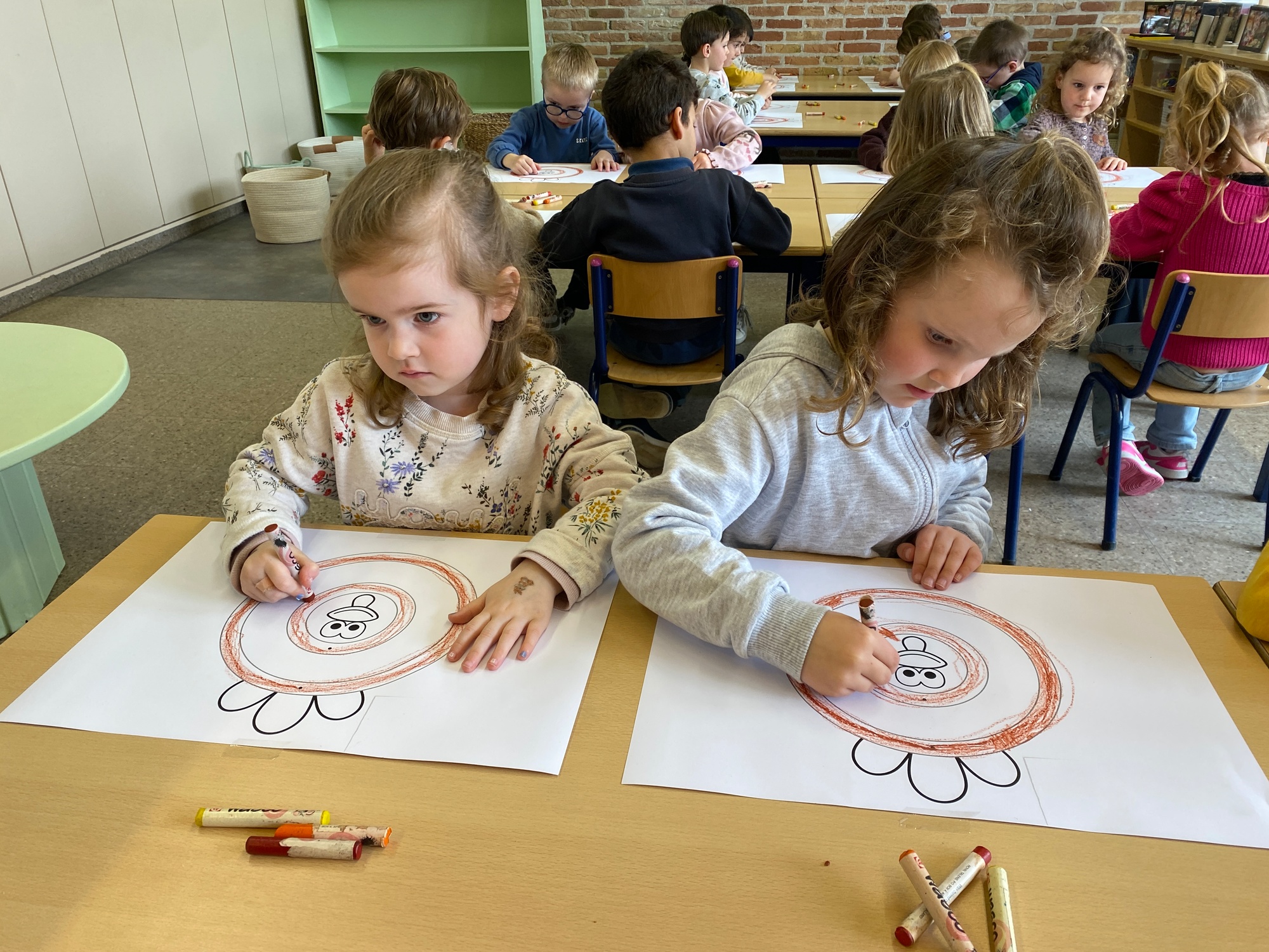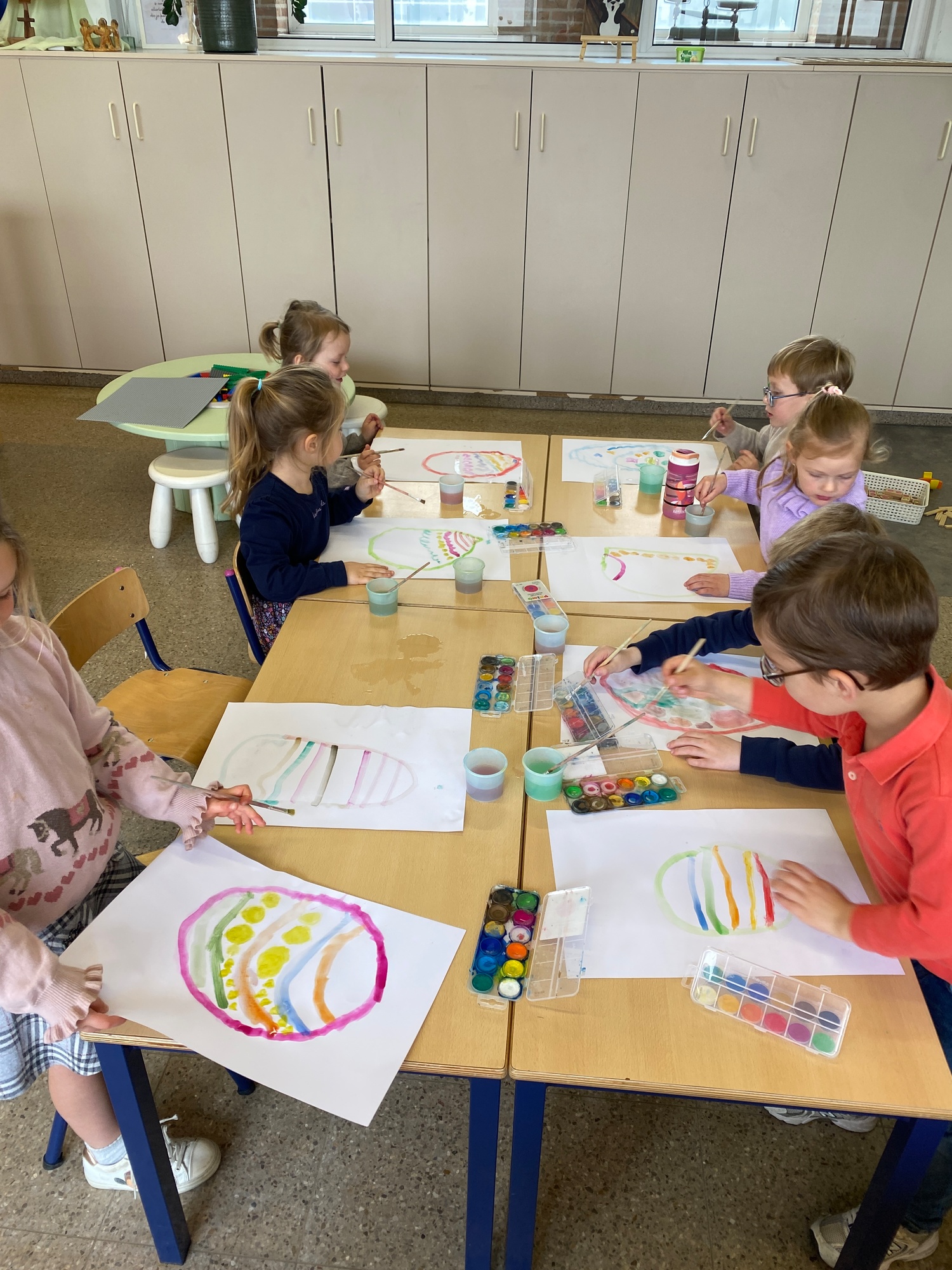 We tekenden een kip. Wat zien jullie bij het kuikentje op tafel? Teken maar na. We schilderden een ei. Net zoals Poelette in het boekje: 'Het allereerste ei.' probeerden we het mooiste ei te versieren. Werden het mooie eitjes?