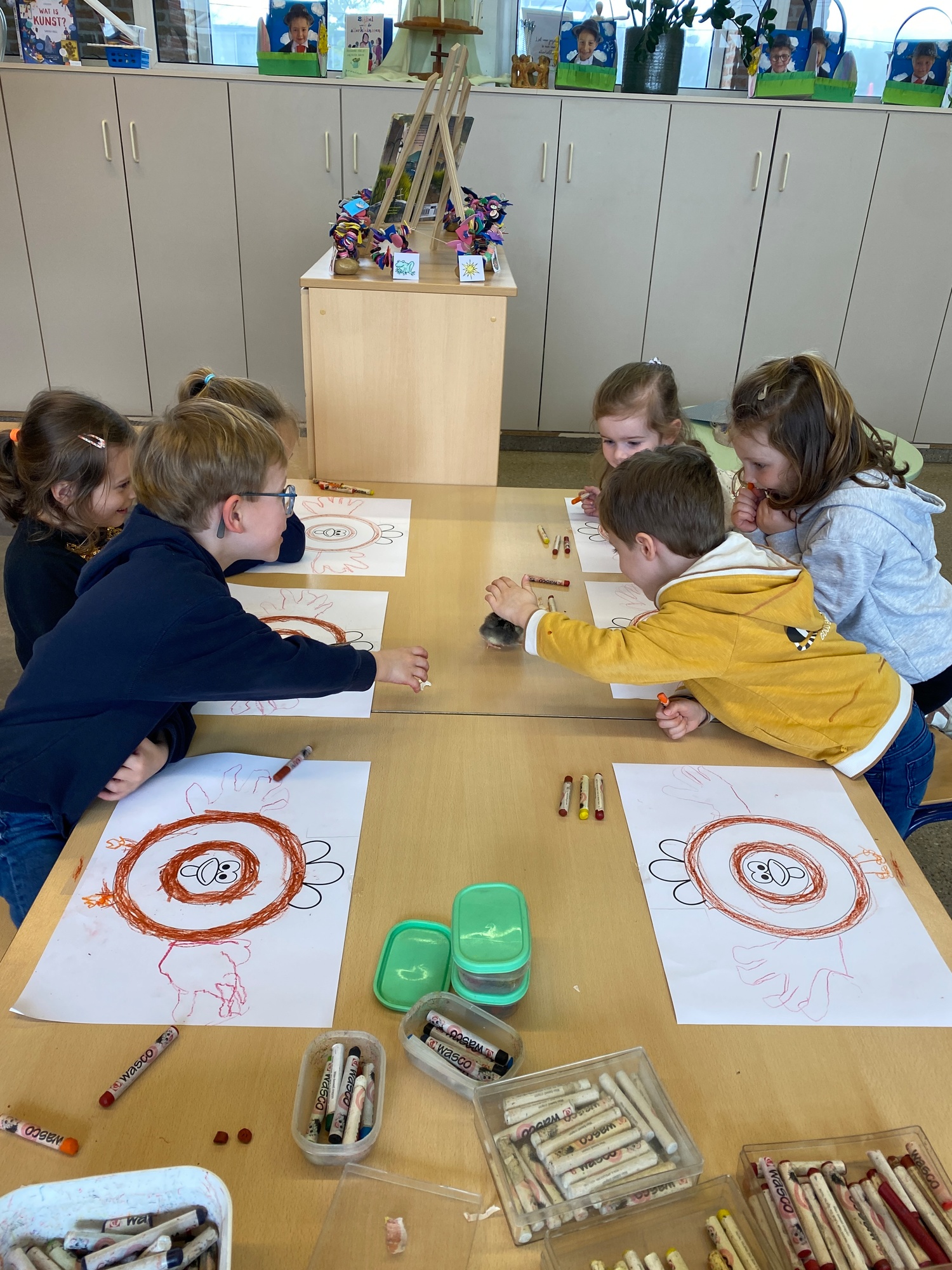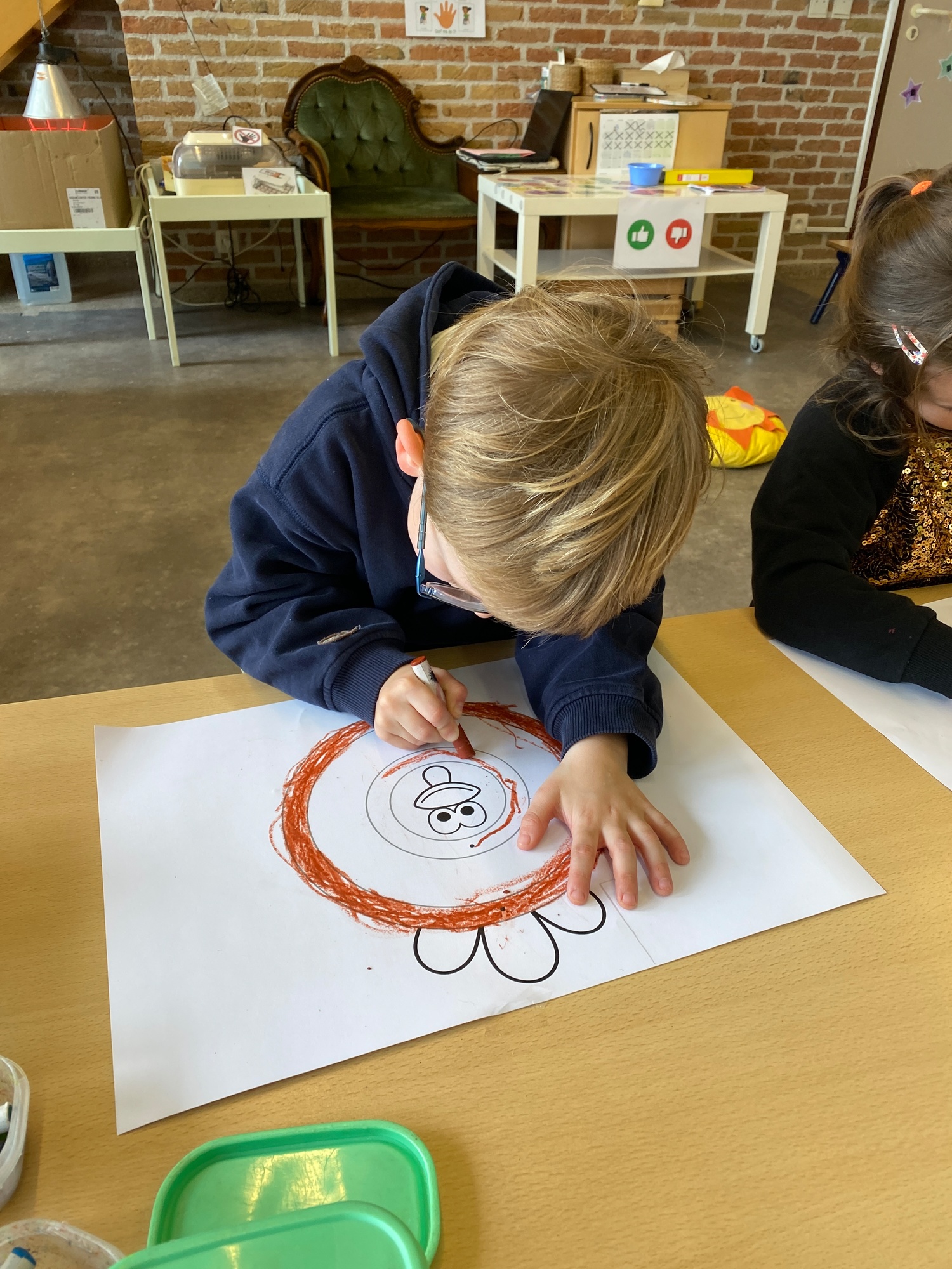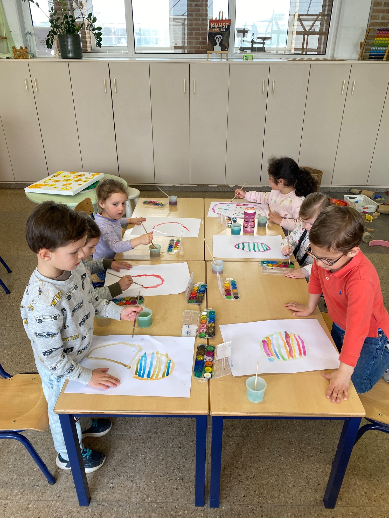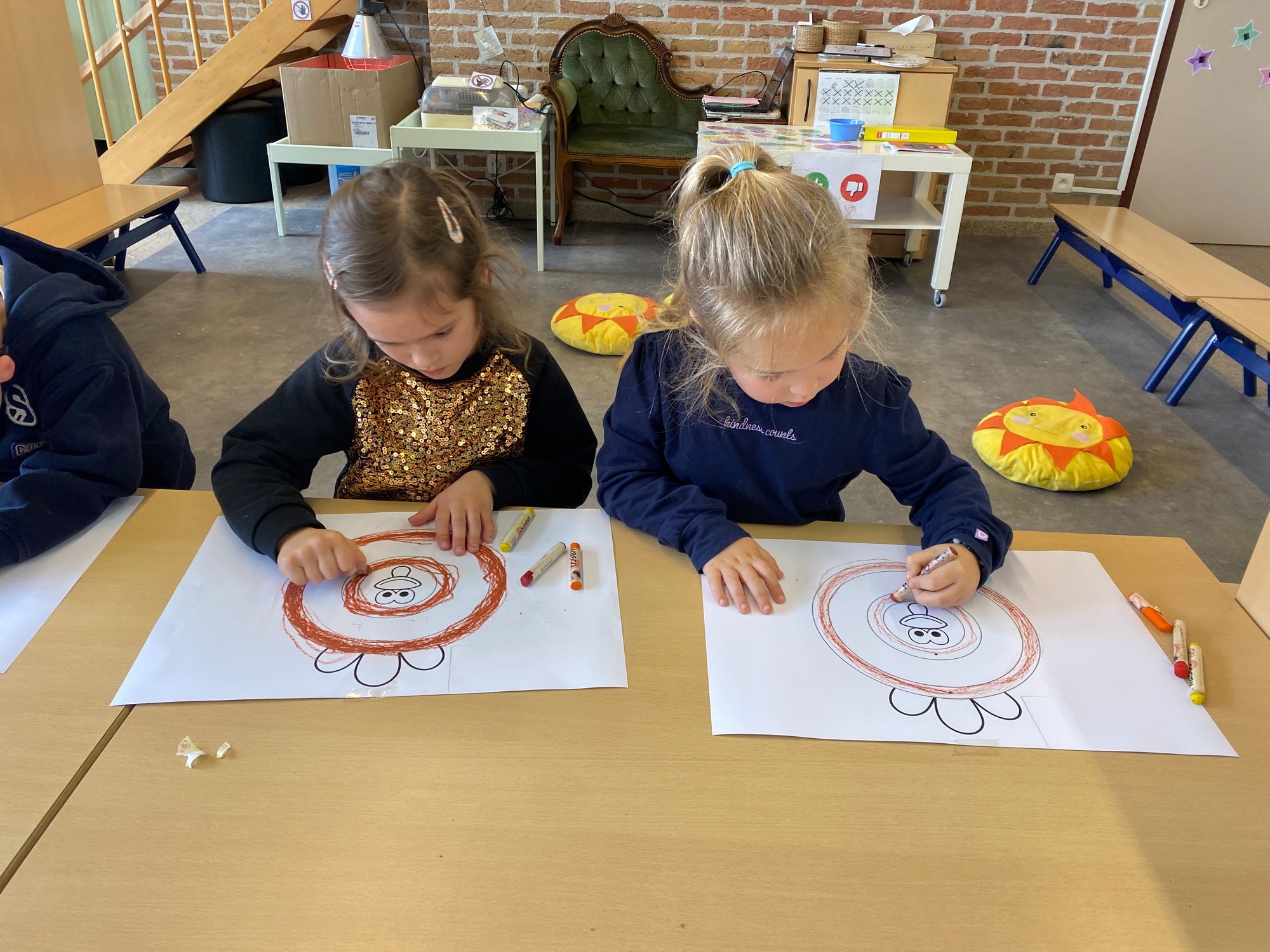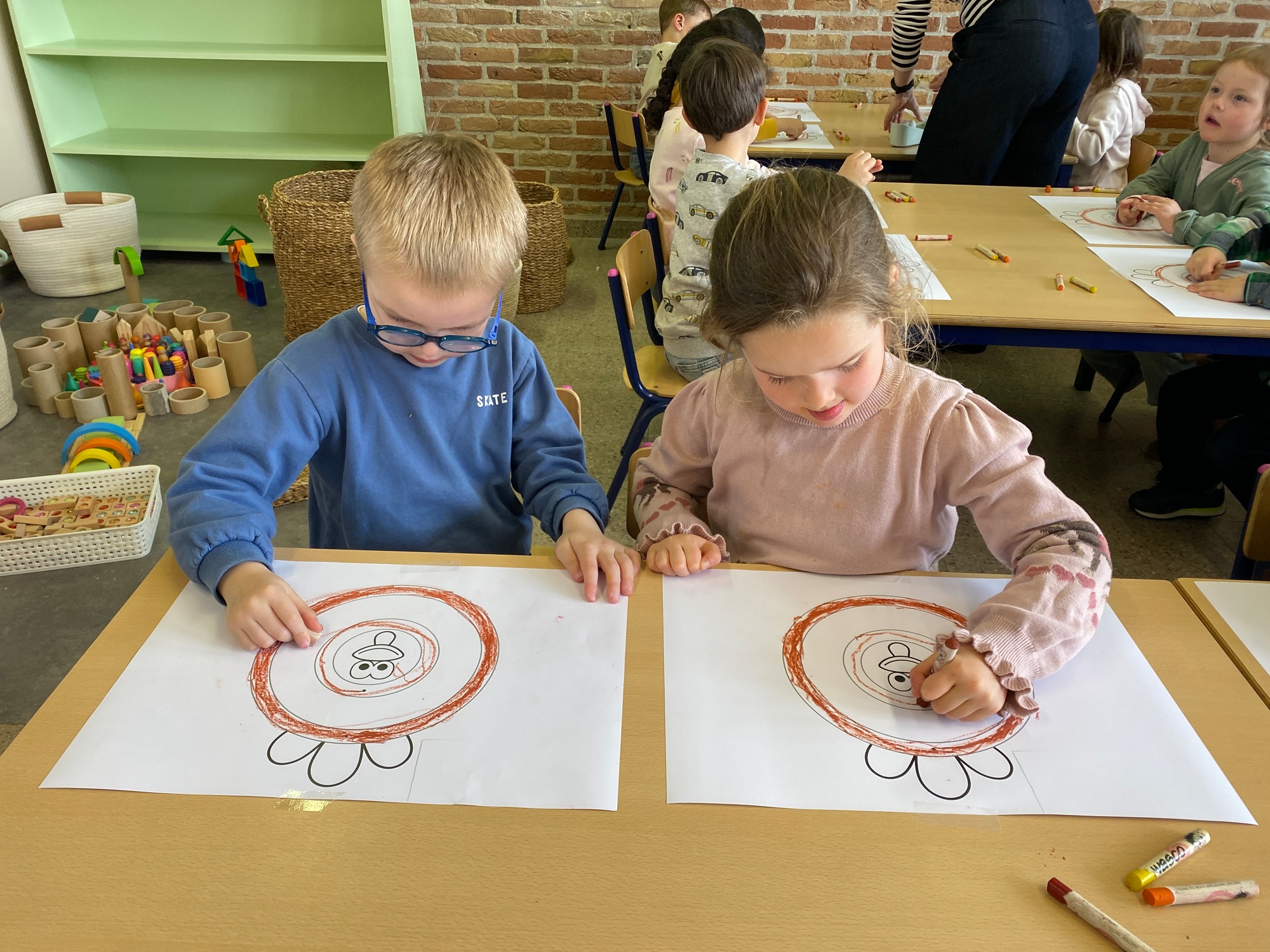 We tekenden een kip. Wat zien jullie bij het kuikentje op tafel? Teken maar na. We schilderden een ei. Net zoals Poelette in het boekje: 'Het allereerste ei.' probeerden we het mooiste ei te versieren. Werden het mooie eitjes?