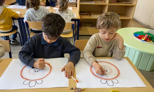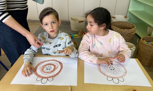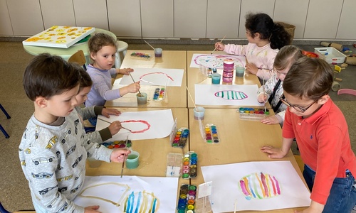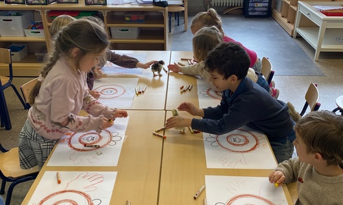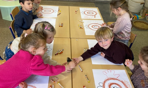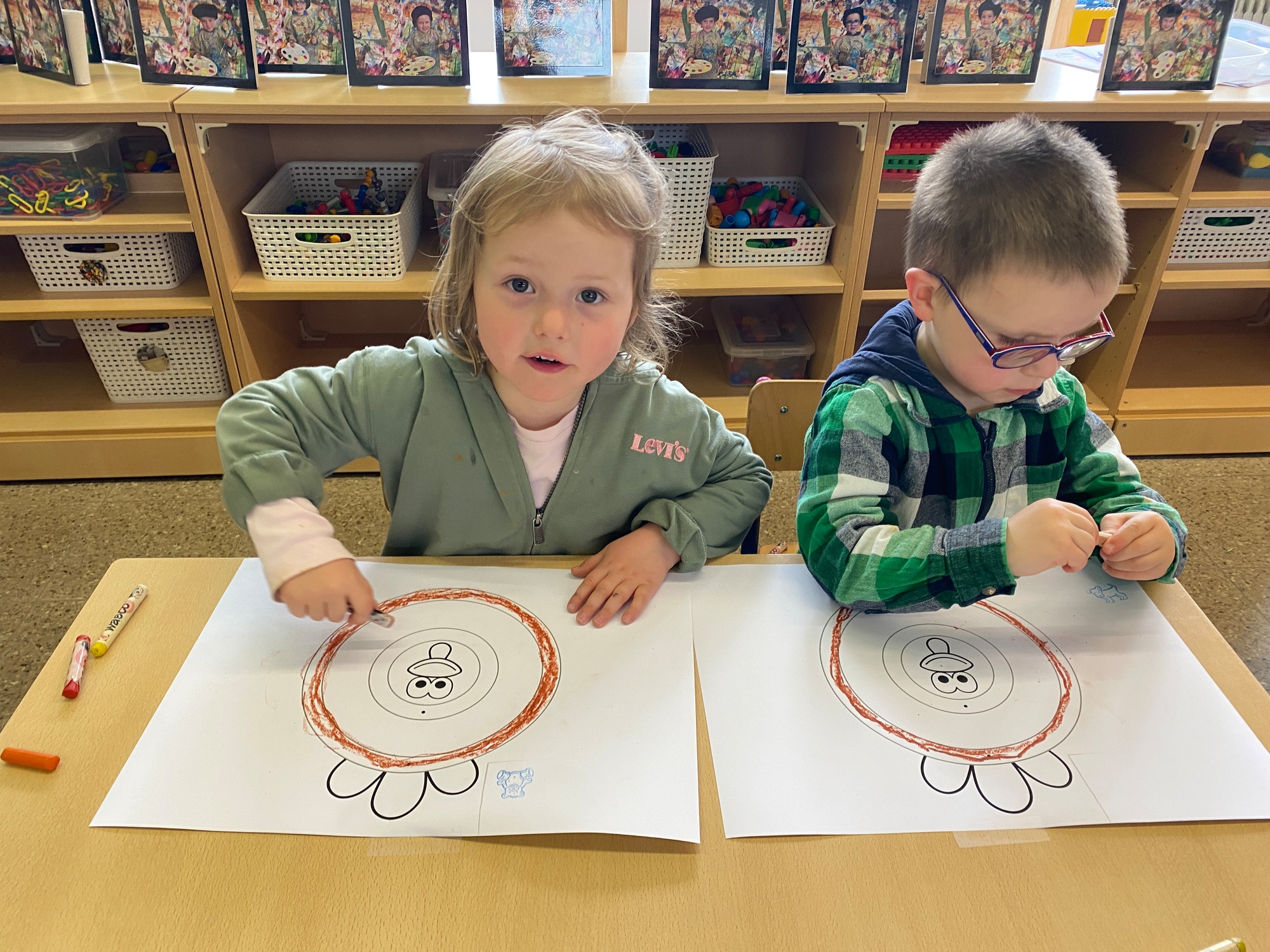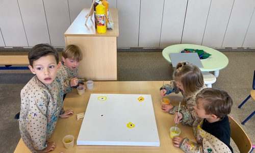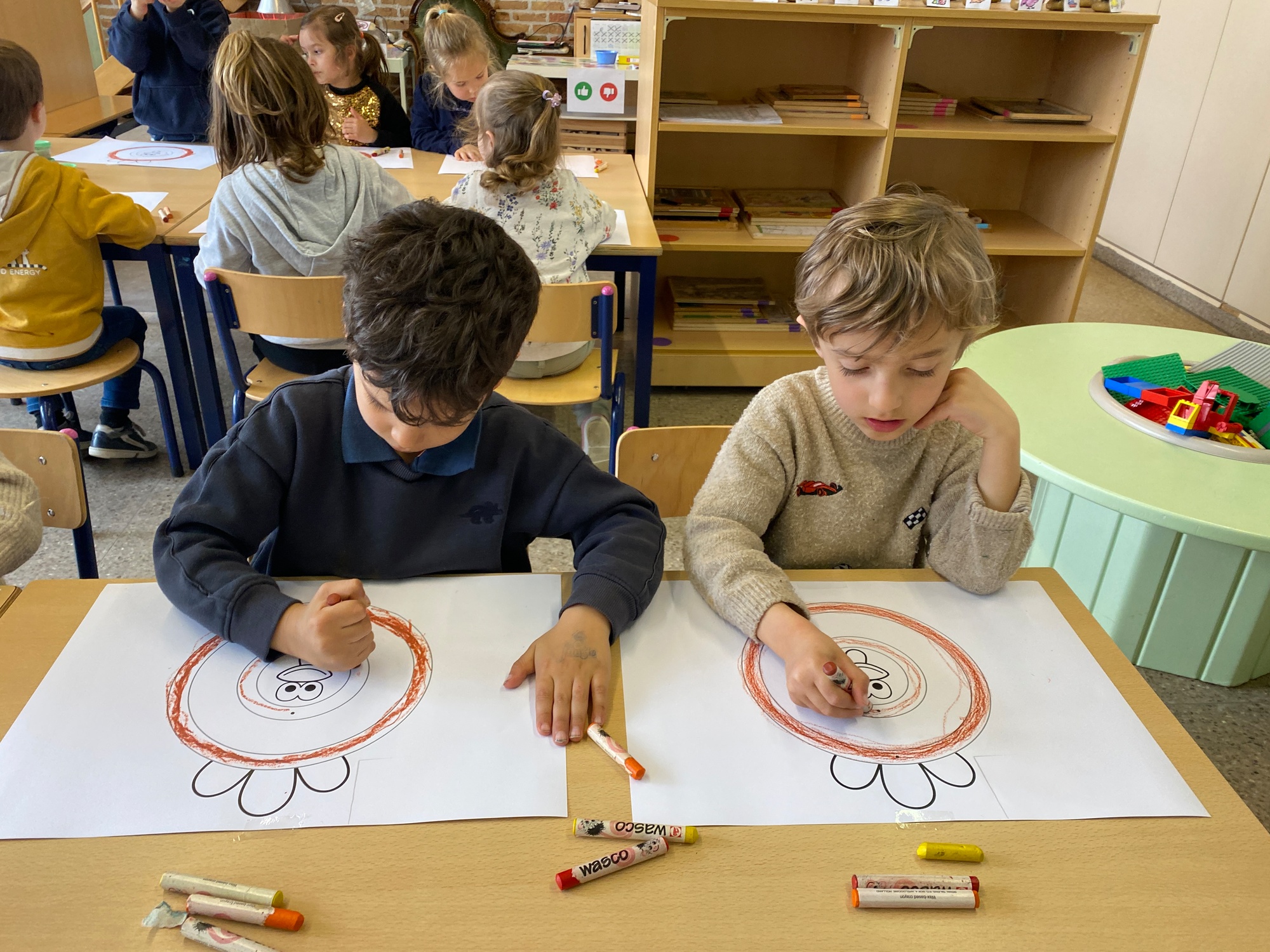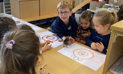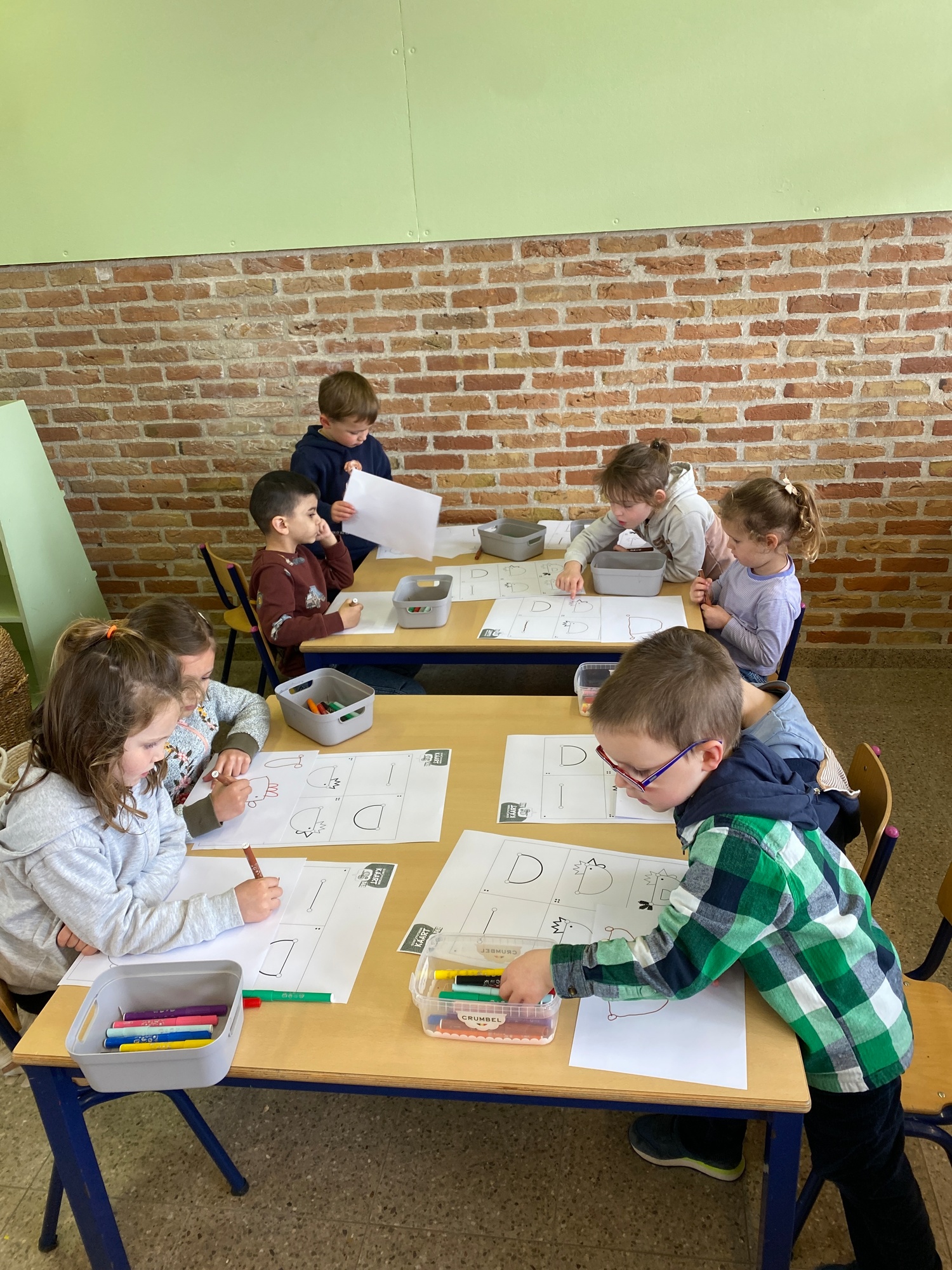 We tekenden een kip. Wat zien jullie bij het kuikentje op tafel? Teken maar na. We schilderden een ei. Net zoals Poelette in het boekje: 'Het allereerste ei.' probeerden we het mooiste ei te versieren. Werden het mooie eitjes?