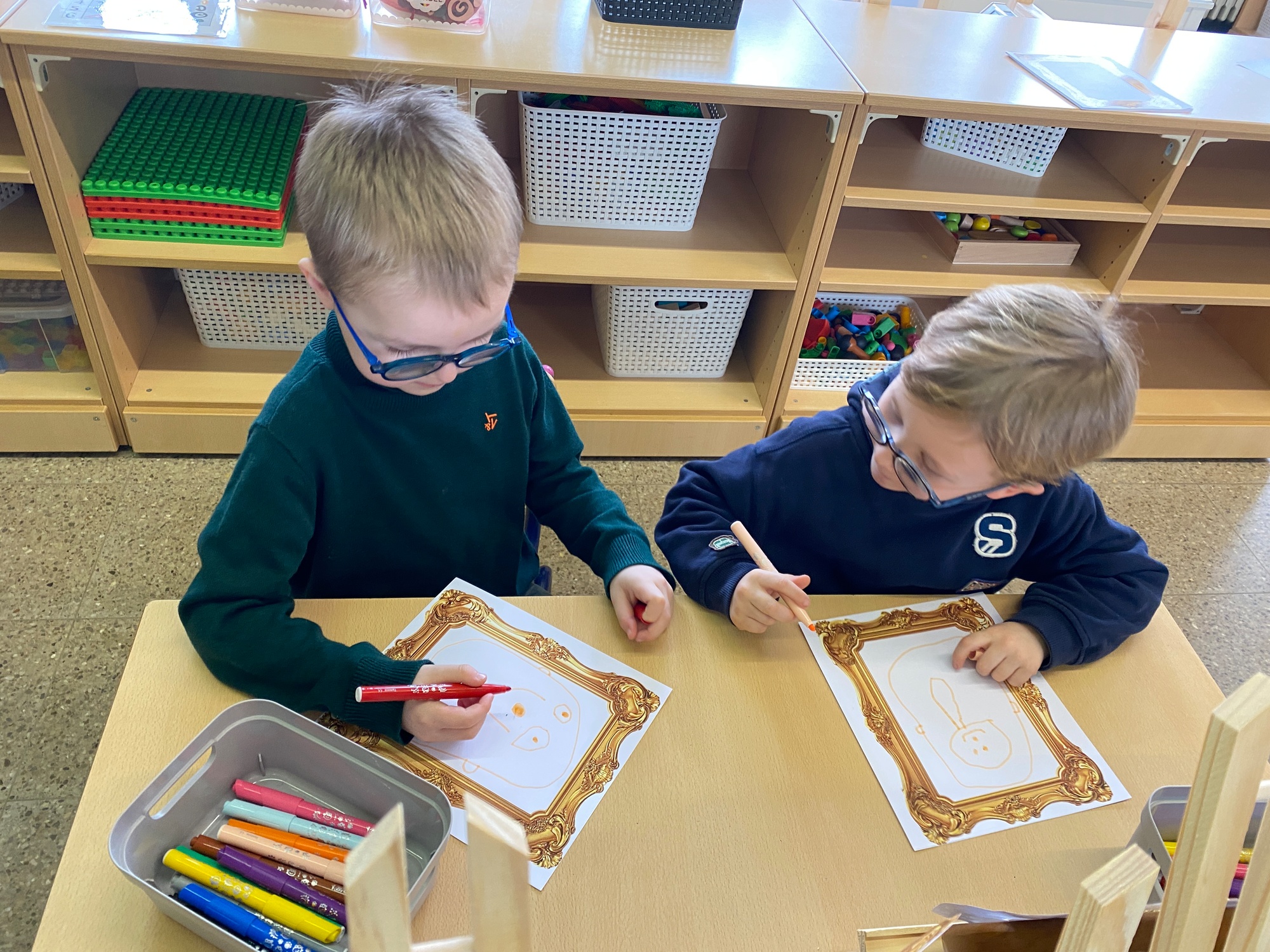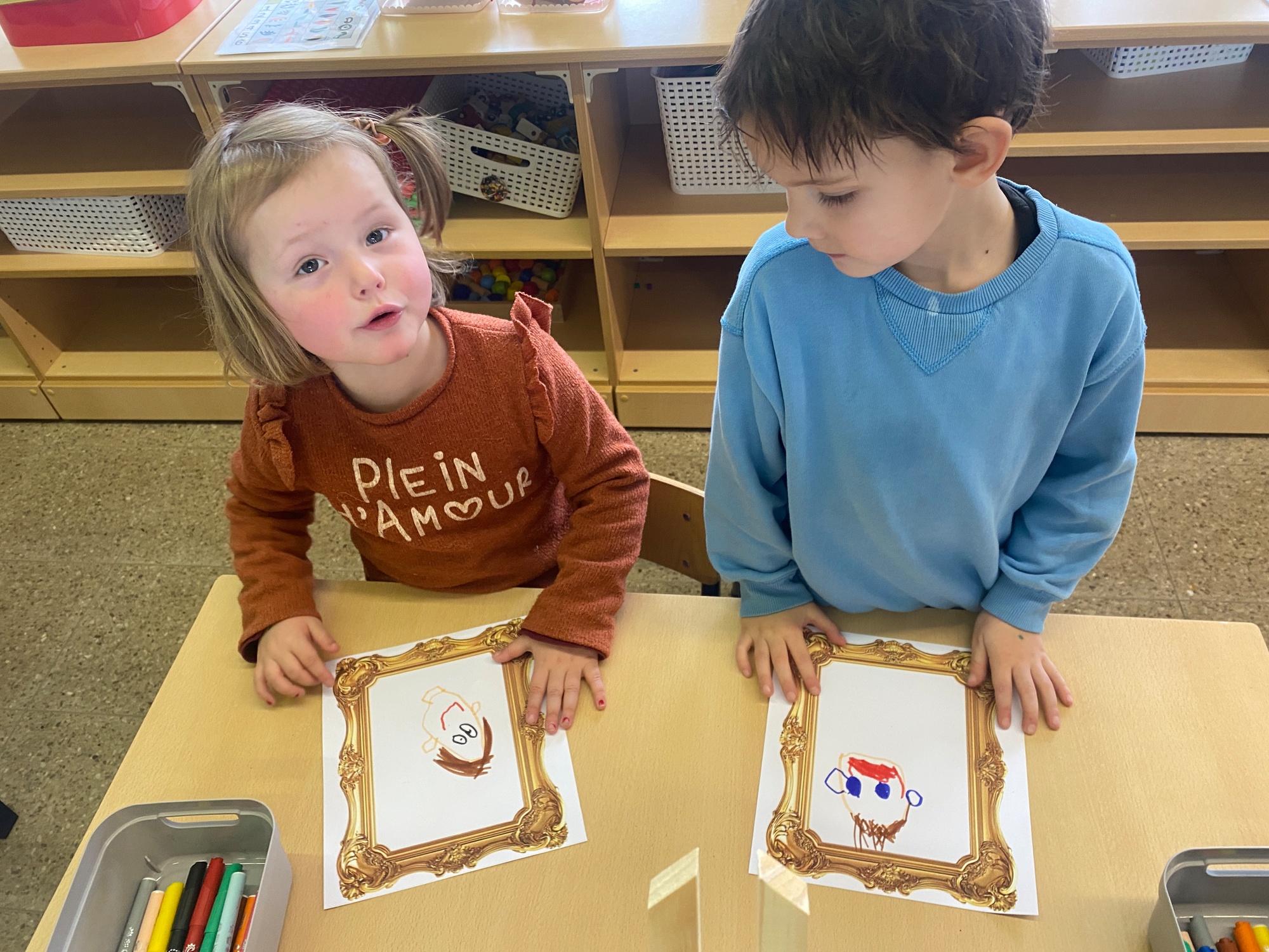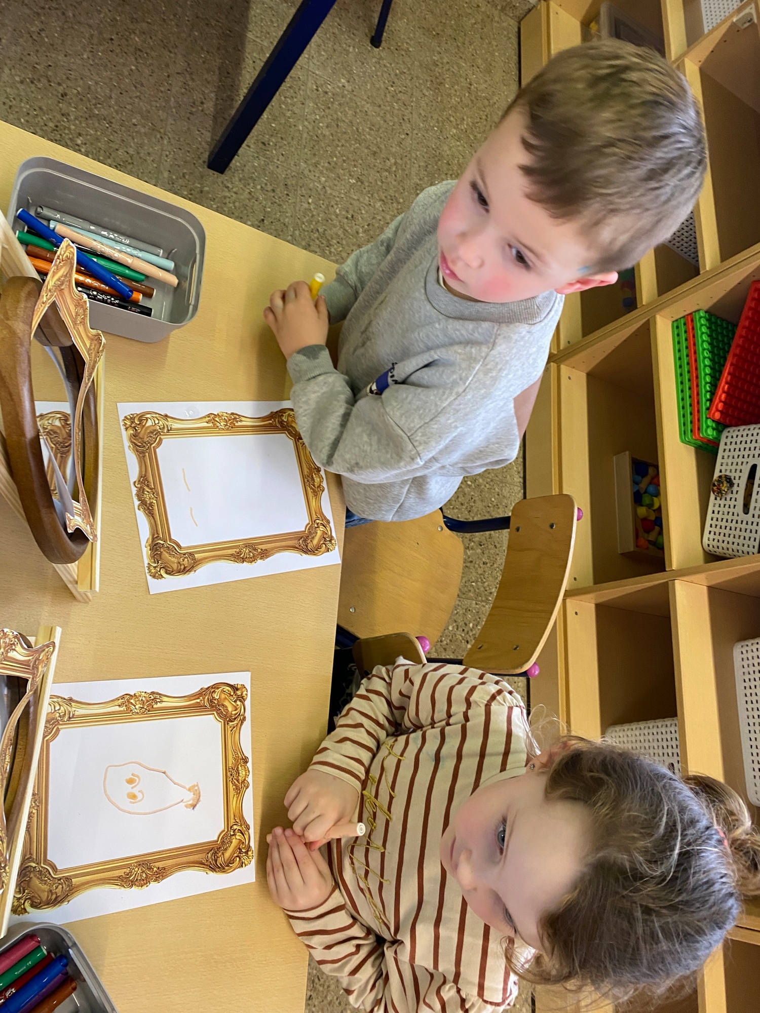 We kijken naar onszelf in de spiegel en tekenen na. Enkel ons gezicht. Ik zie 2 ogen, een neus, een mond, oren, mijn haar... Welke kleur hebben die? We tekenen alles zo goed mogelijk na. Lijk ik op mijn zelfportret?