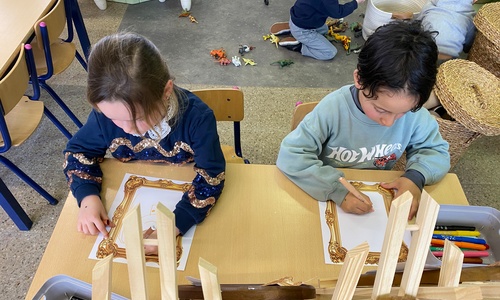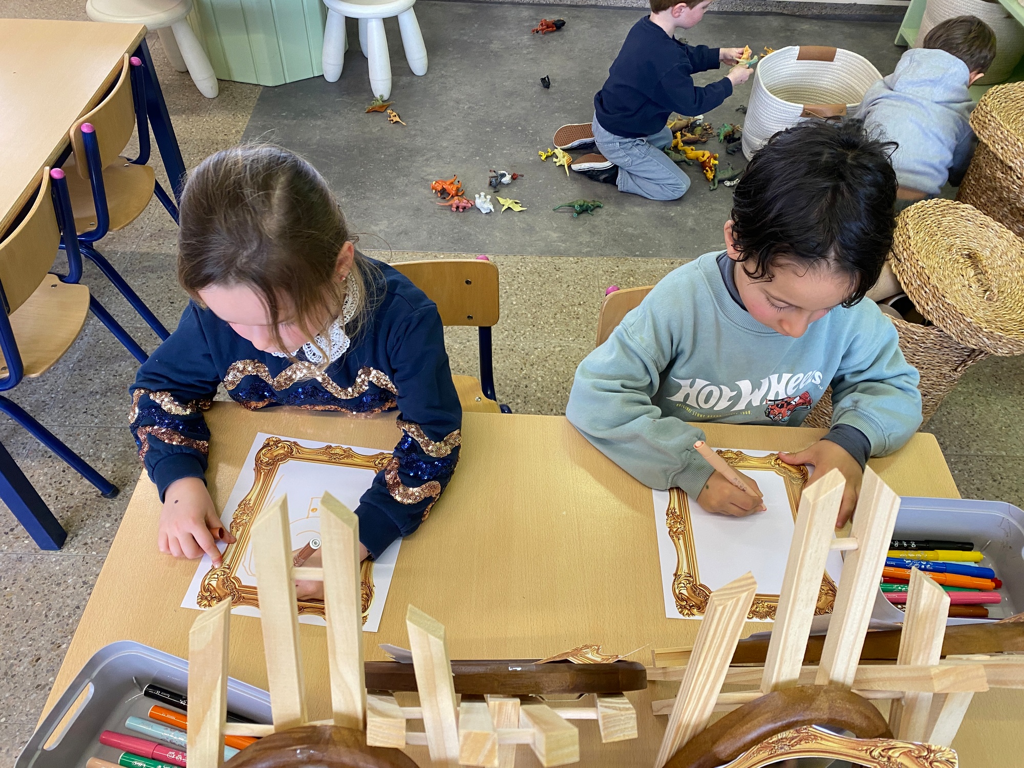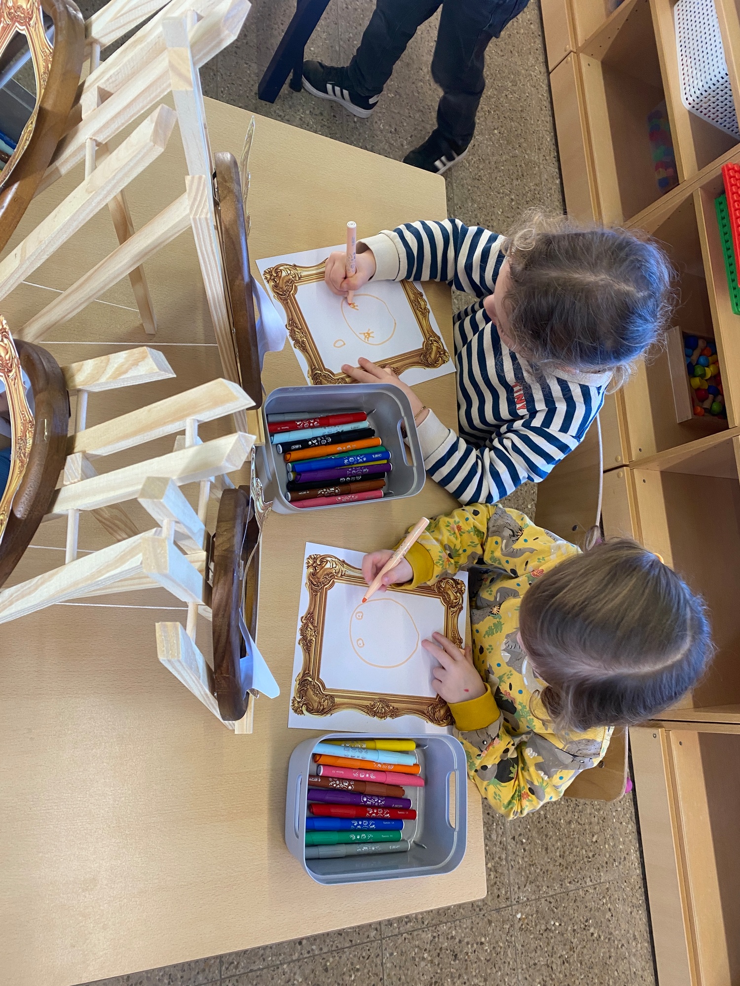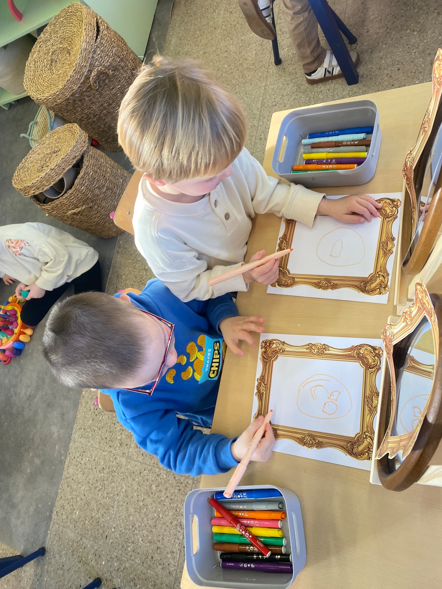 We kijken naar onszelf in de spiegel en tekenen na. Enkel ons gezicht. Ik zie 2 ogen, een neus, een mond, oren, mijn haar... Welke kleur hebben die? We tekenen alles zo goed mogelijk na. Lijk ik op mijn zelfportret?