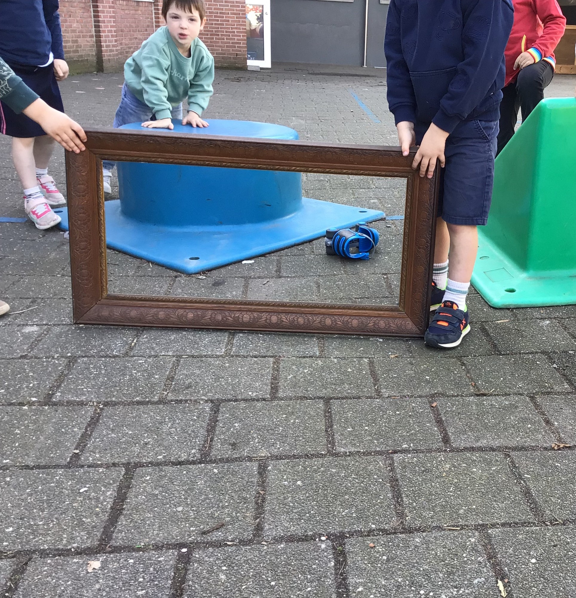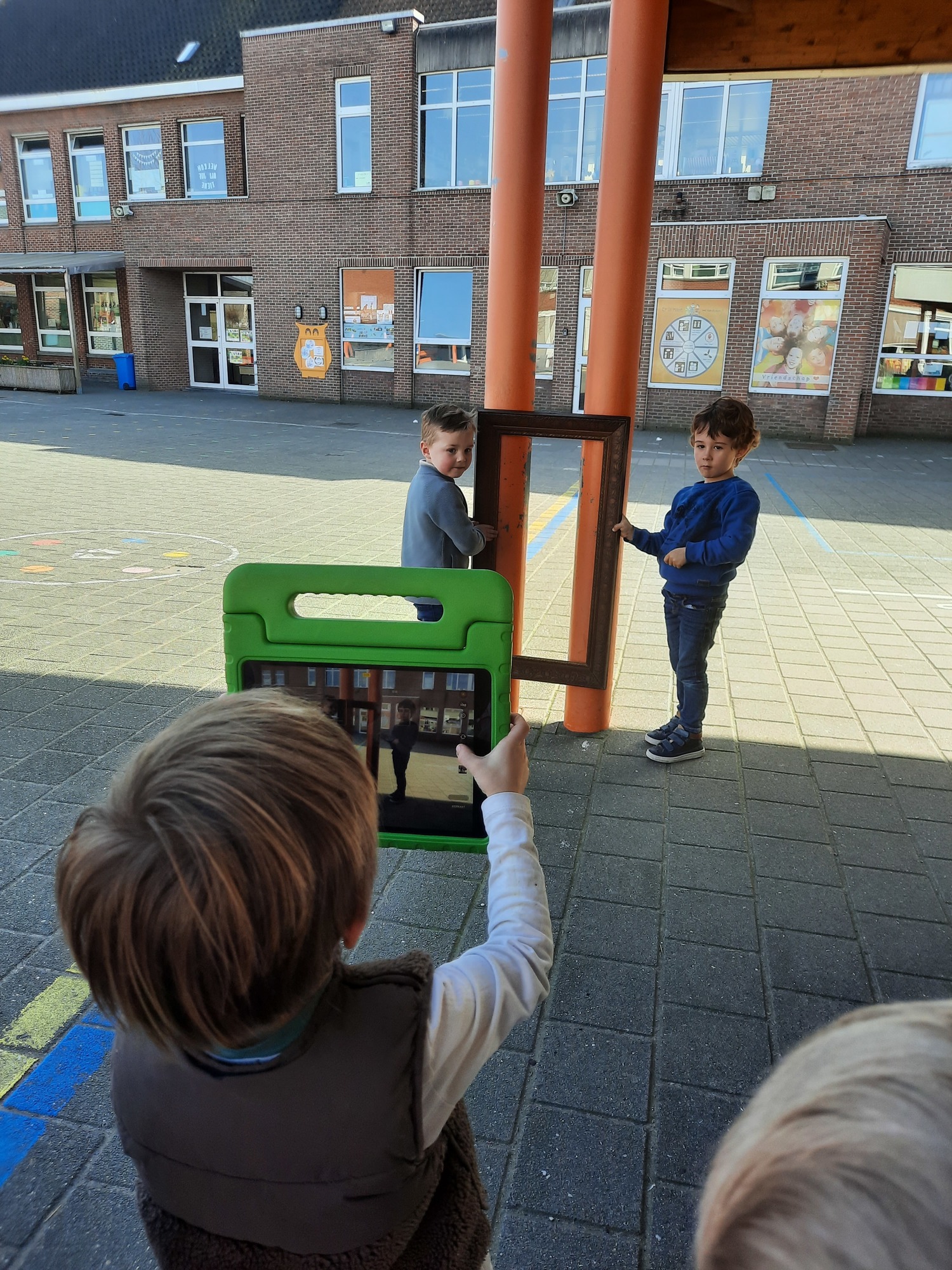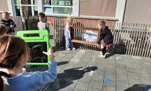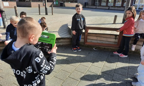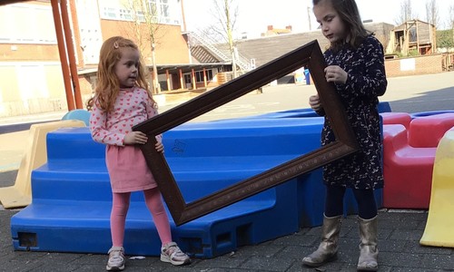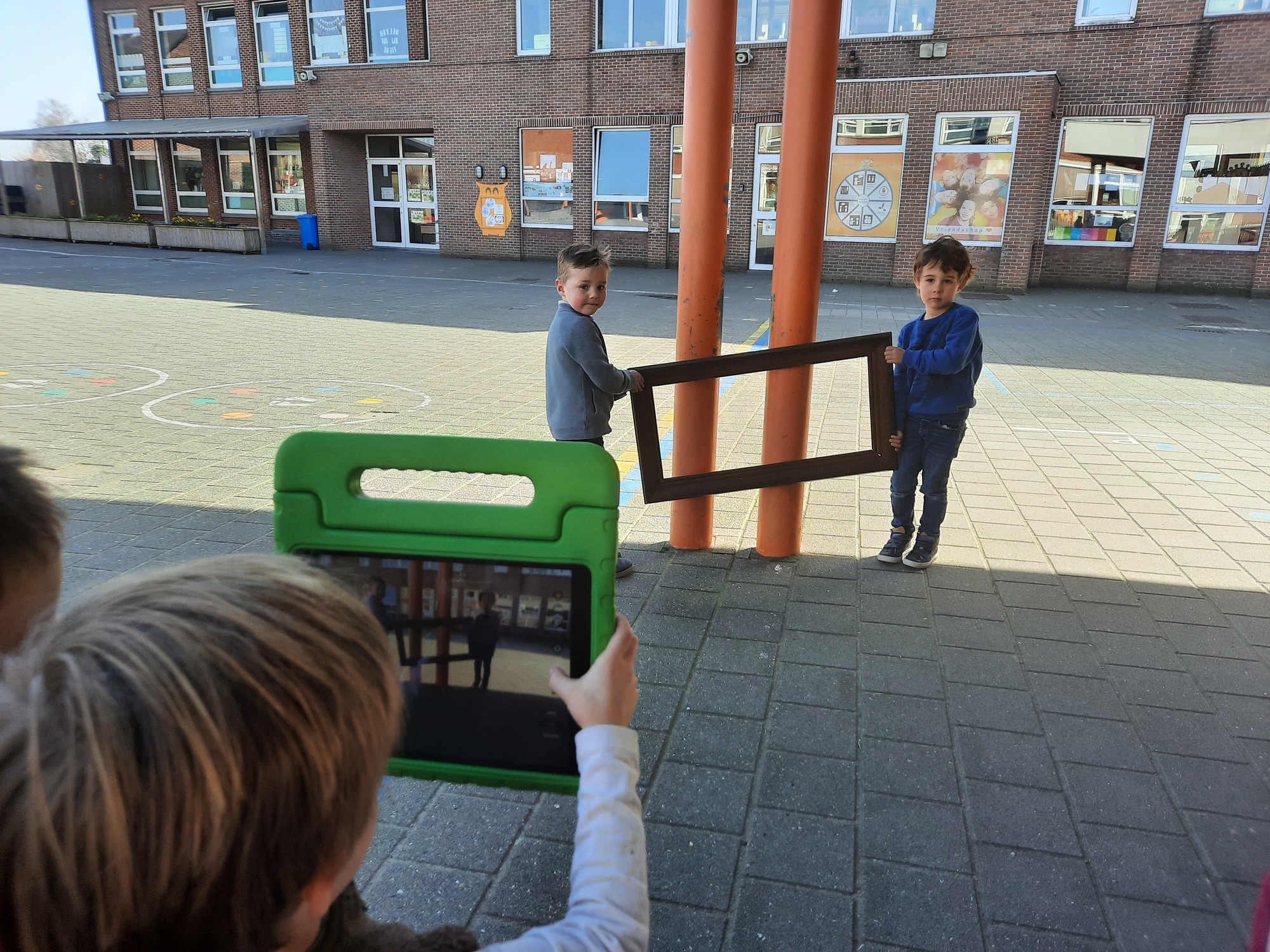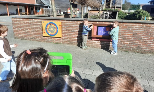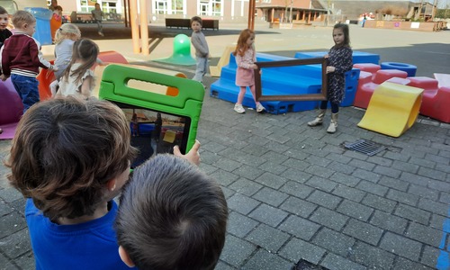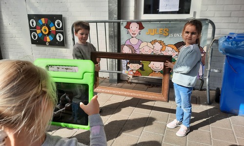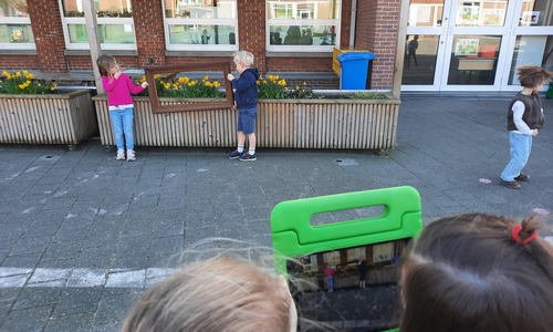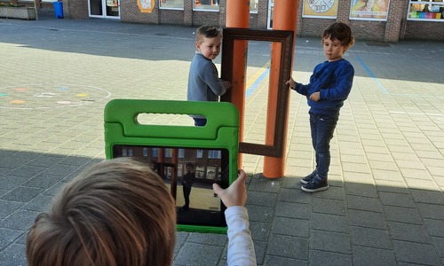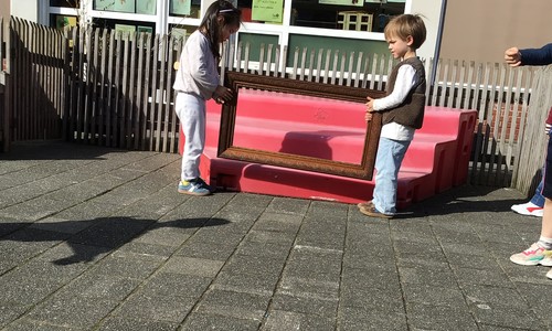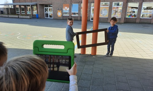 We luisterden naar het verhaal 'kijk eens hoe mooi'. Wanneer Duif een nieuwe lijst gemaakt heeft en ermee op stap gaat naar Prinses Plakband, ziet hij onderweg dat je van 'kleine dingen' 'grote kunst' kan maken. Wij zochten zelf dingen die mooi worden als je ze in een kadertje zet. Echte kunst :). De kleuters namen zelf een foto van het 'kunstwerk'.