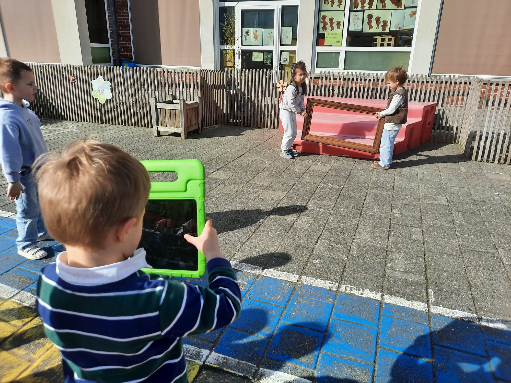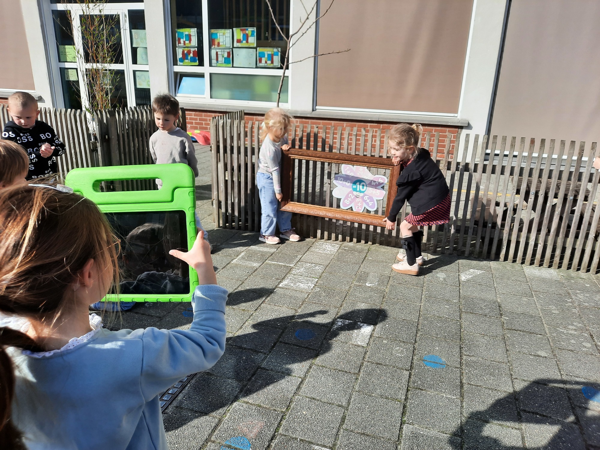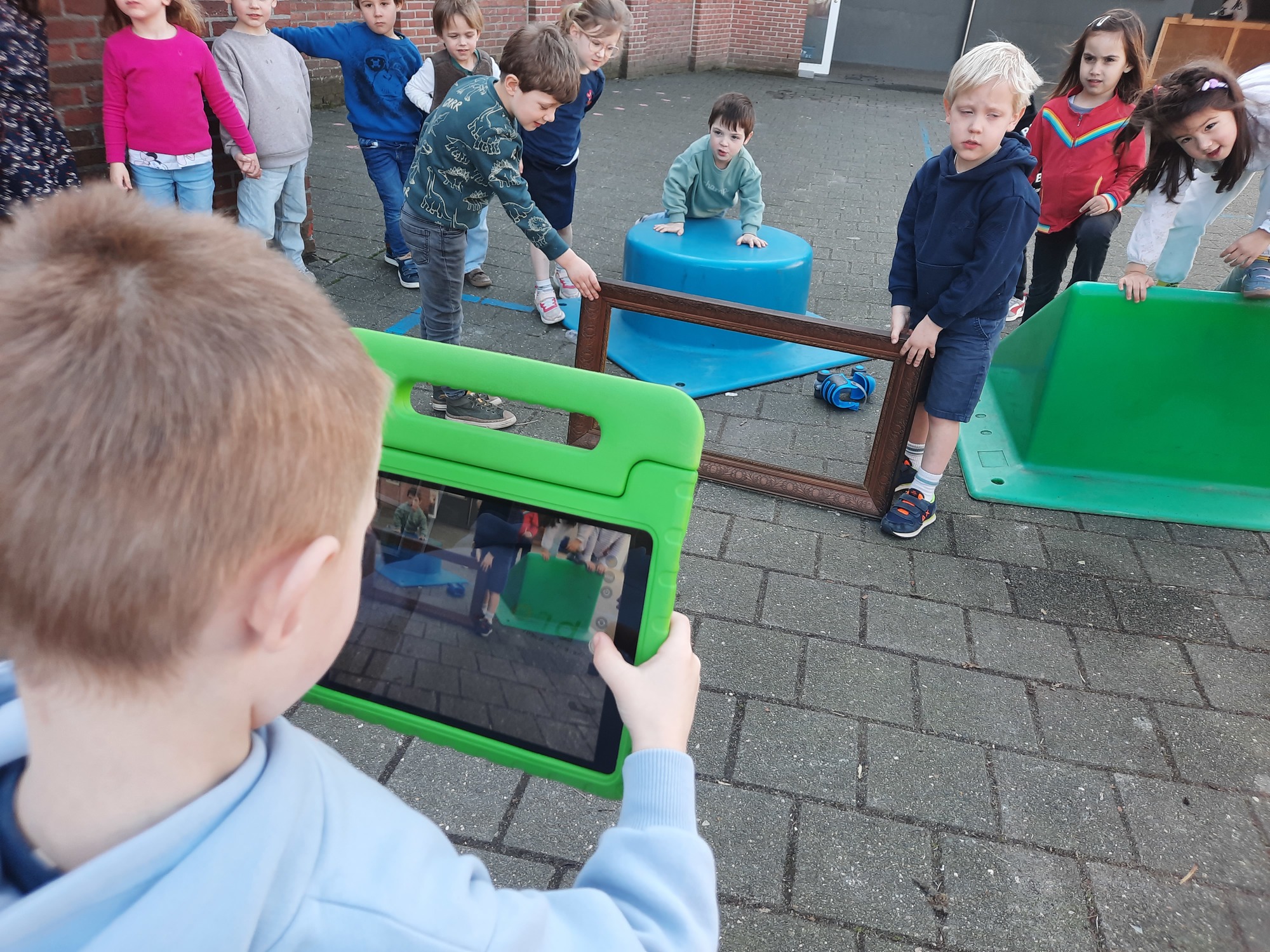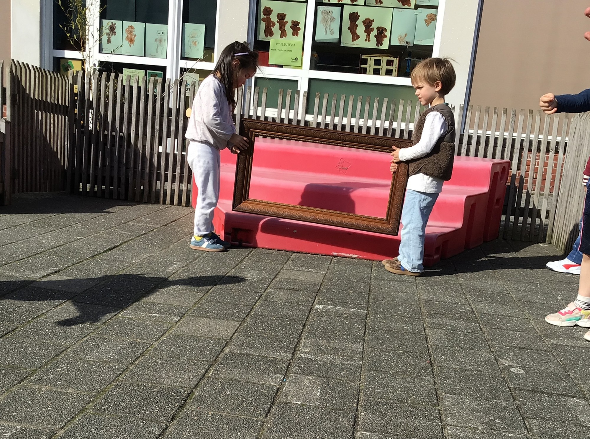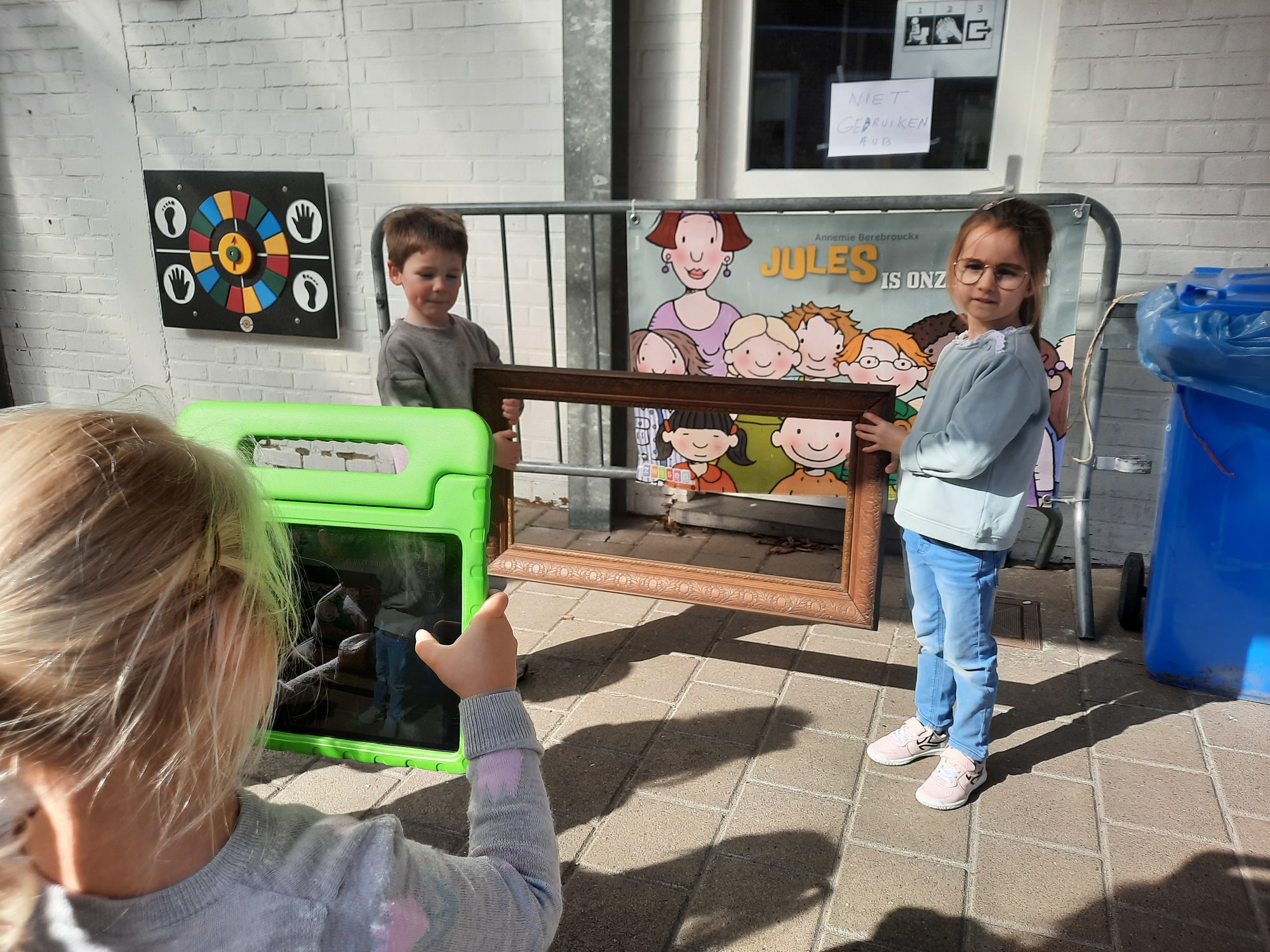 We luisterden naar het verhaal 'kijk eens hoe mooi'. Wanneer Duif een nieuwe lijst gemaakt heeft en ermee op stap gaat naar Prinses Plakband, ziet hij onderweg dat je van 'kleine dingen' 'grote kunst' kan maken. Wij zochten zelf dingen die mooi worden als je ze in een kadertje zet. Echte kunst :). De kleuters namen zelf een foto van het 'kunstwerk'.