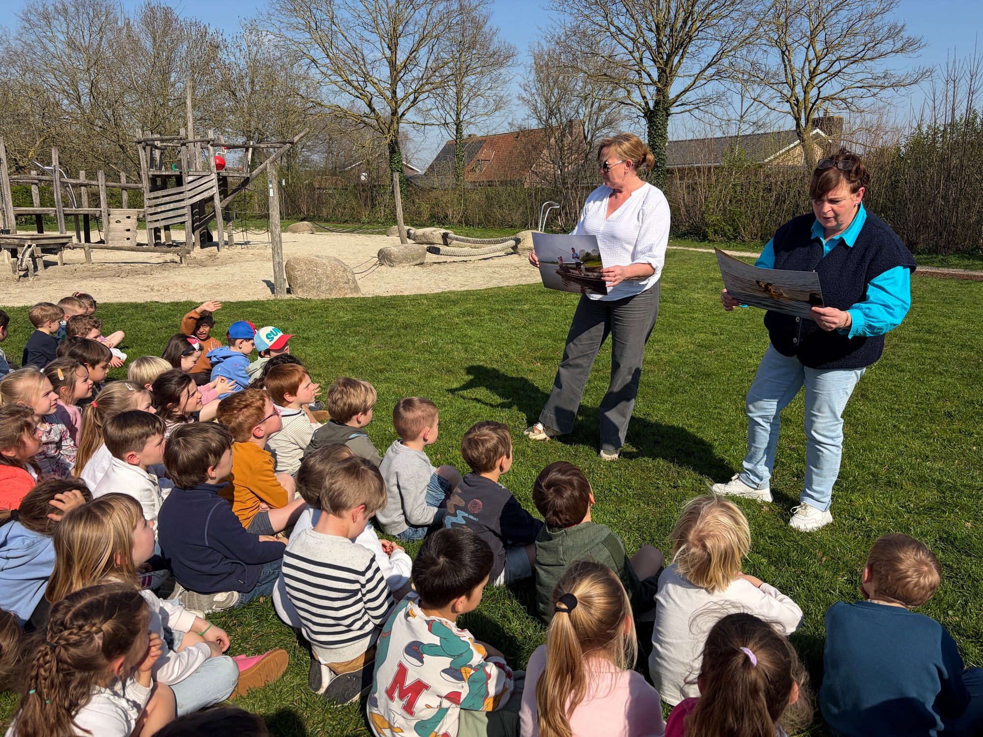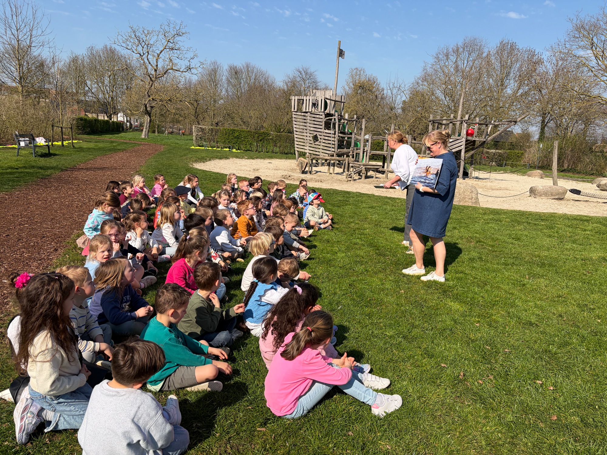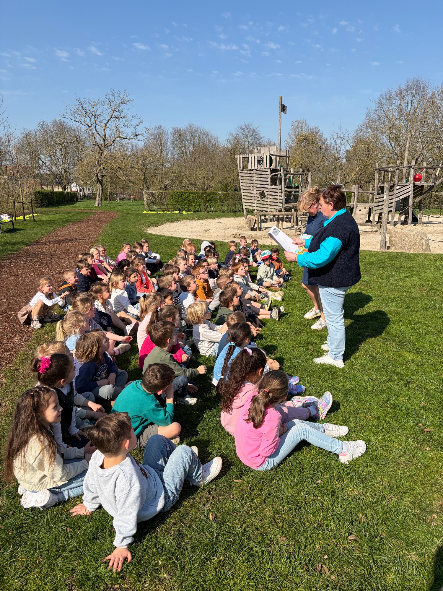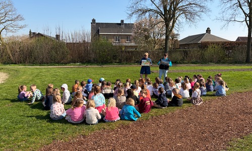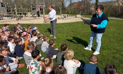 Samen met de derde kleuterklassen gingen we naar de Groene Long en vertelden we het verhaal over de rivier Maranon in San Jorge (Peru).