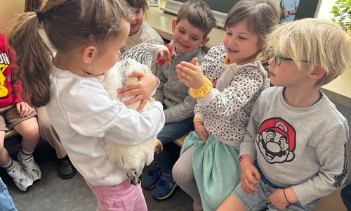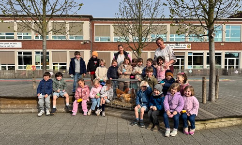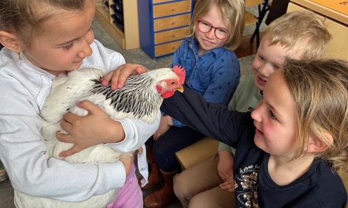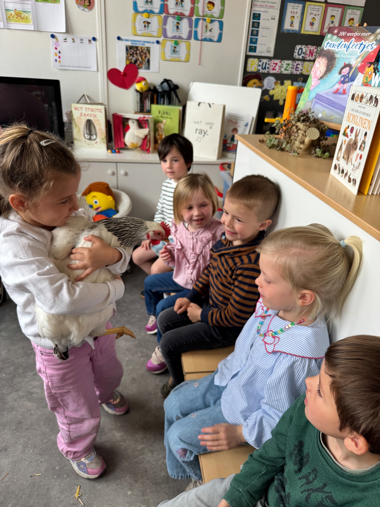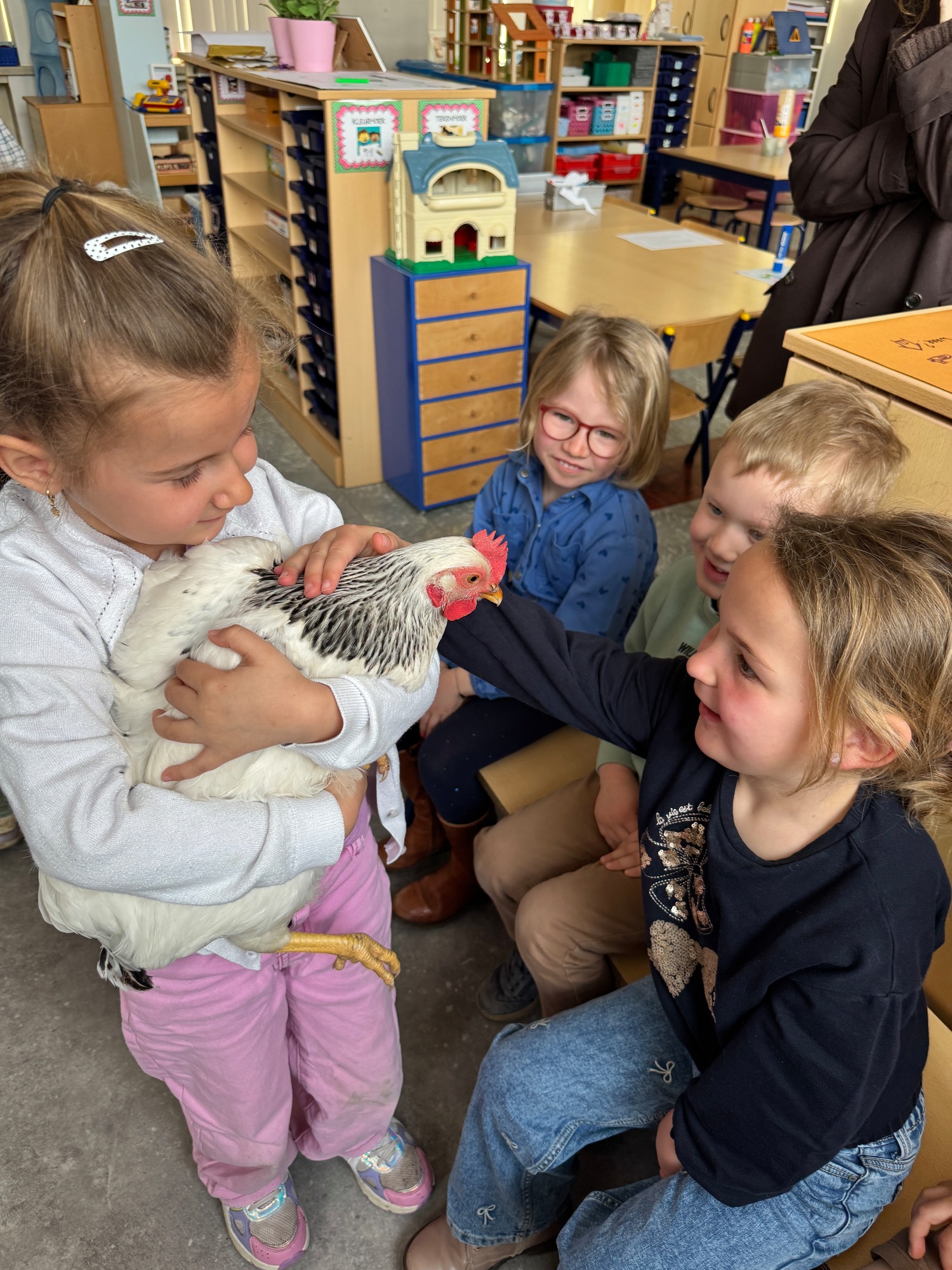 Deze morgen mochten we kennismaken met de drie kippen van Manon. Voor de komst van deze kippen, kregen de kleuters de kans om na te denken over wat ze willen vragen en wat ze willen leren over kippen. Er kwamen heel veel vragen vanuit de kleuters die dan door Manon, haar mama of de juf werden beantwoord. Het was een leerrijke en leuke ontmoeting met Roosje, Bloem en Vlekje.
