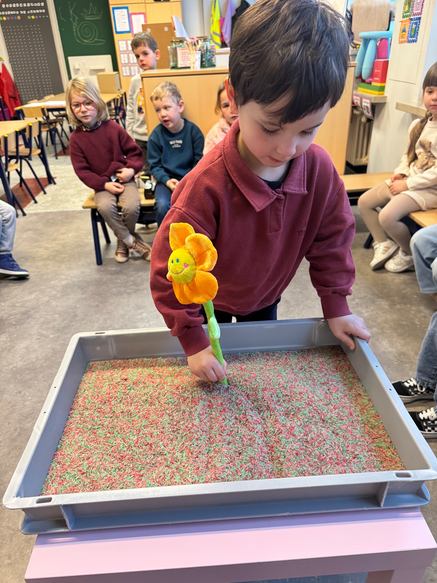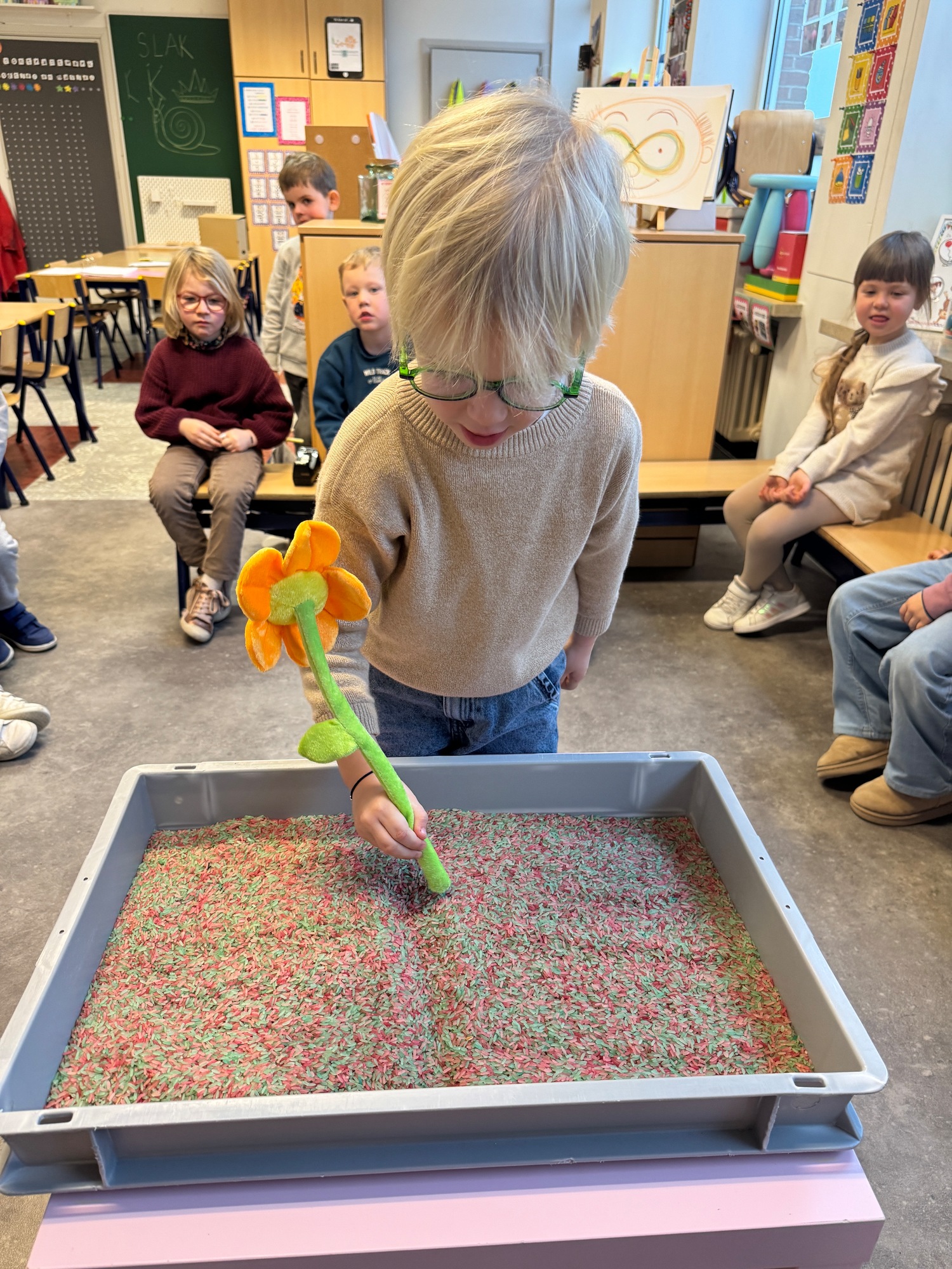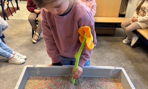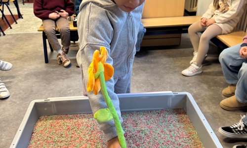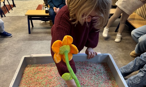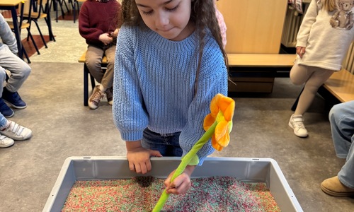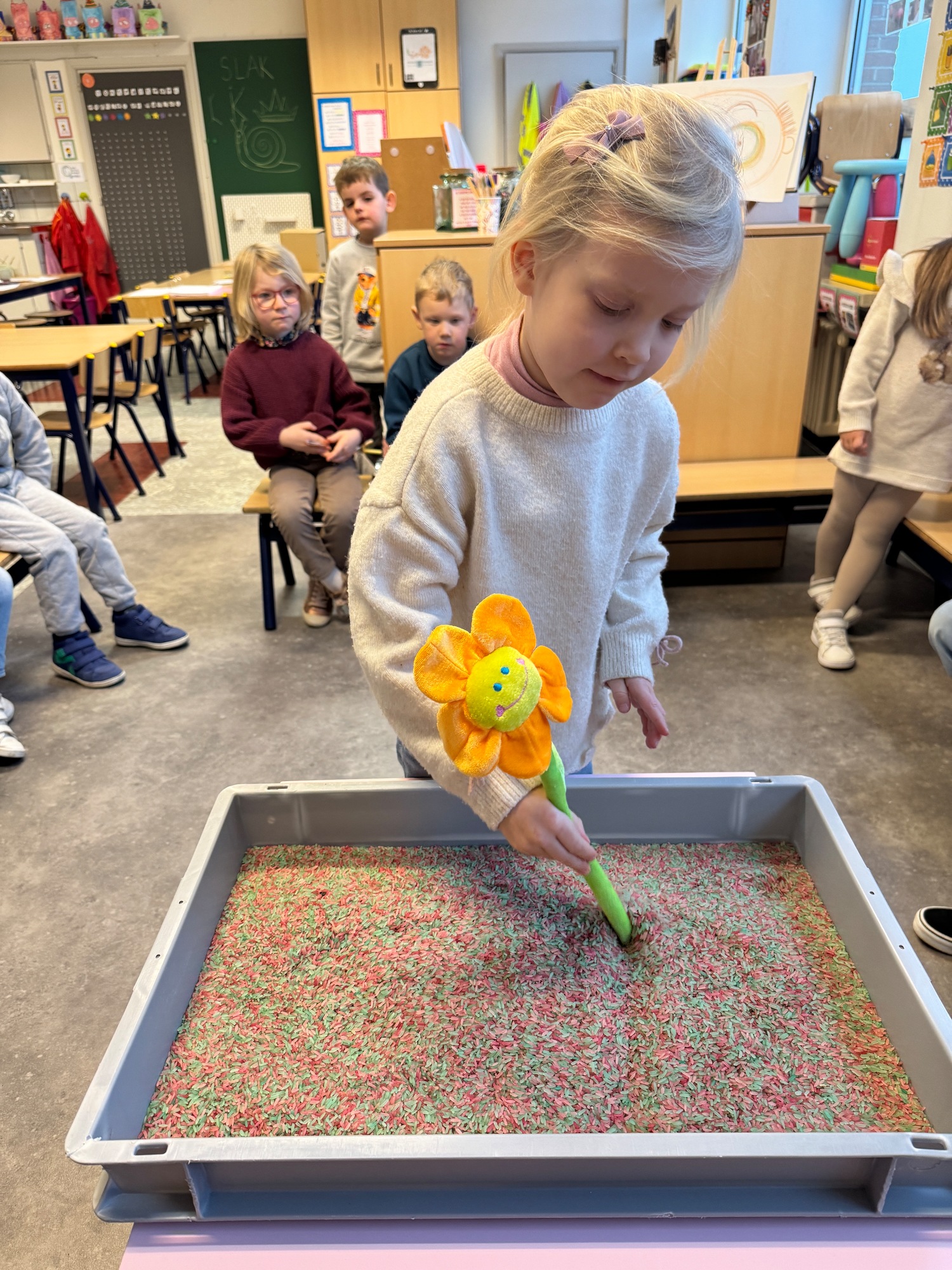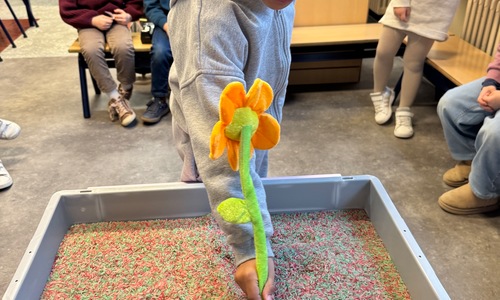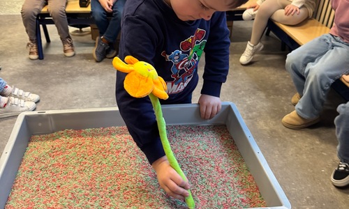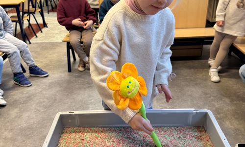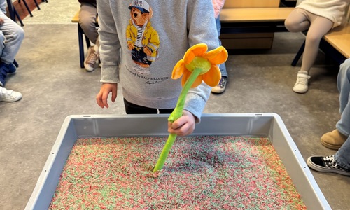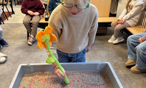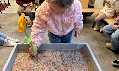 3KC Thema Letters: Ik shrijf mijn eerste naamletter in onze rijstbak.