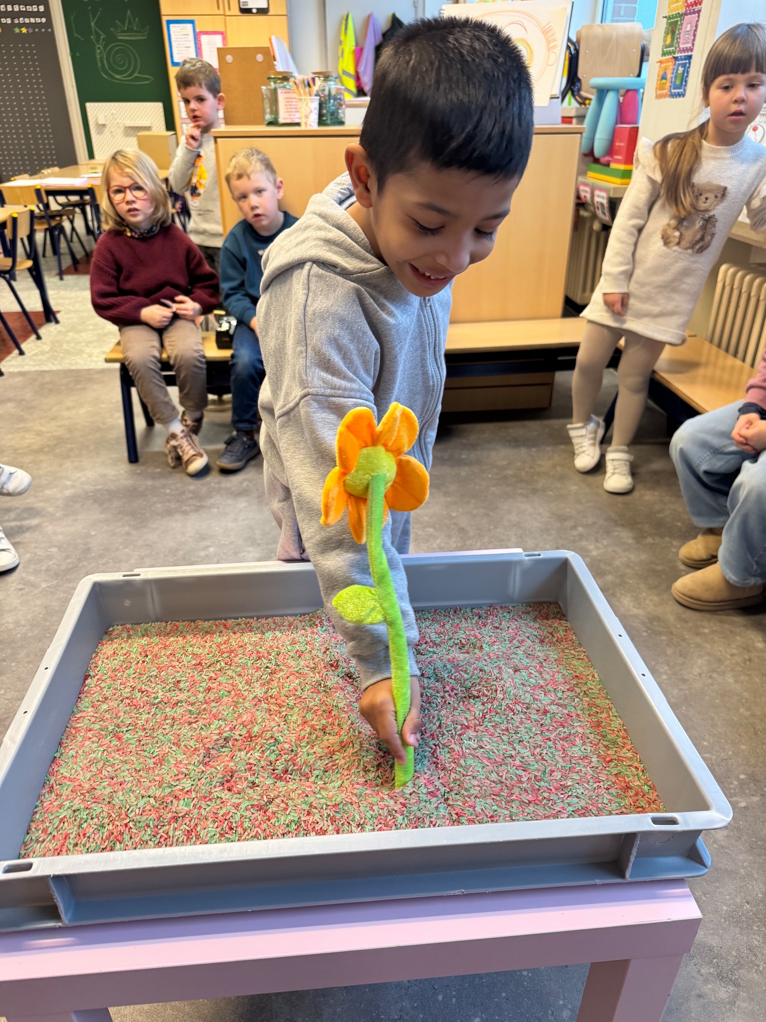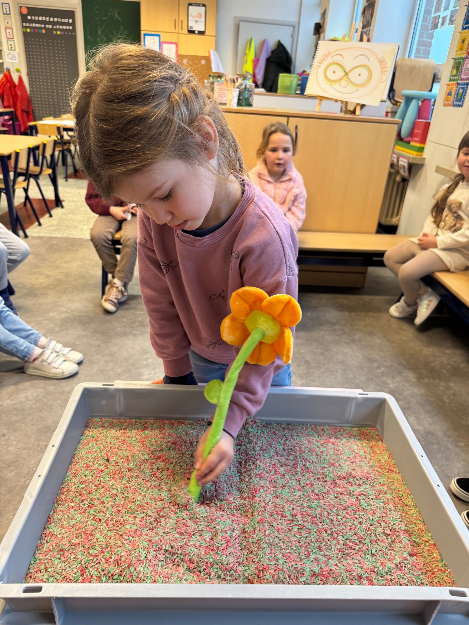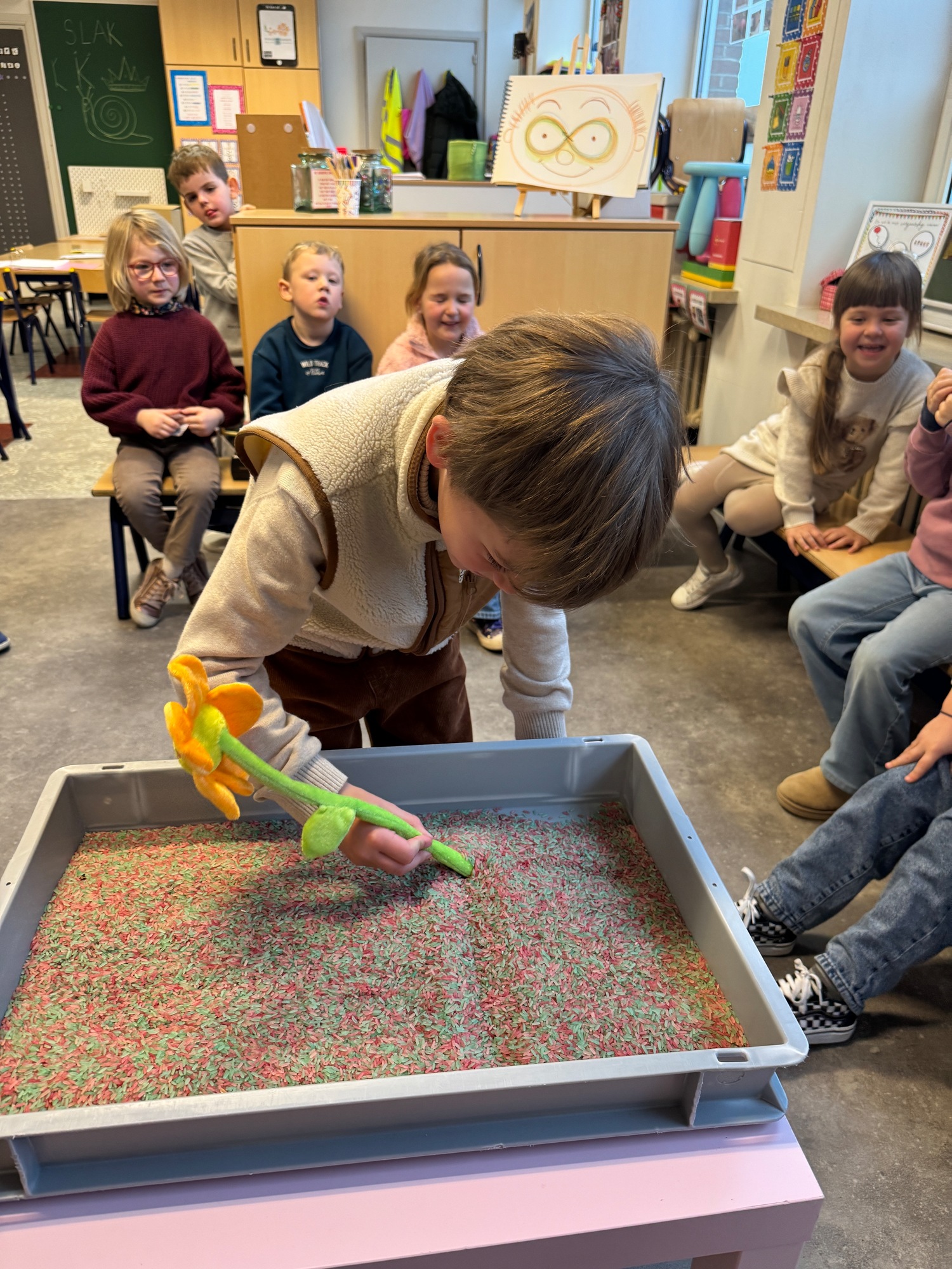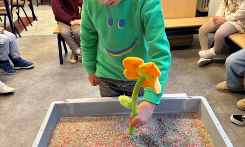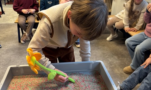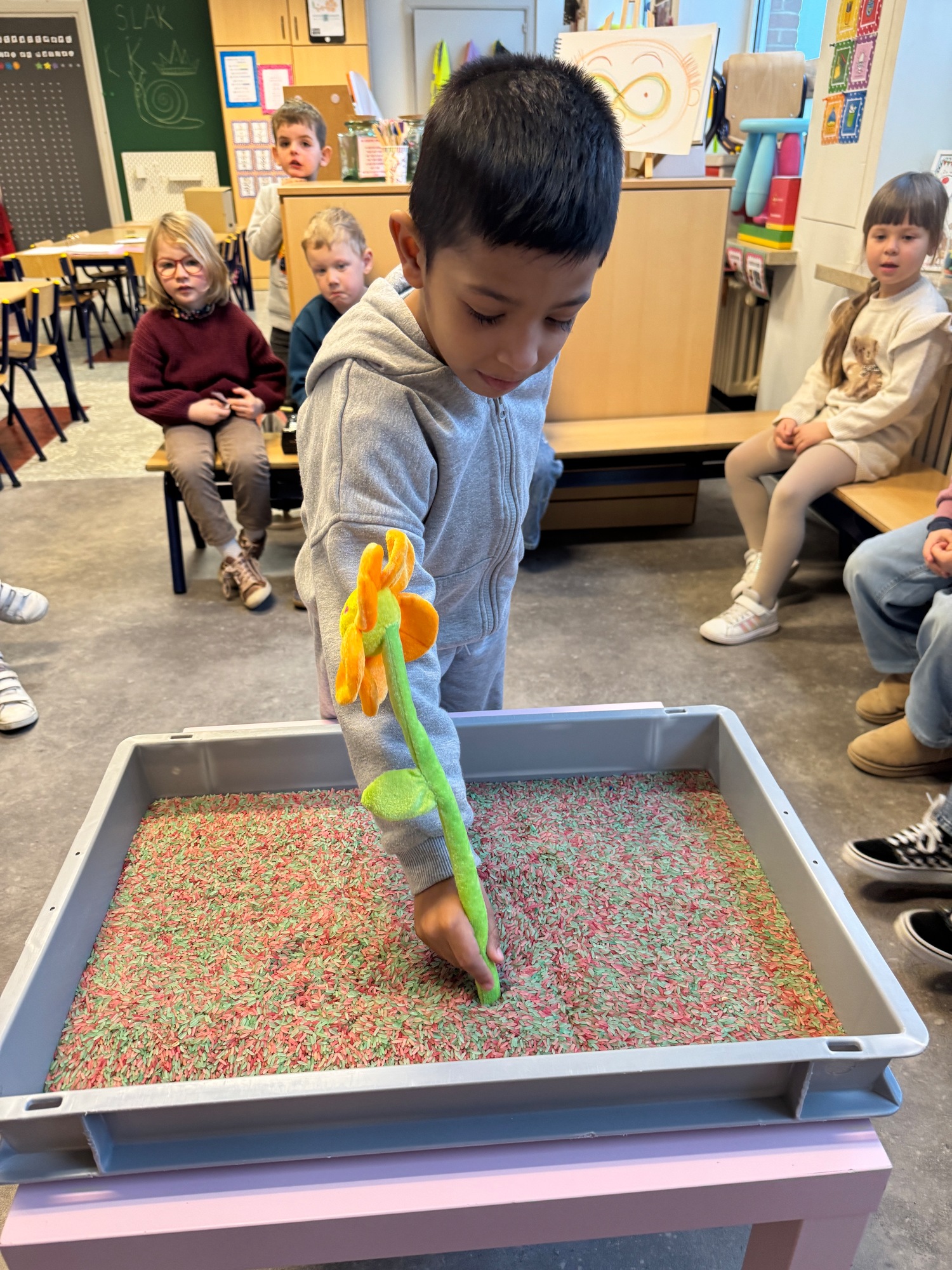 3KC Thema Letters: Ik shrijf mijn eerste naamletter in onze rijstbak.