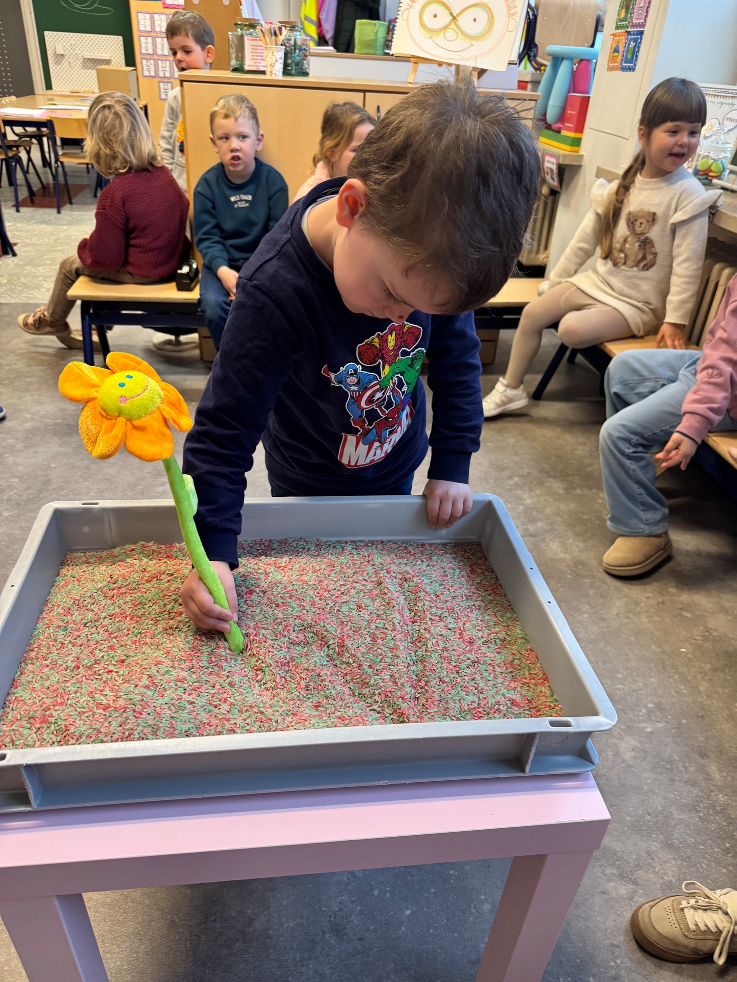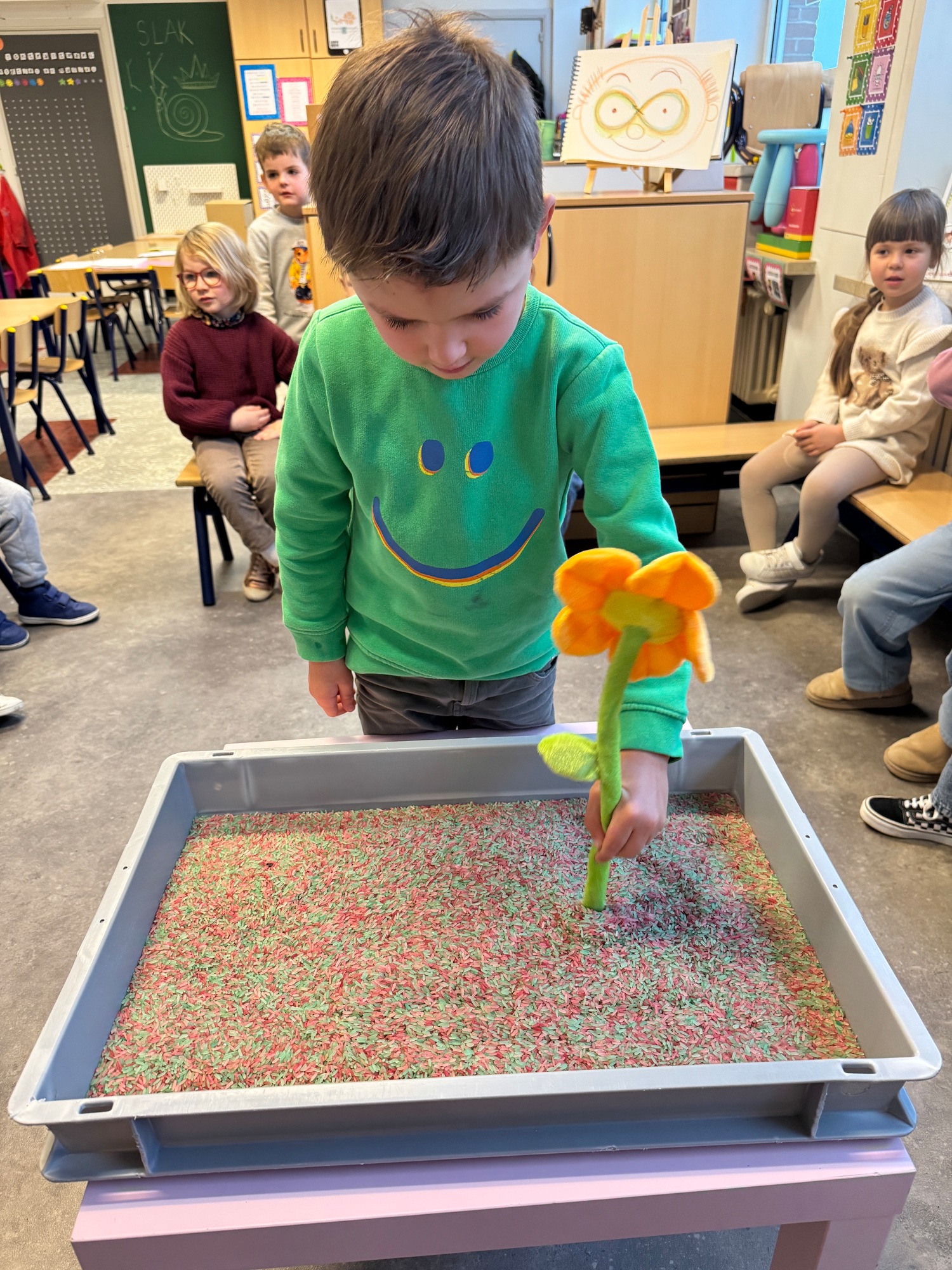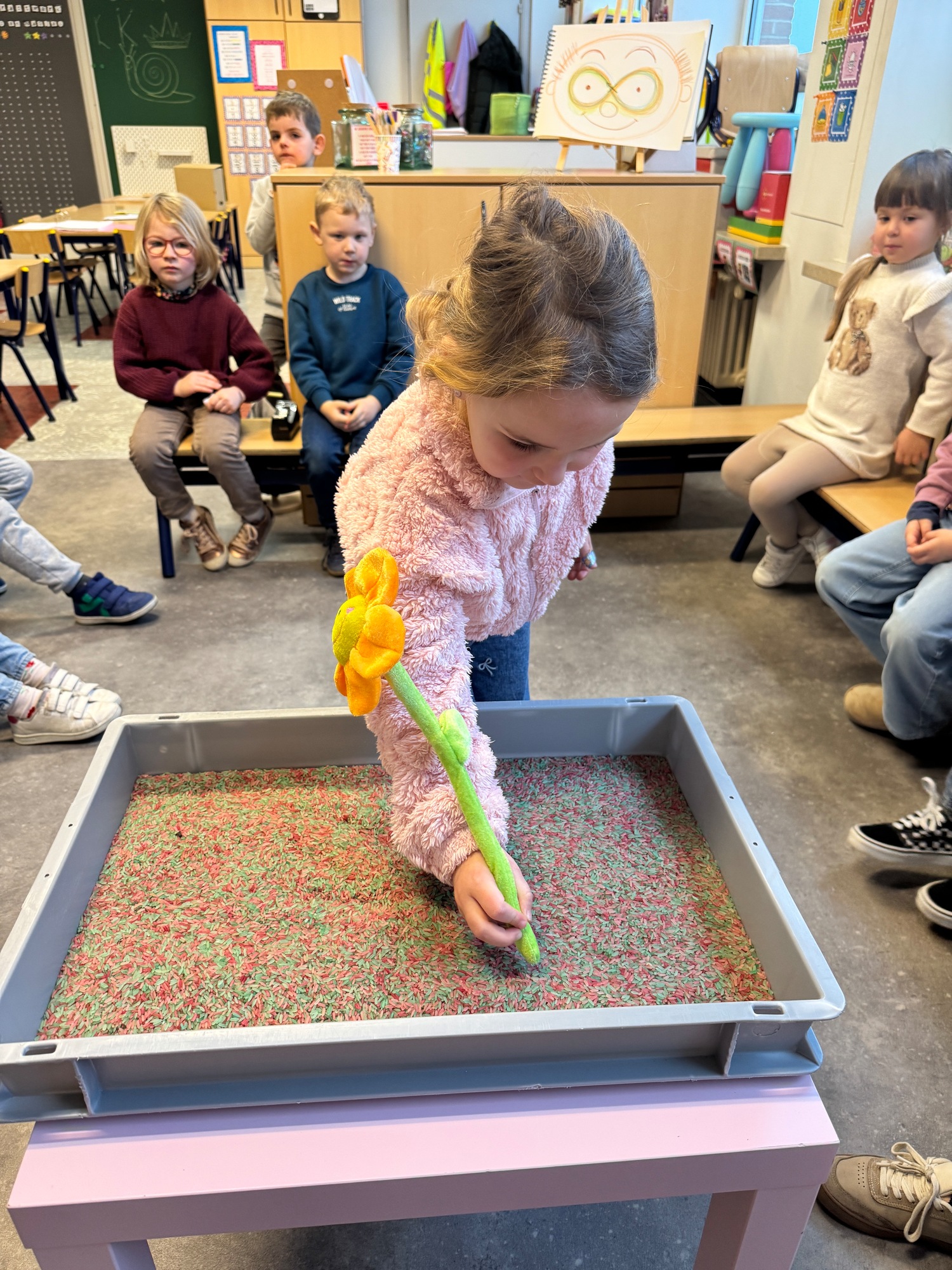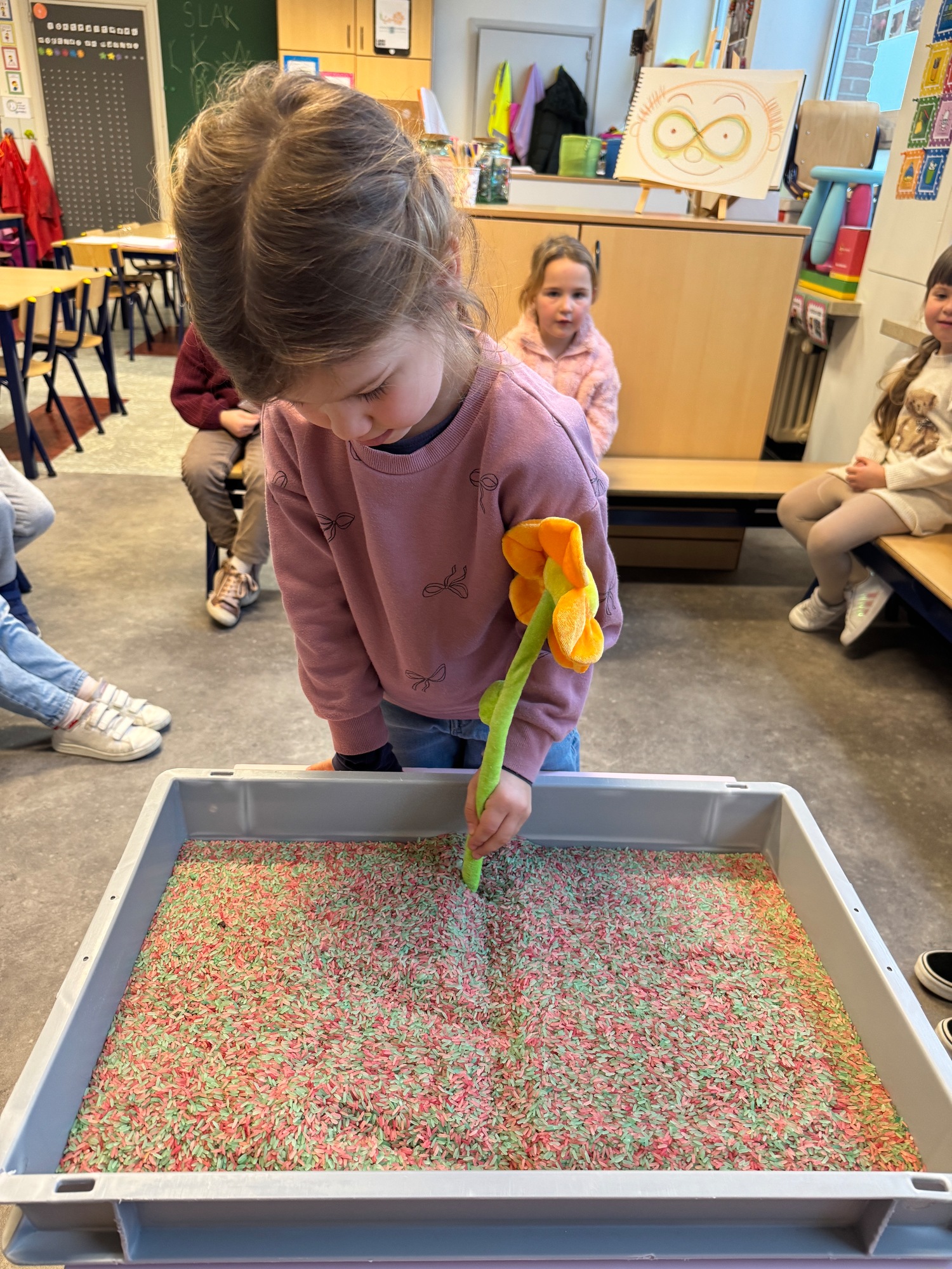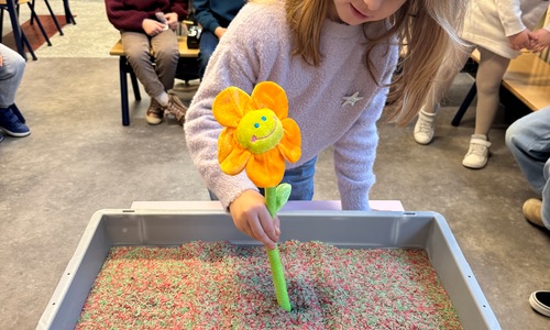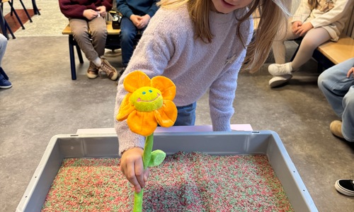 3KC Thema Letters: Ik shrijf mijn eerste naamletter in onze rijstbak.