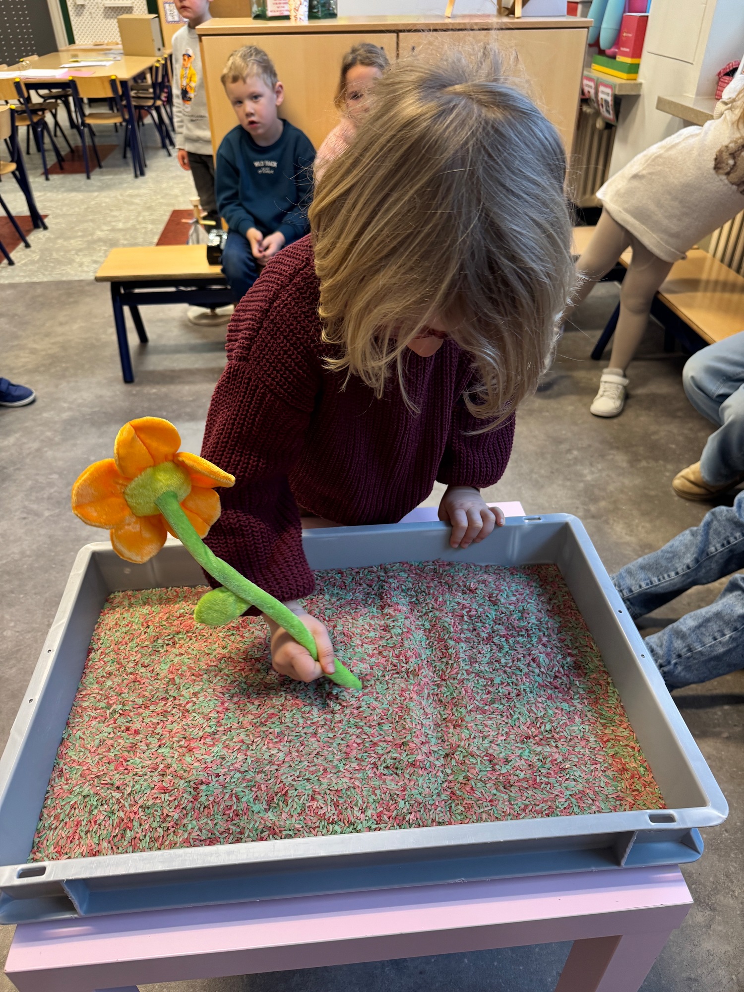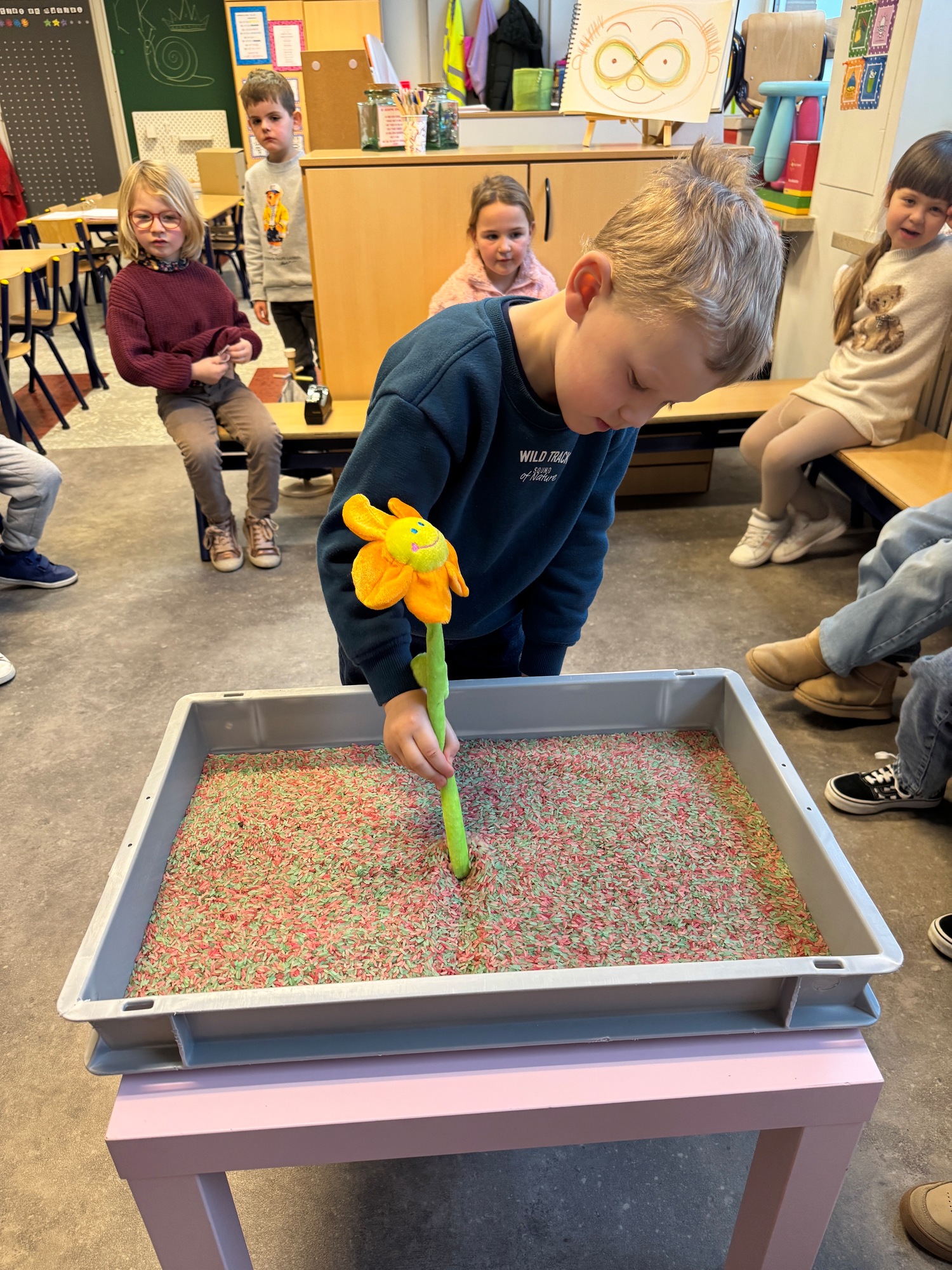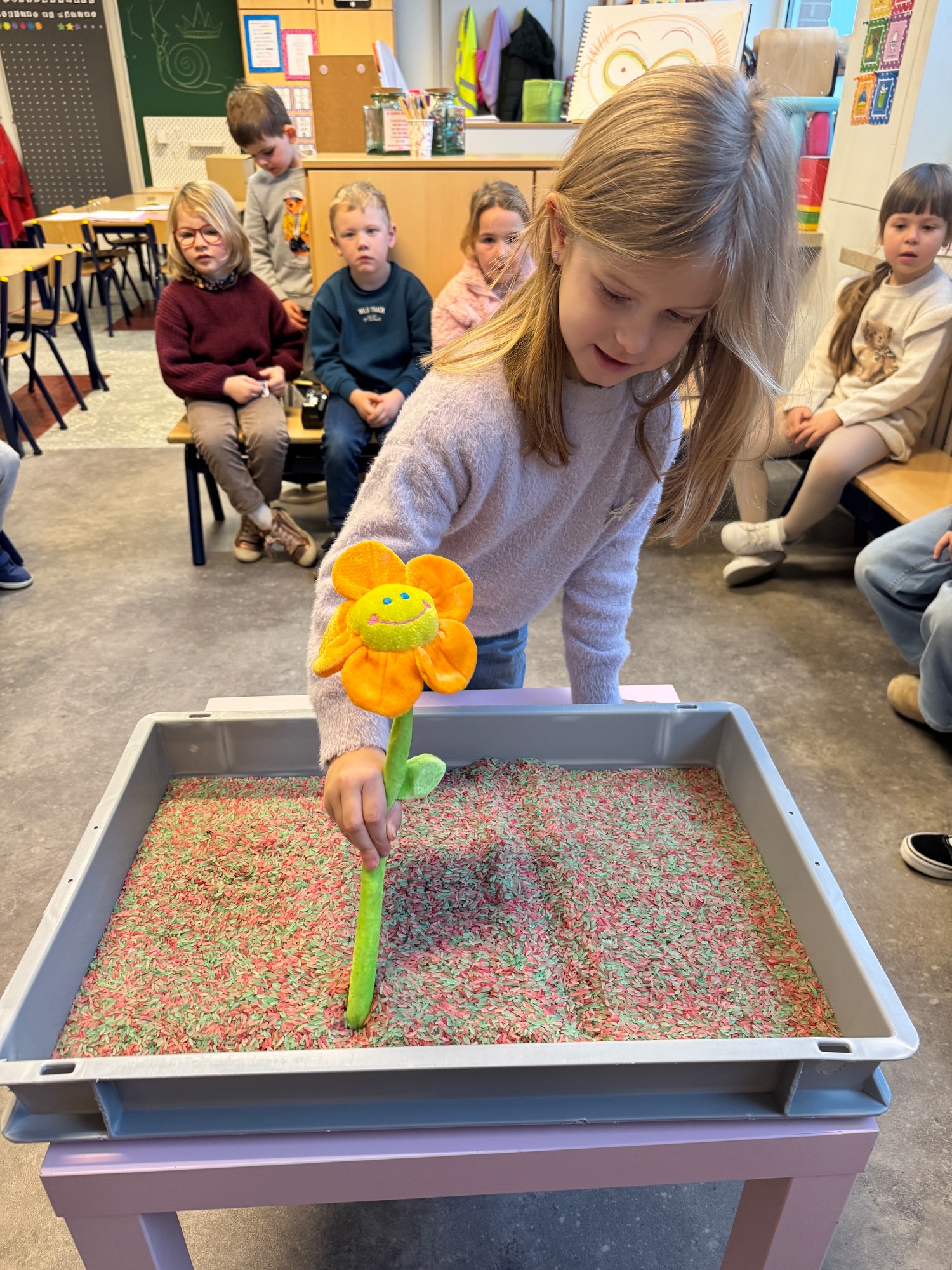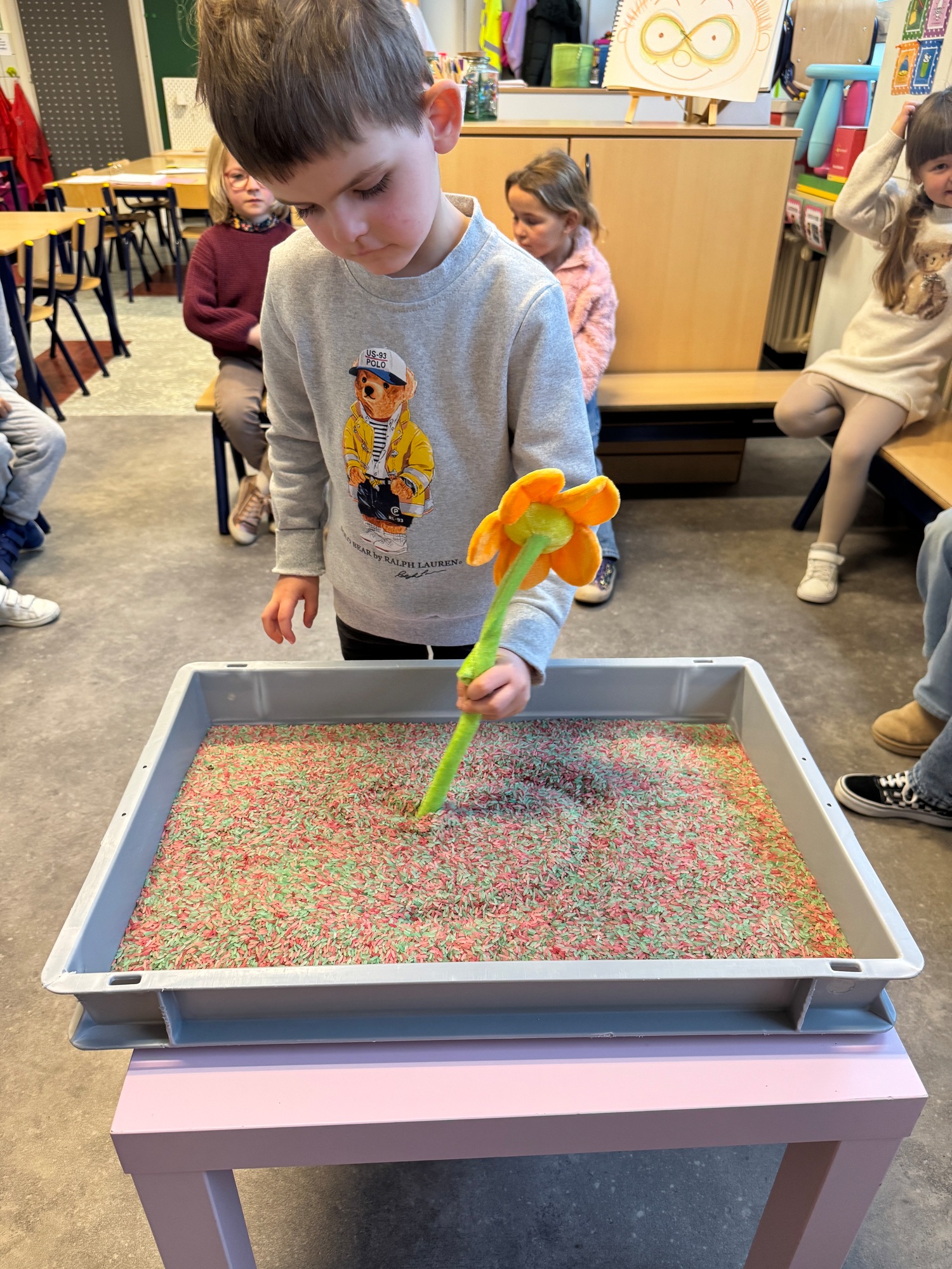 3KC Thema Letters: Ik shrijf mijn eerste naamletter in onze rijstbak.