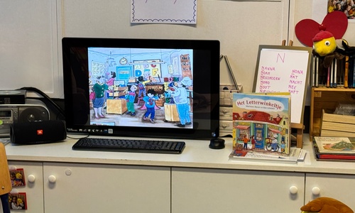 3KC Thema Letters: Opening van het thema door Pompom: Hij bracht een mooi boek en lettersnoepjes mee.