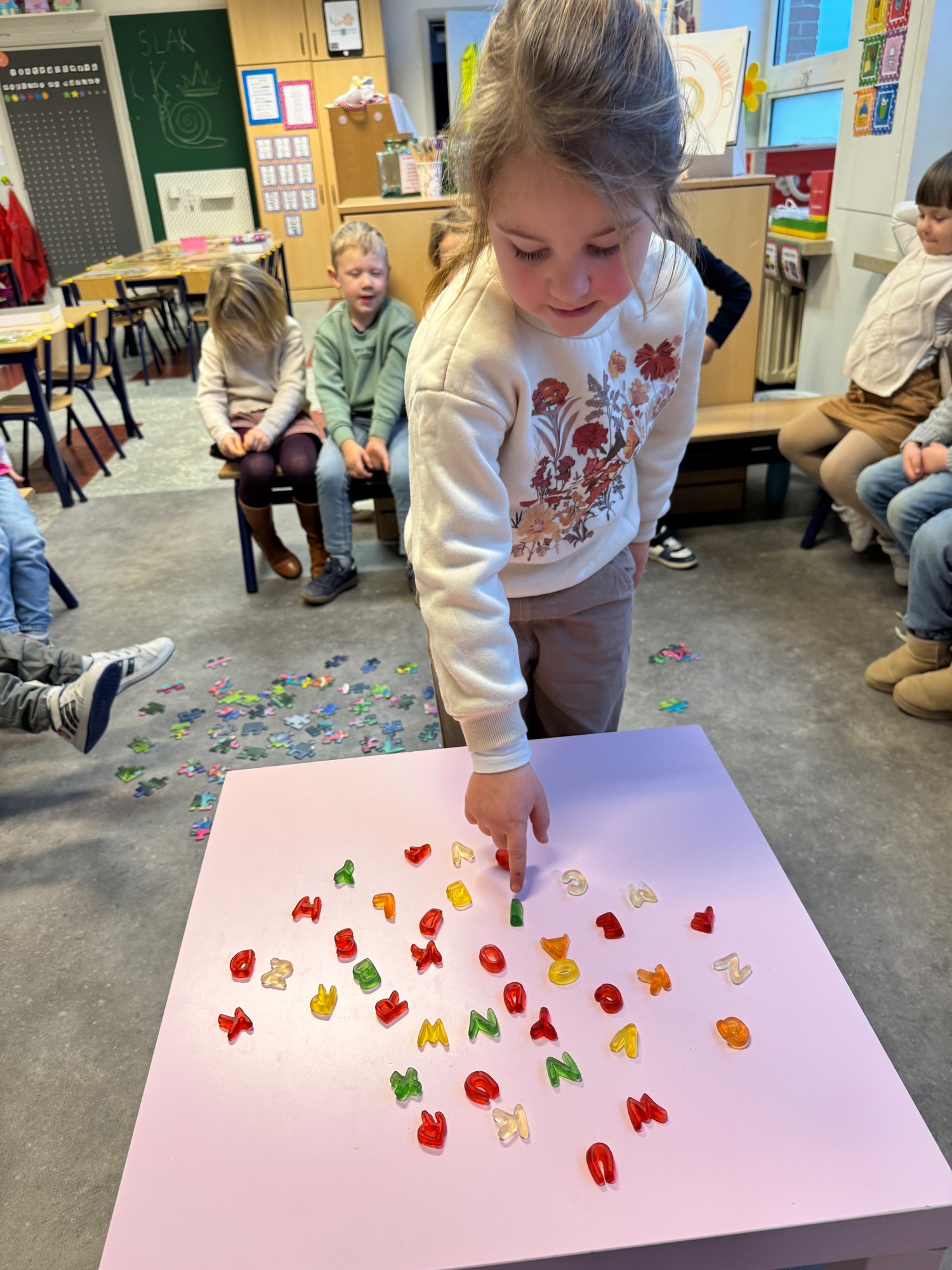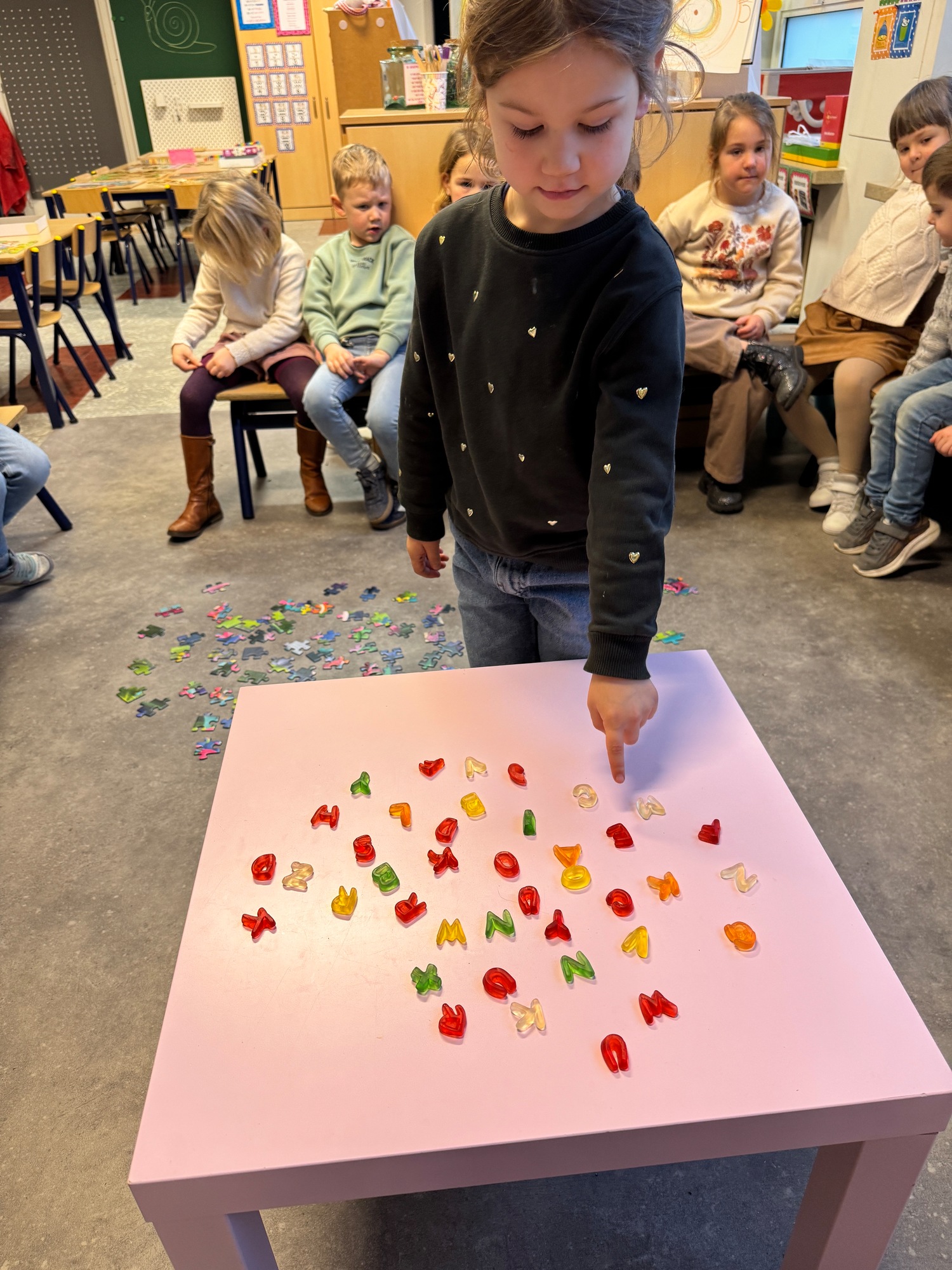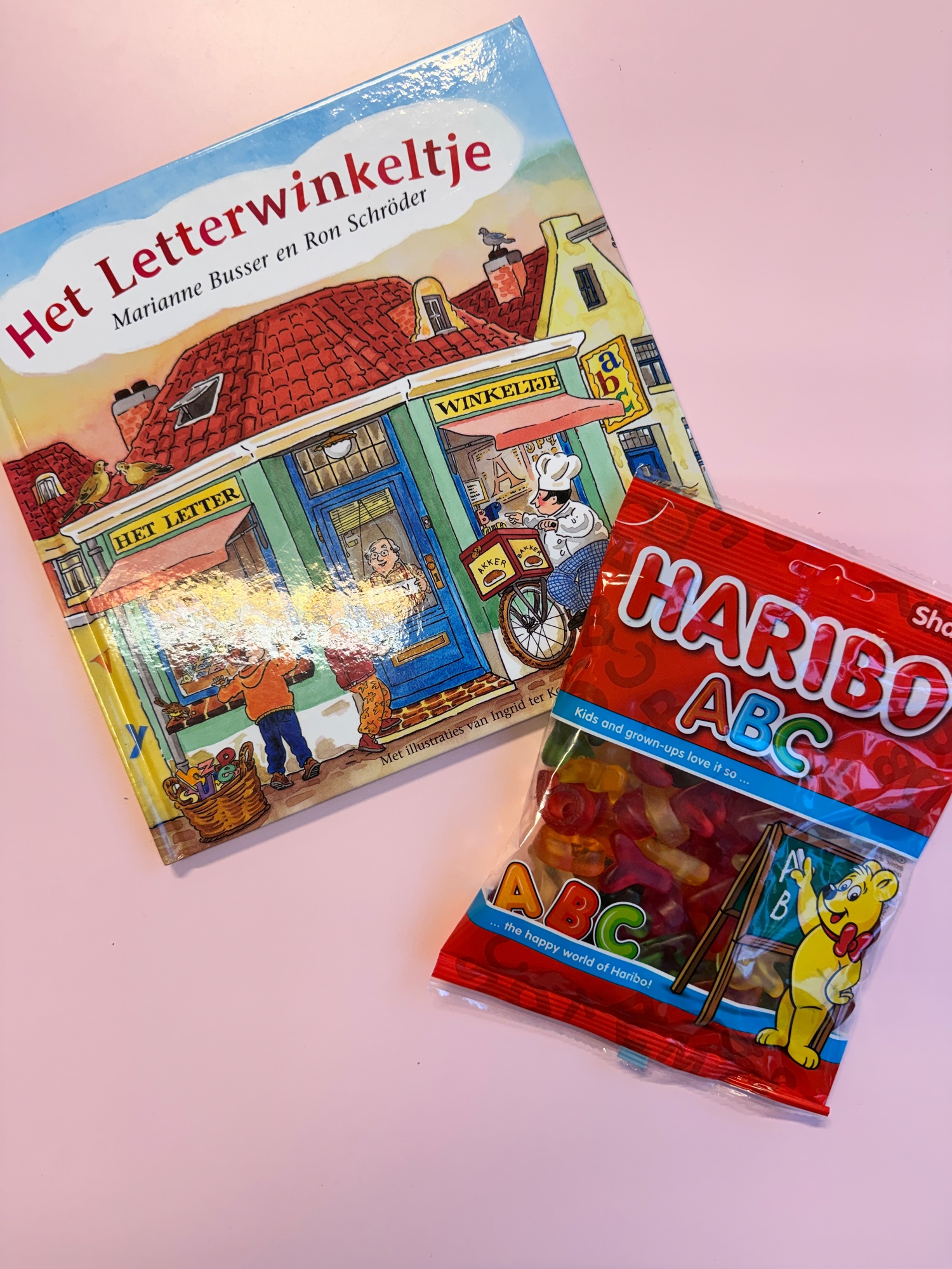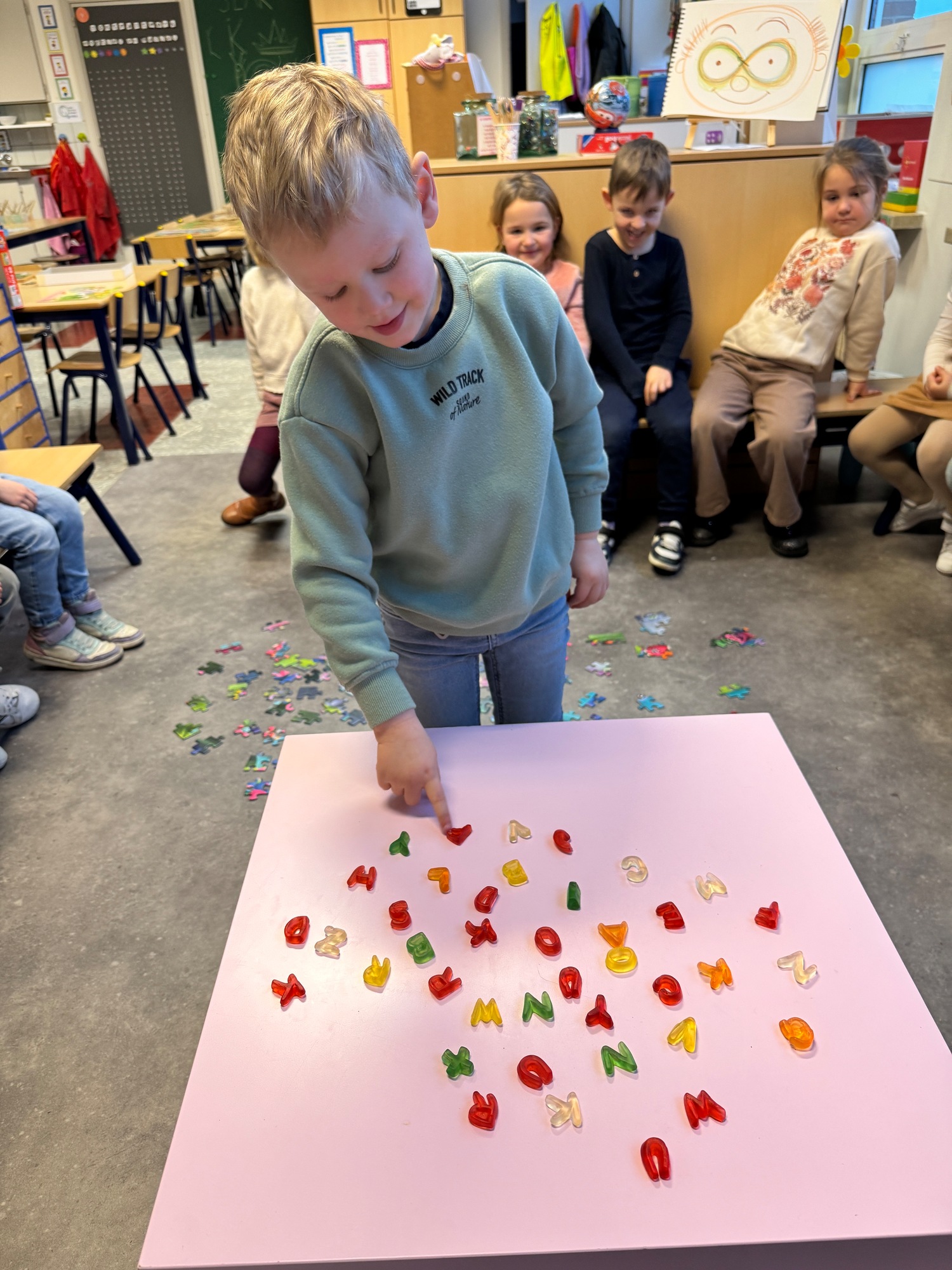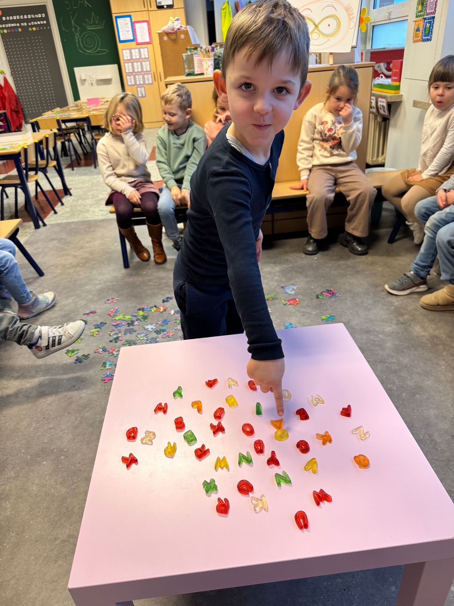 Pompom zat deze morgen niet op zijn stoeltje in onze kring. Hij zat op een andere plaats boven op een grote pak. Wat had hij meegebracht? Wat zat er onder de roze handdoek verstopt? Pompom had een nieuw boekje en een zak met snoepjes mee naar de klas. Het boekje gaat over een heel speciaal winkeltje waar je alleen maar letters kan kopen. In het zakje snoep zaten er lettersnoepjes. Wie kon zijn eerste letter van zijn/haar naam vinden tussen alle snoepjes?