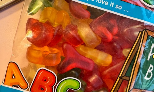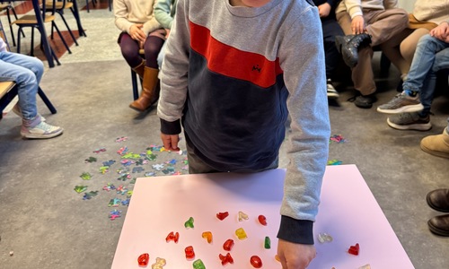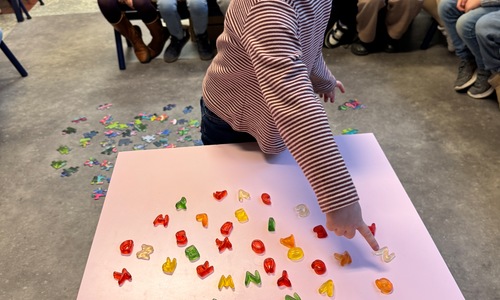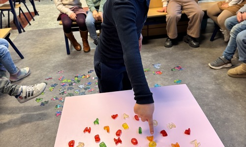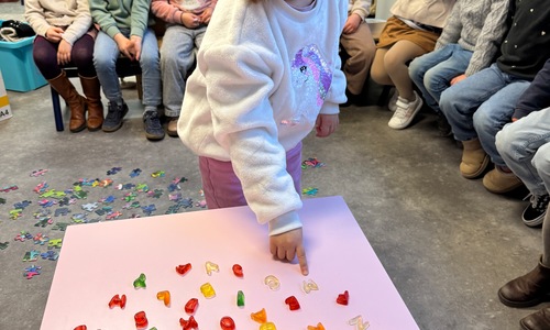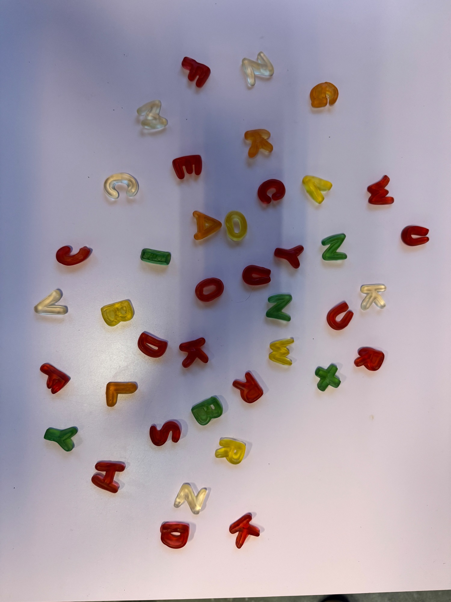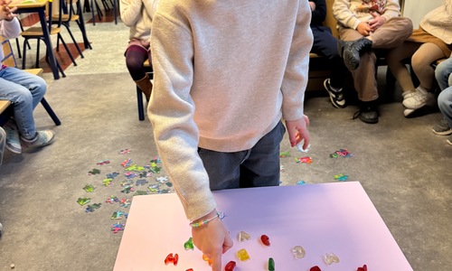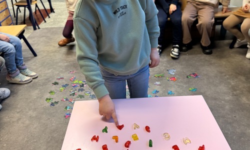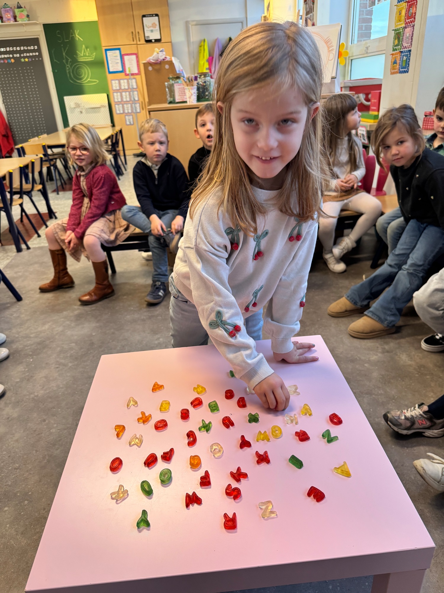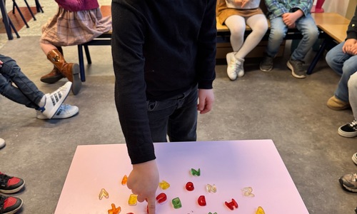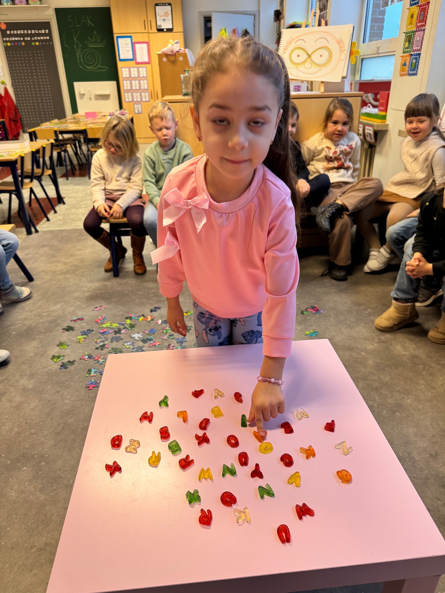 Pompom zat deze morgen niet op zijn stoeltje in onze kring. Hij zat op een andere plaats boven op een grote pak. Wat had hij meegebracht? Wat zat er onder de roze handdoek verstopt? Pompom had een nieuw boekje en een zak met snoepjes mee naar de klas. Het boekje gaat over een heel speciaal winkeltje waar je alleen maar letters kan kopen. In het zakje snoep zaten er lettersnoepjes. Wie kon zijn eerste letter van zijn/haar naam vinden tussen alle snoepjes?