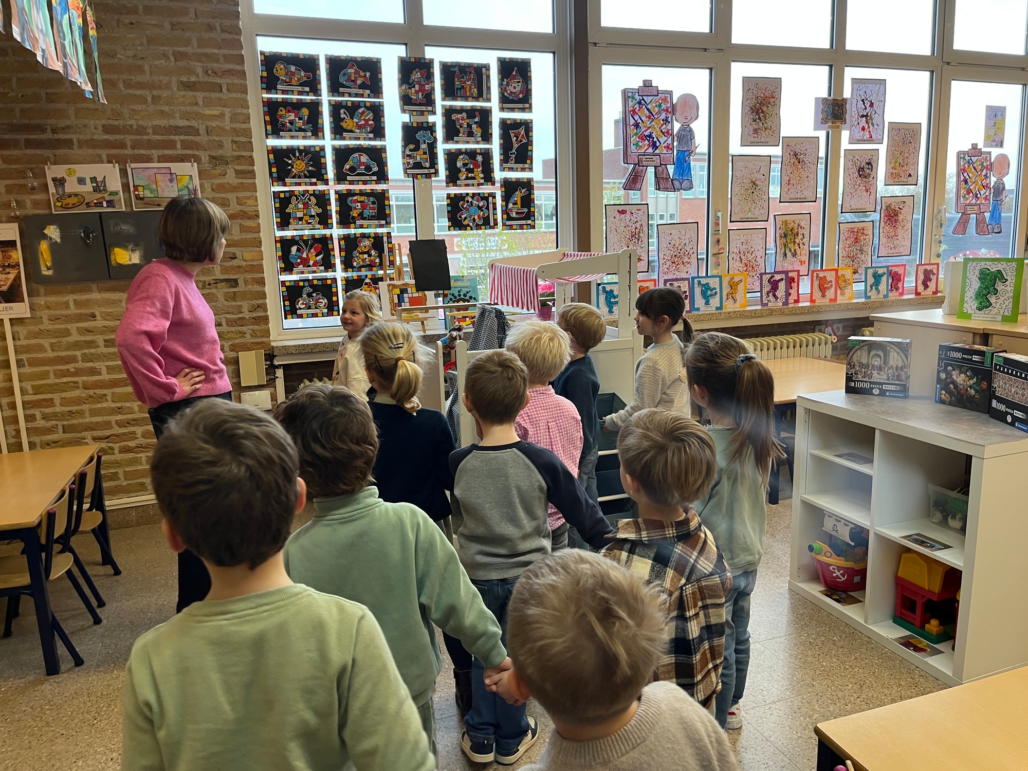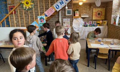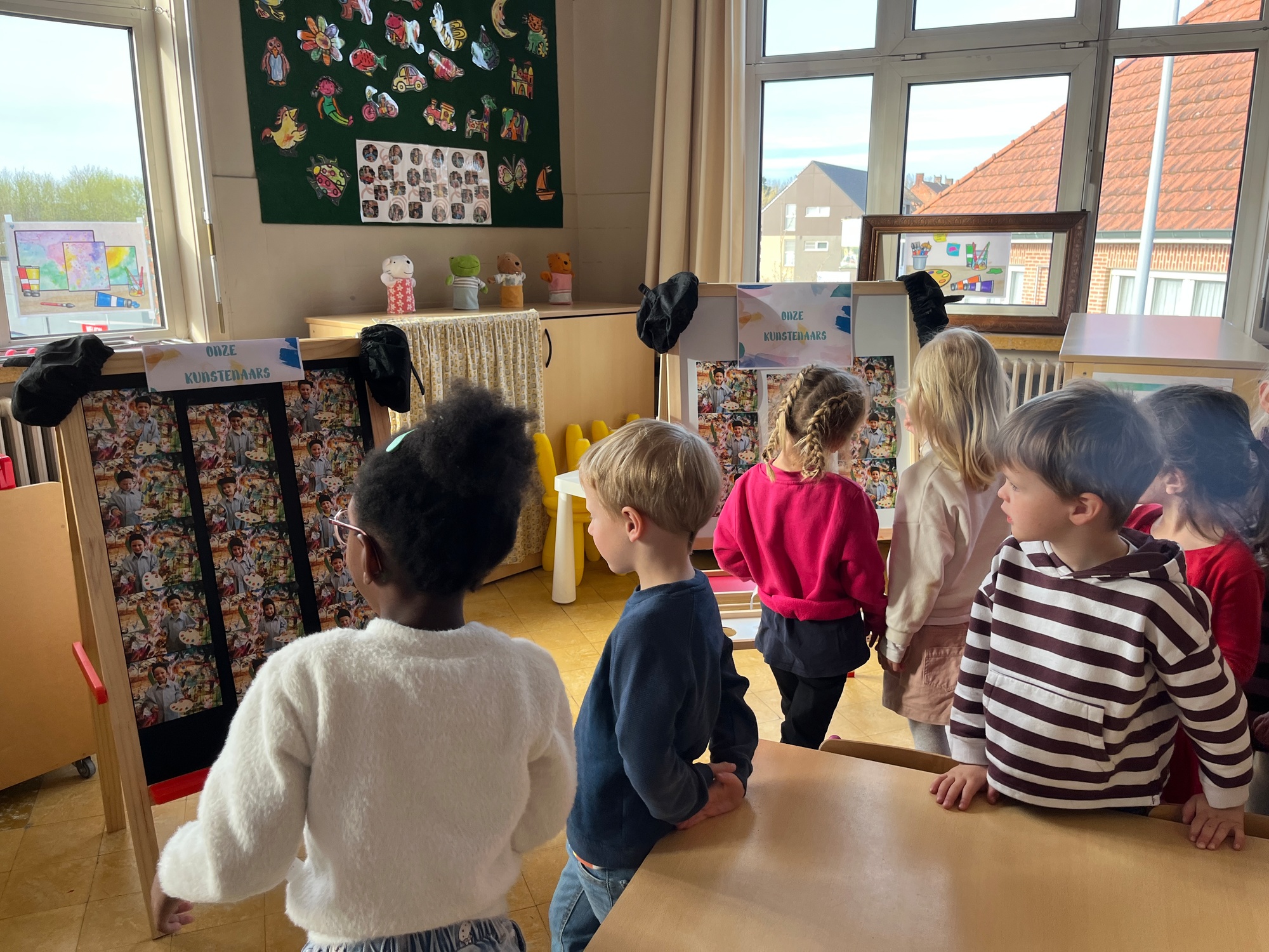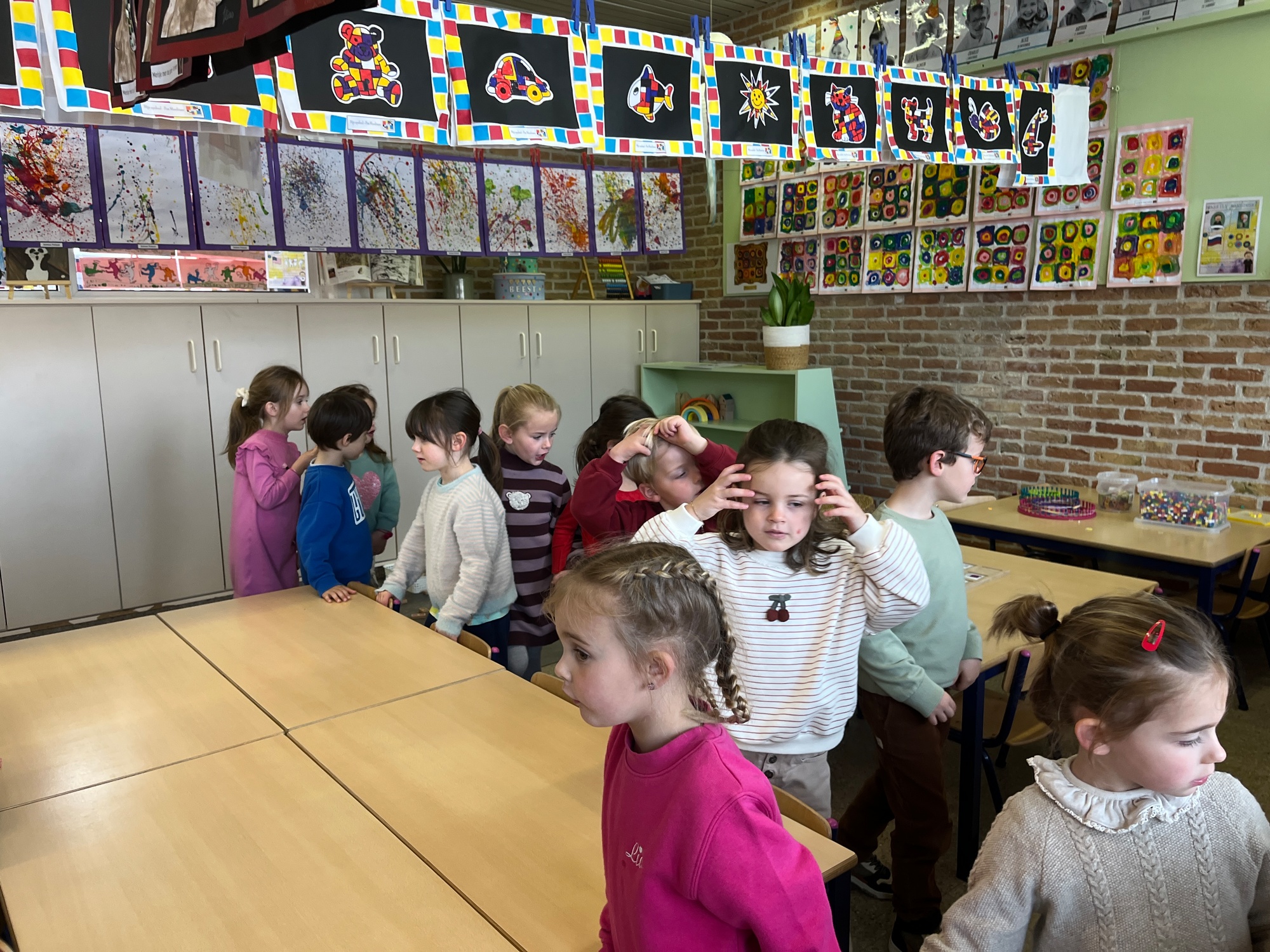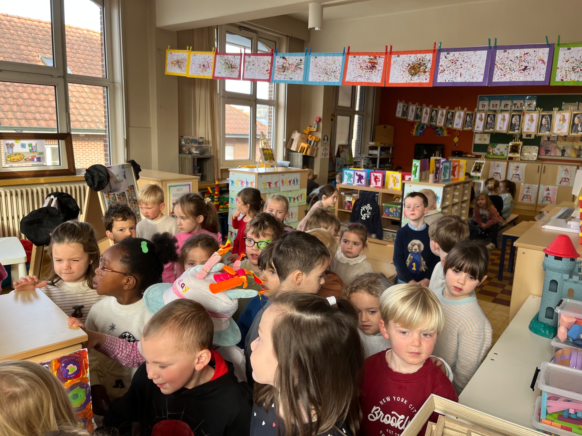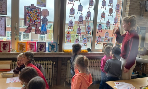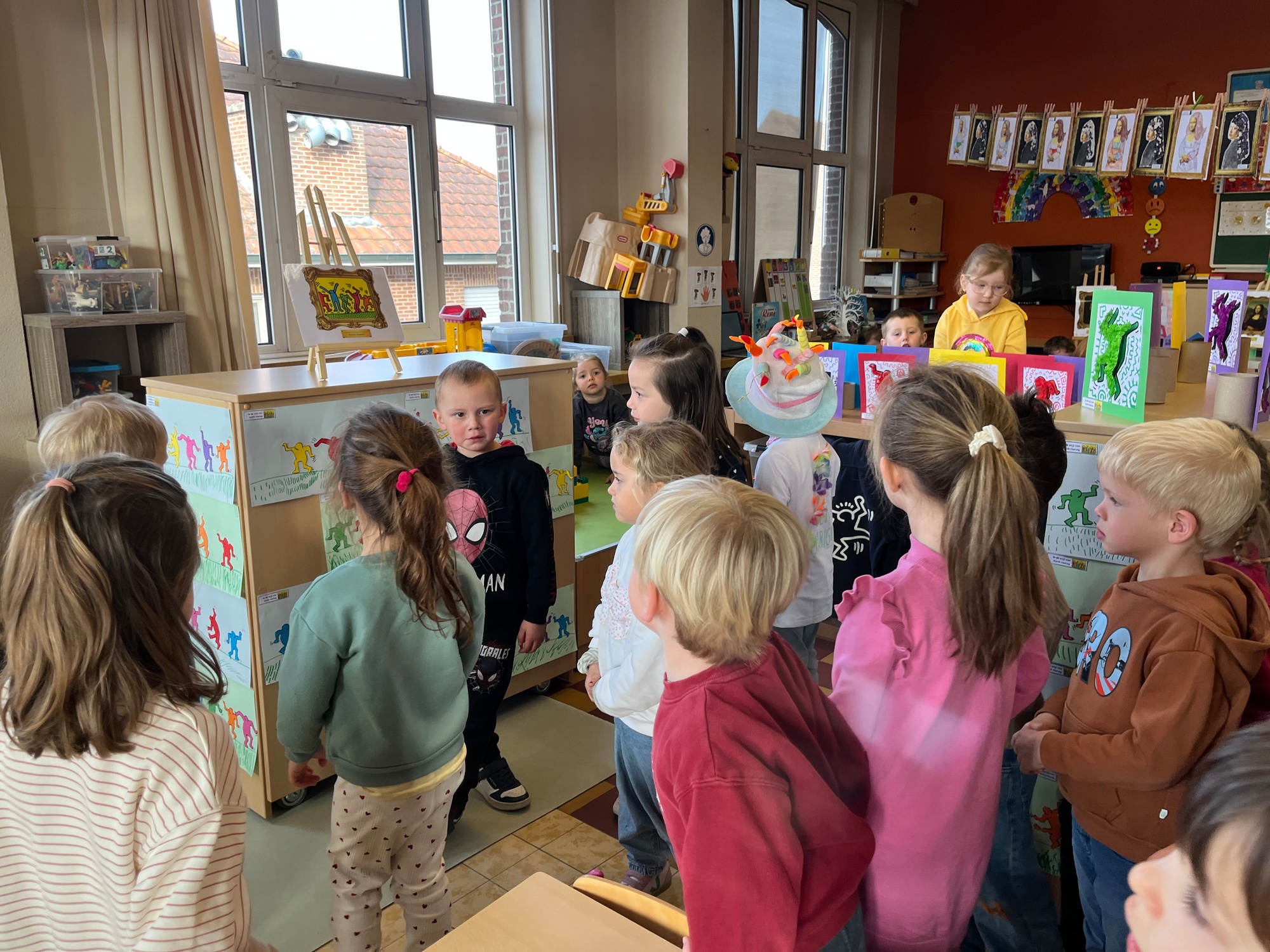 2KA: DE KUNSTENAARS VAN DE TWEEDE KLEUTERKLAS GINGEN OOK EENS BIJ ELKAAR OP BEZOEK.