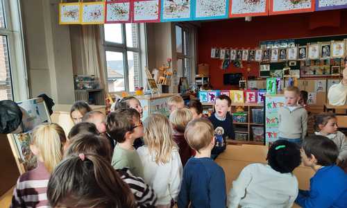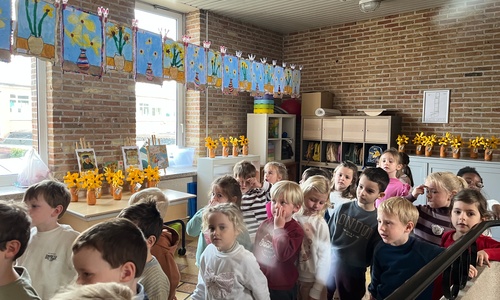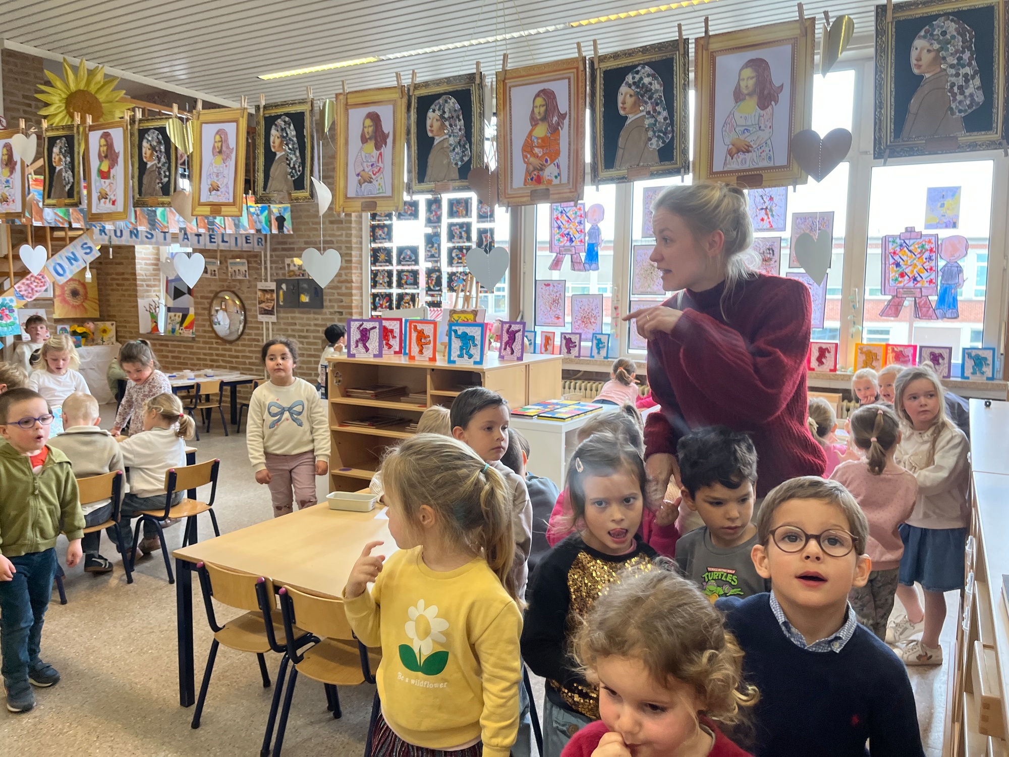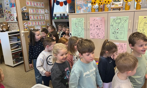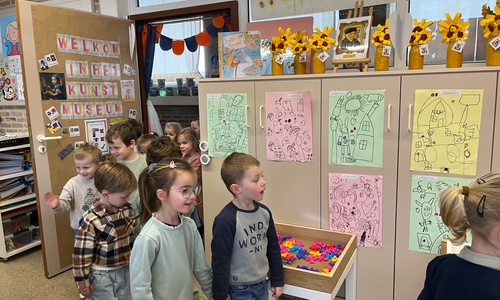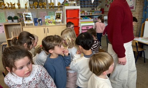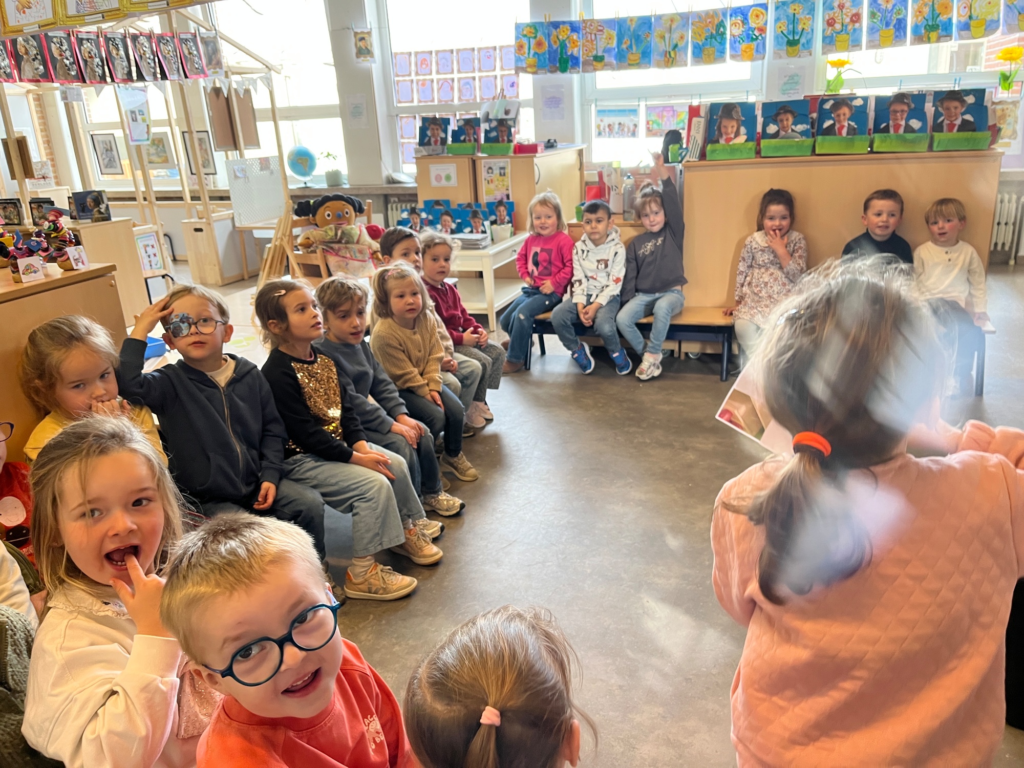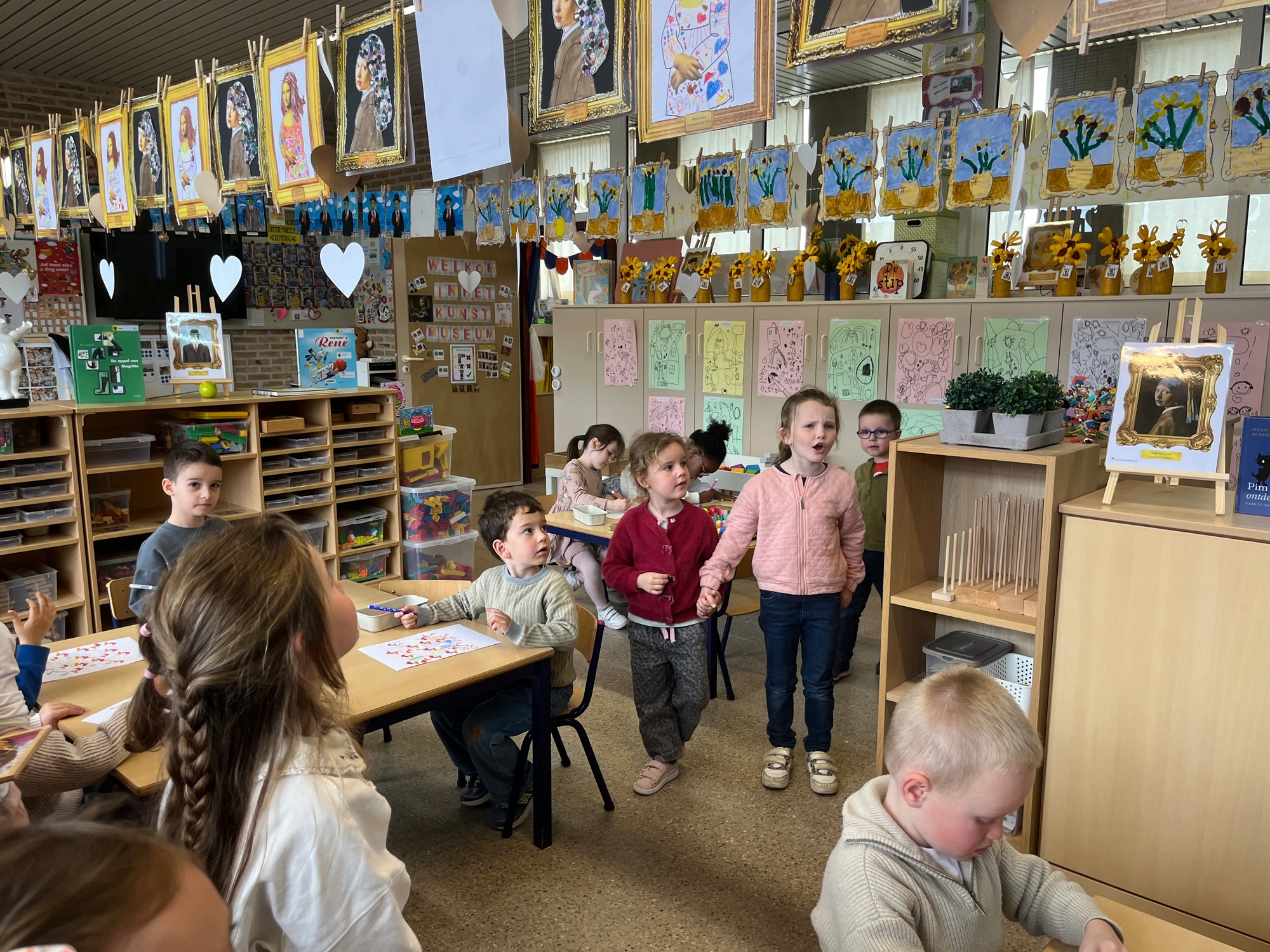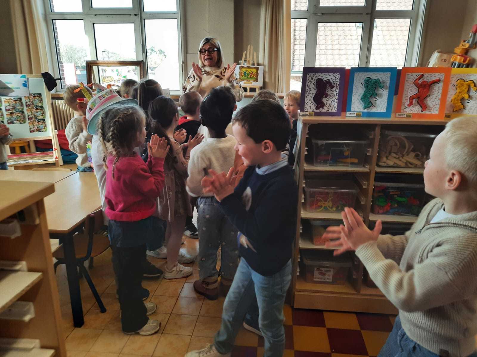 2KA: DE KUNSTENAARS VAN DE TWEEDE KLEUTERKLAS GINGEN OOK EENS BIJ ELKAAR OP BEZOEK.