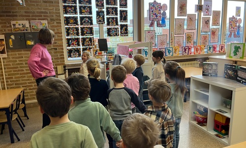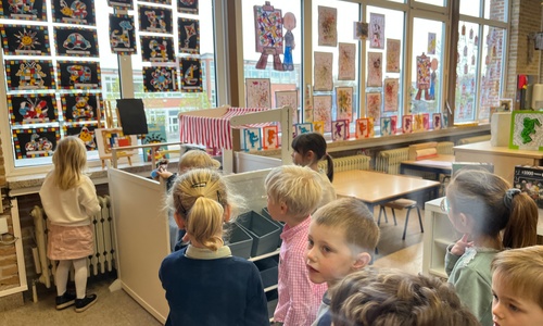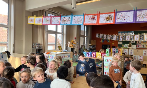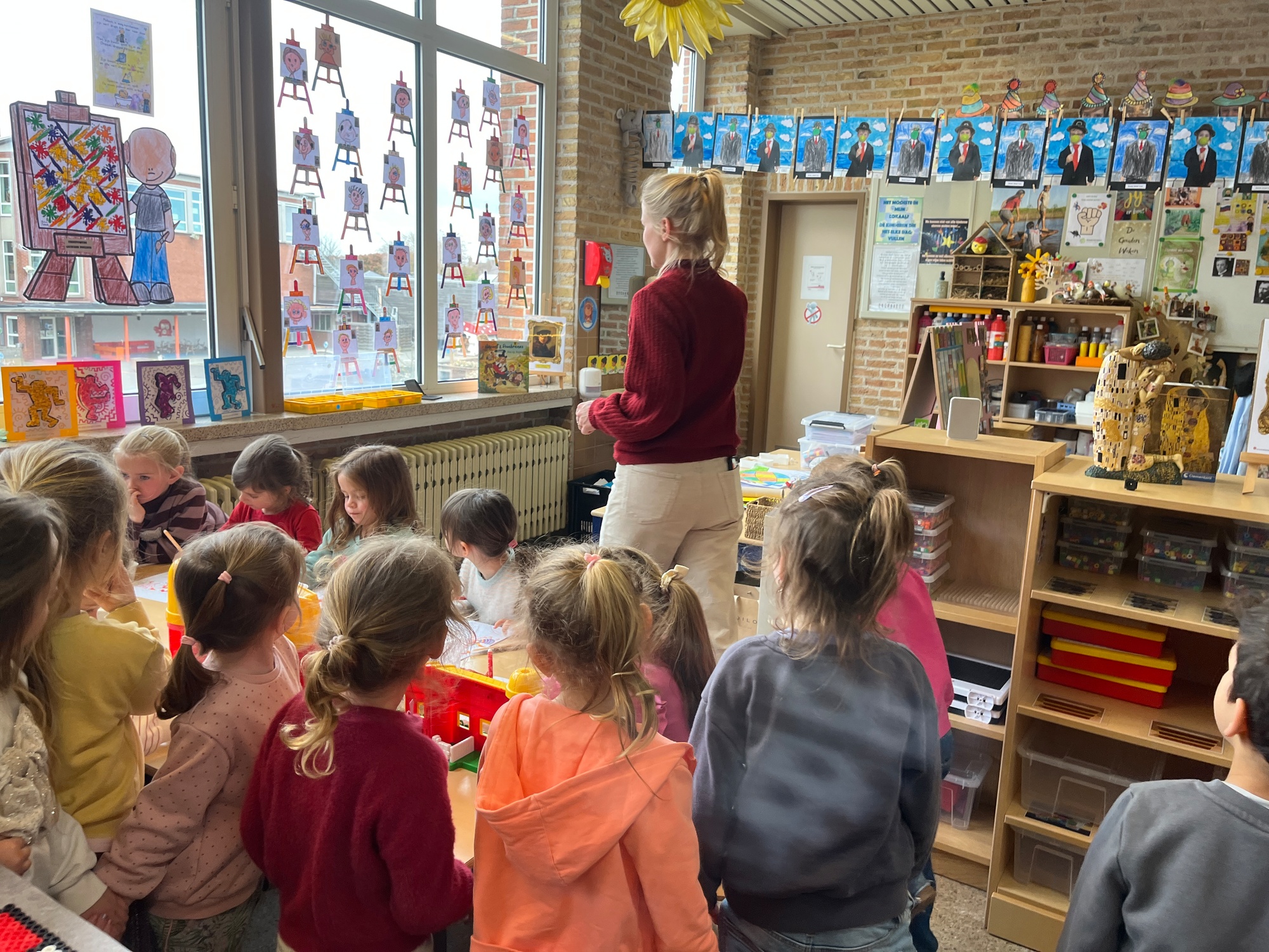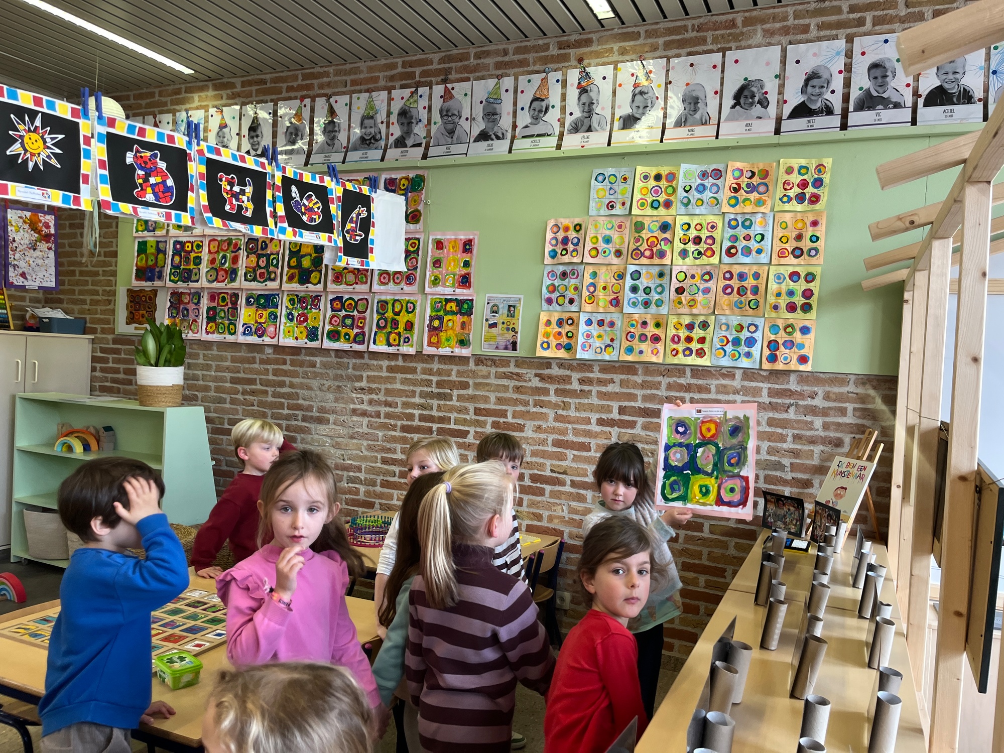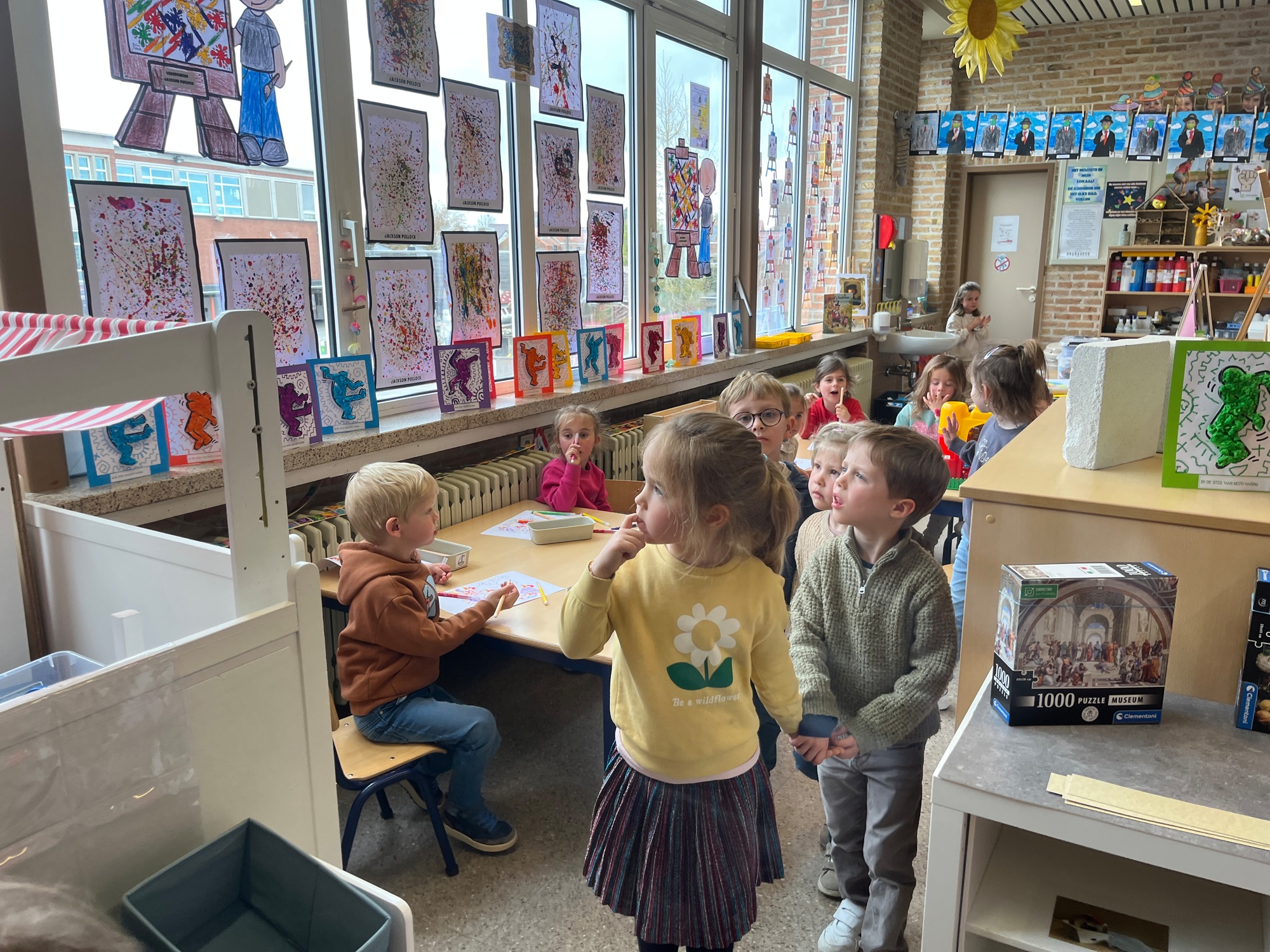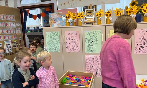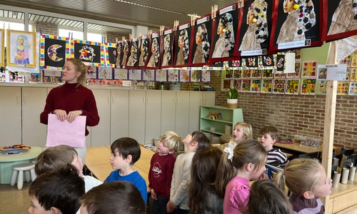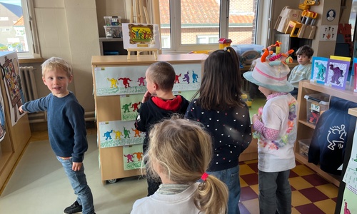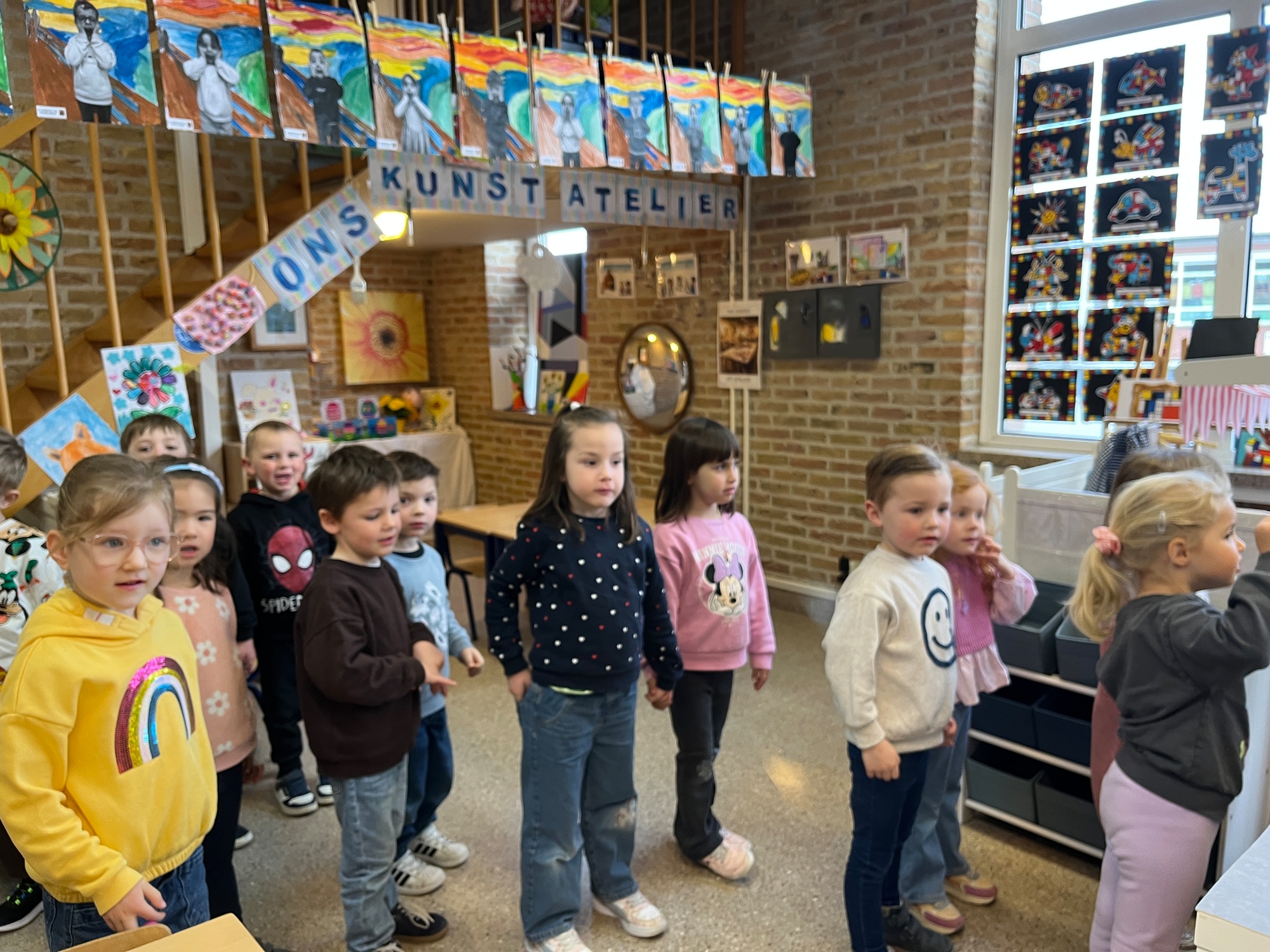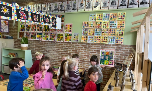 2KA: DE KUNSTENAARS VAN DE TWEEDE KLEUTERKLAS GINGEN OOK EENS BIJ ELKAAR OP BEZOEK.