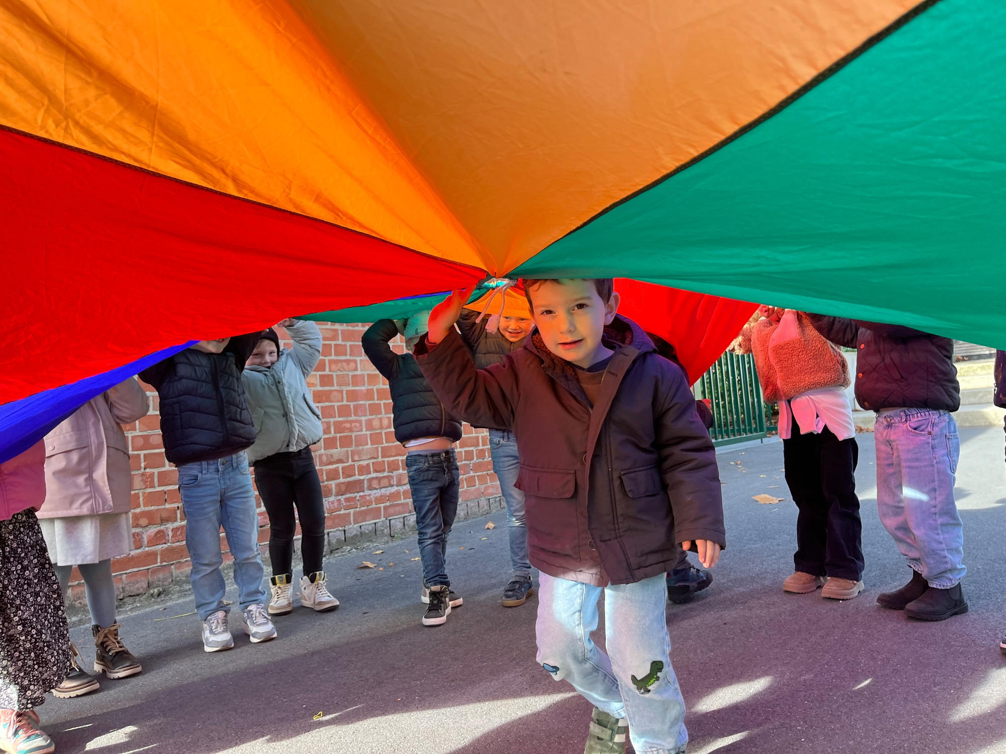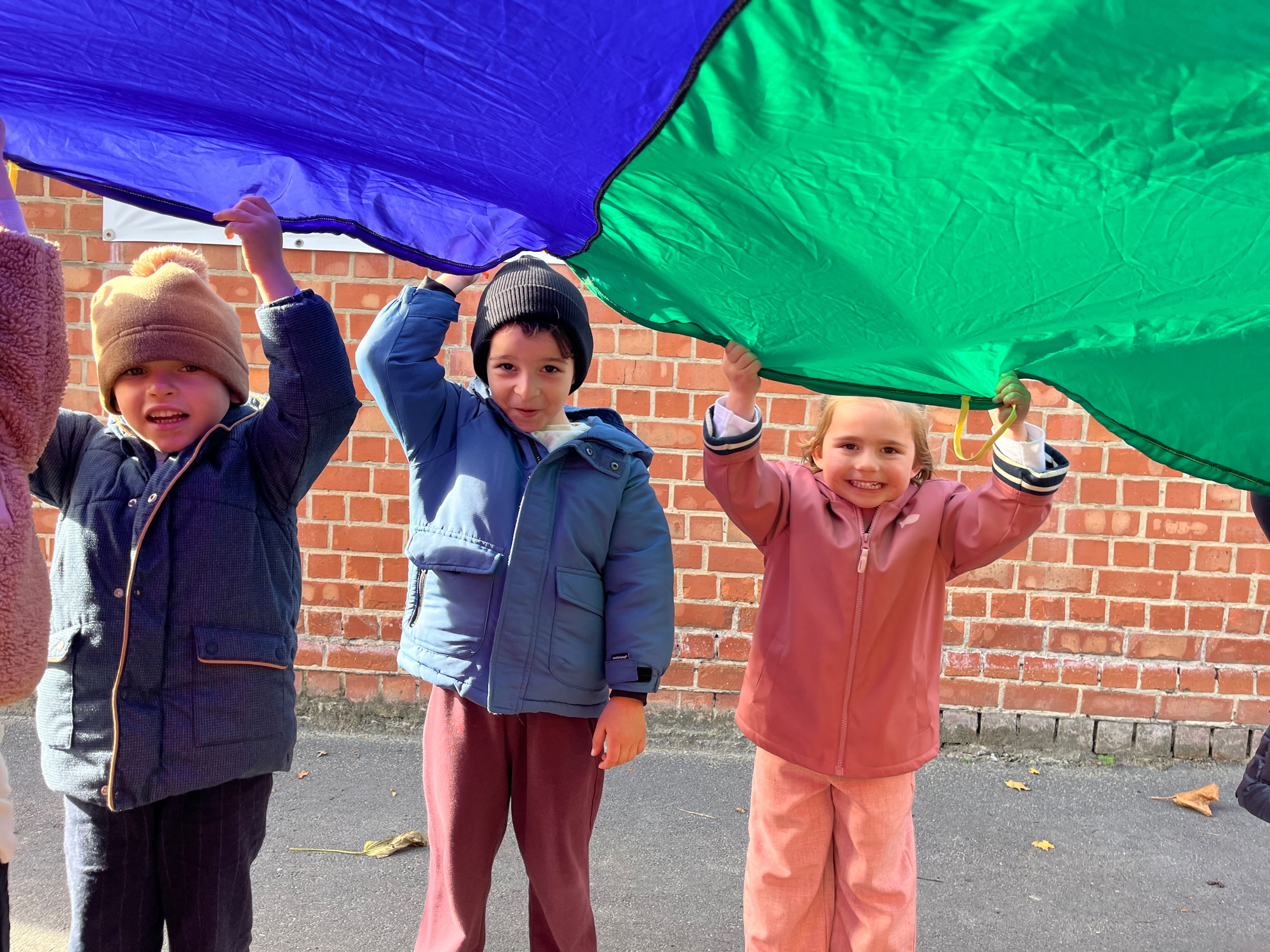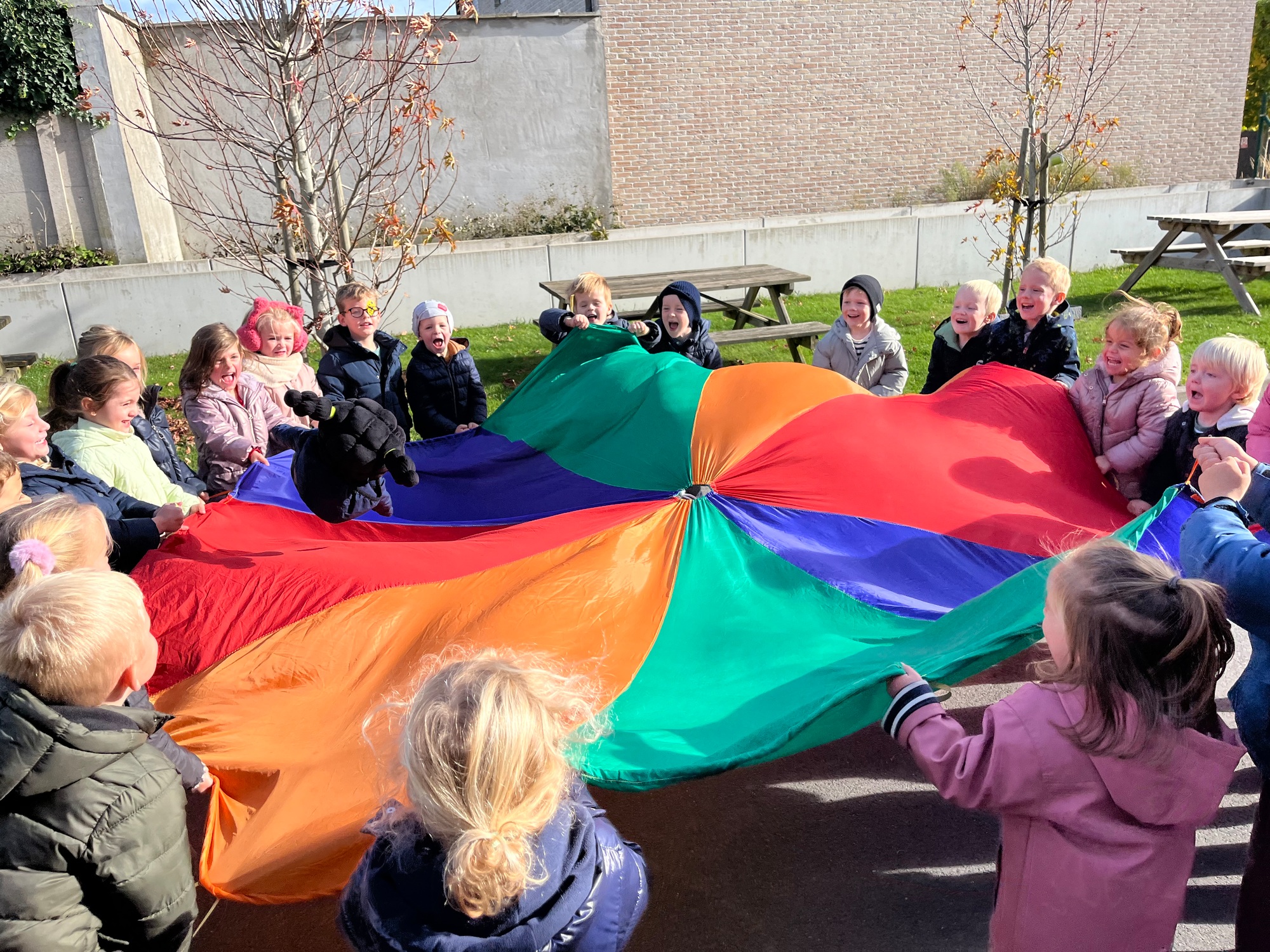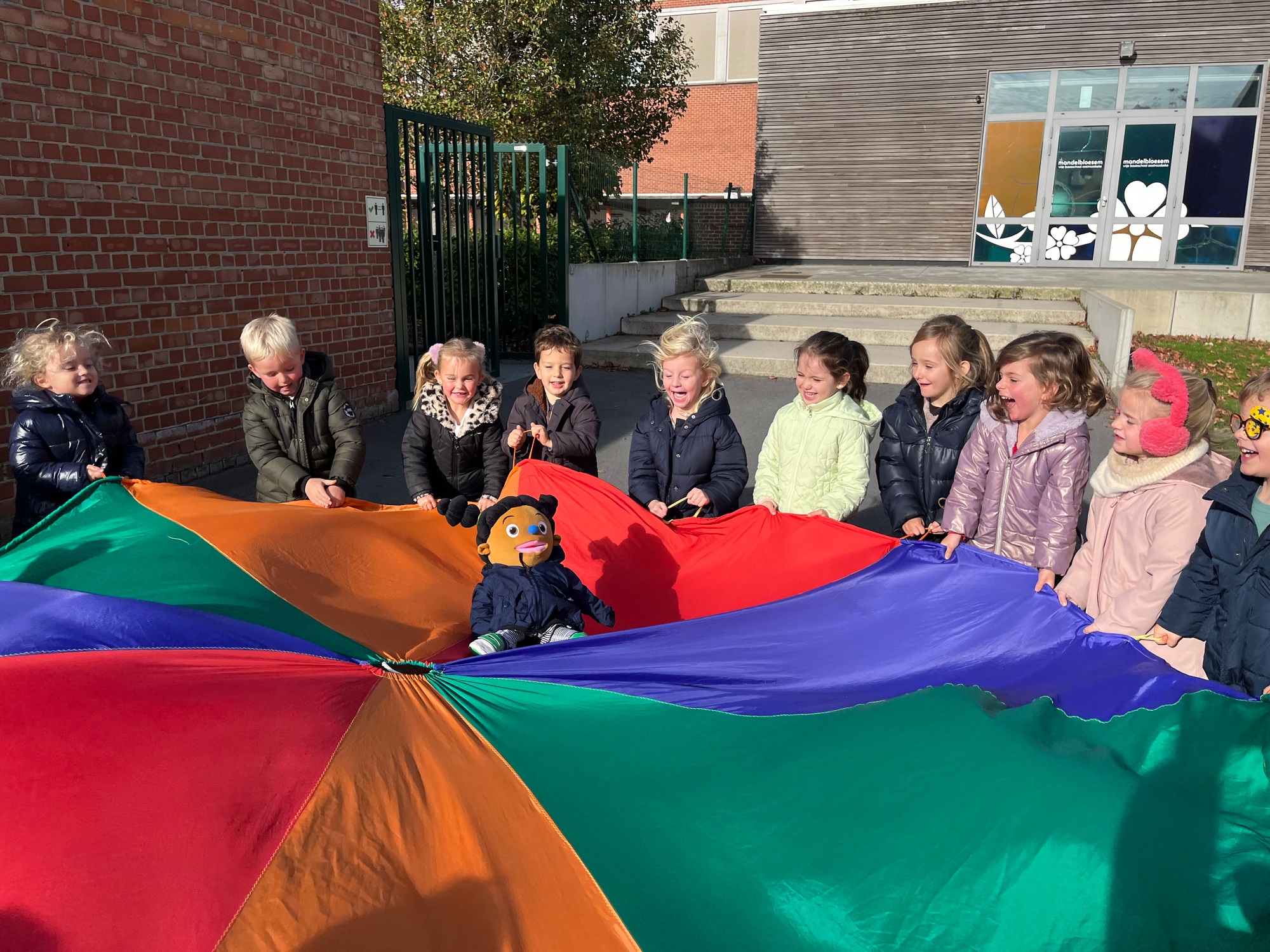 We maken wind met de parachute en laten Looeloe springen in de parachute