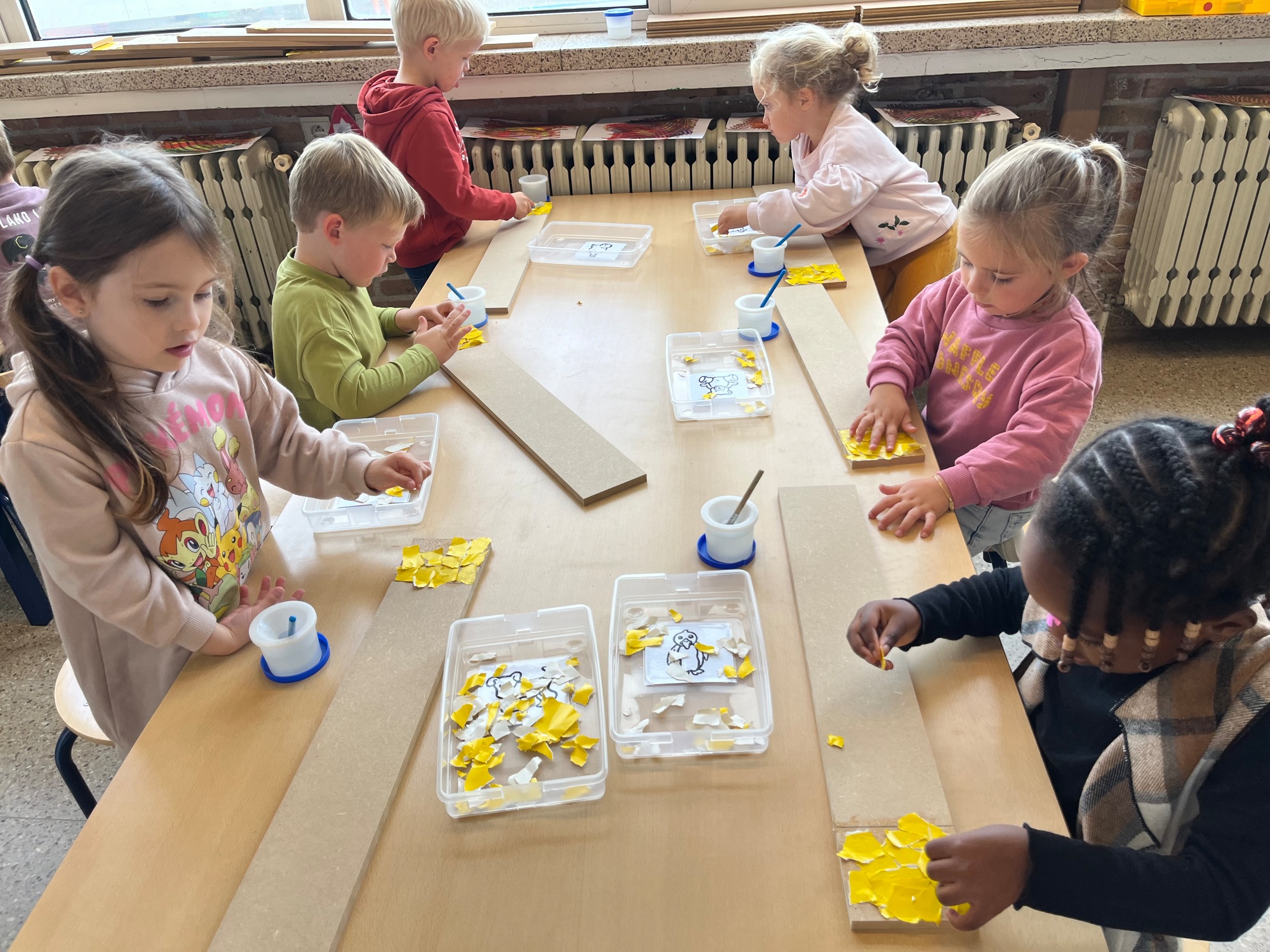 We pasten verschillende technieken toe: knippen, scheuren, schilderen, stempelen, kleven,..