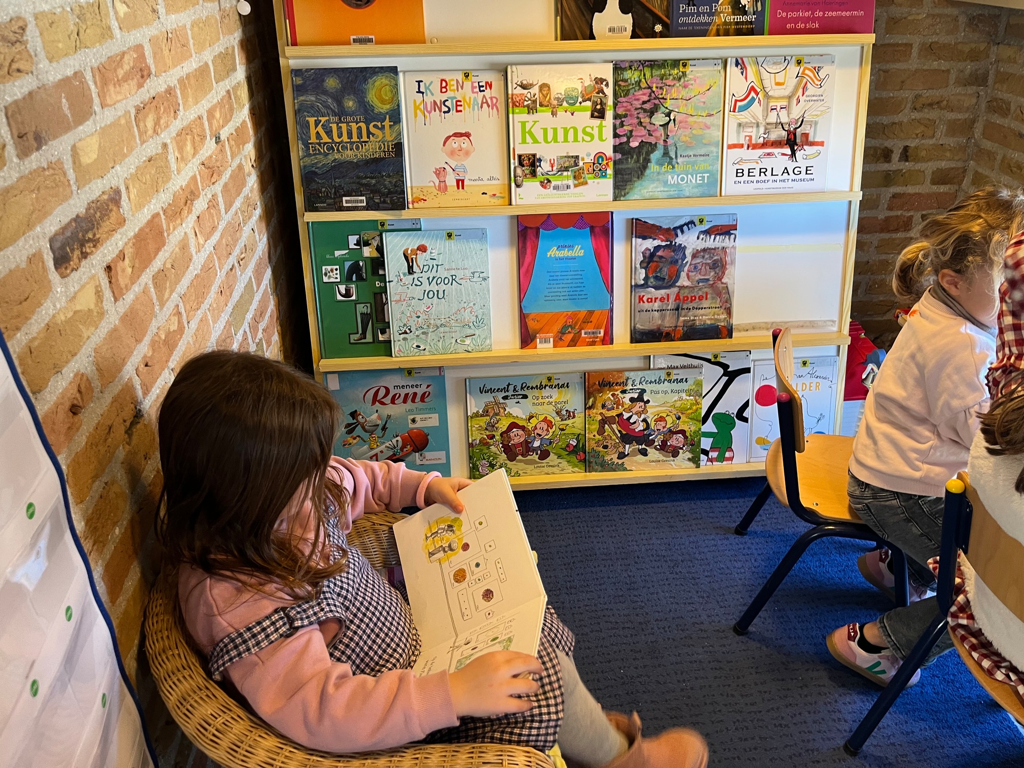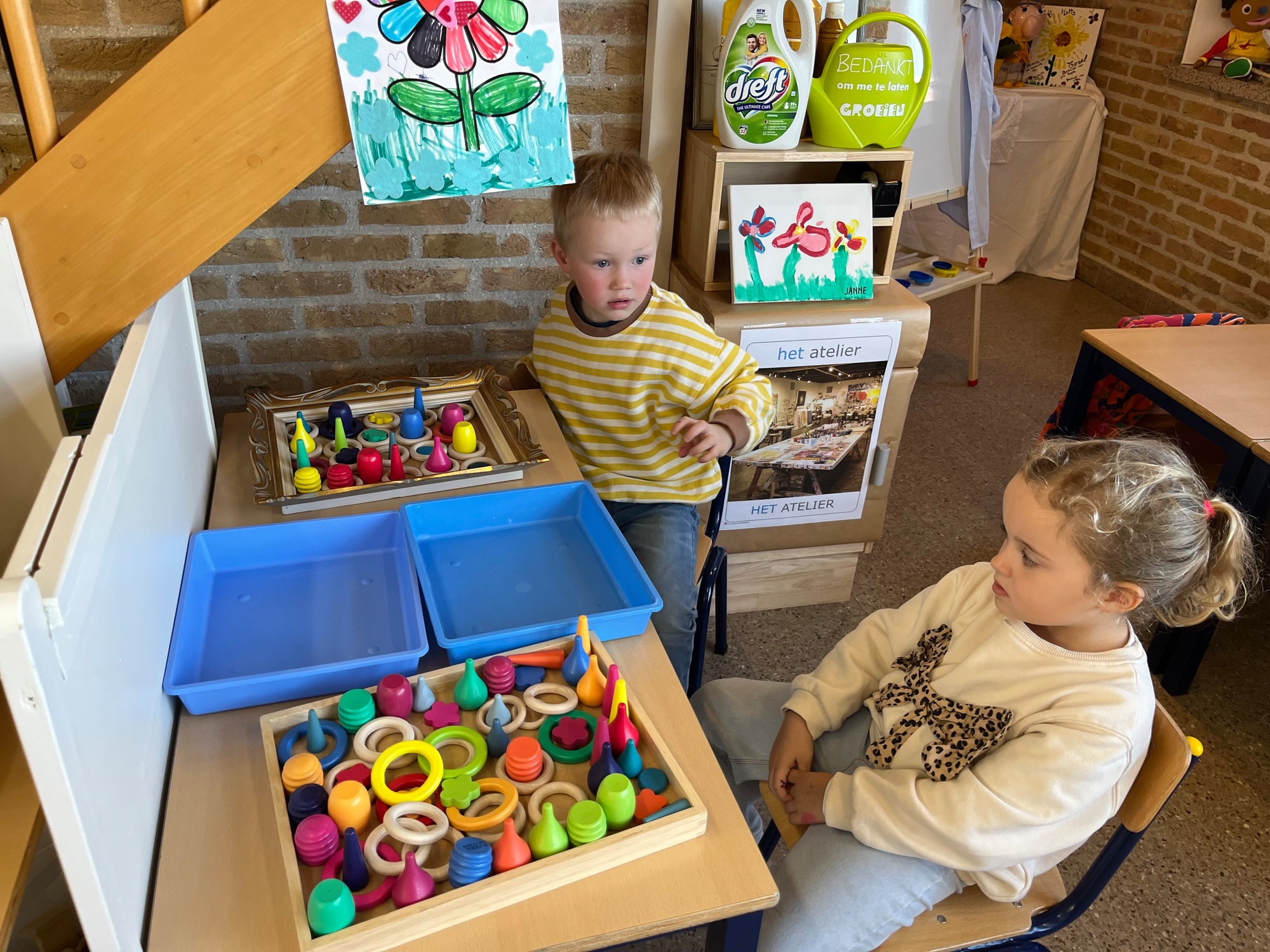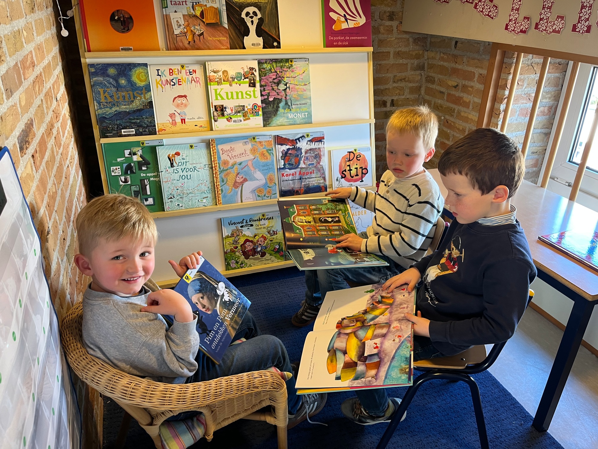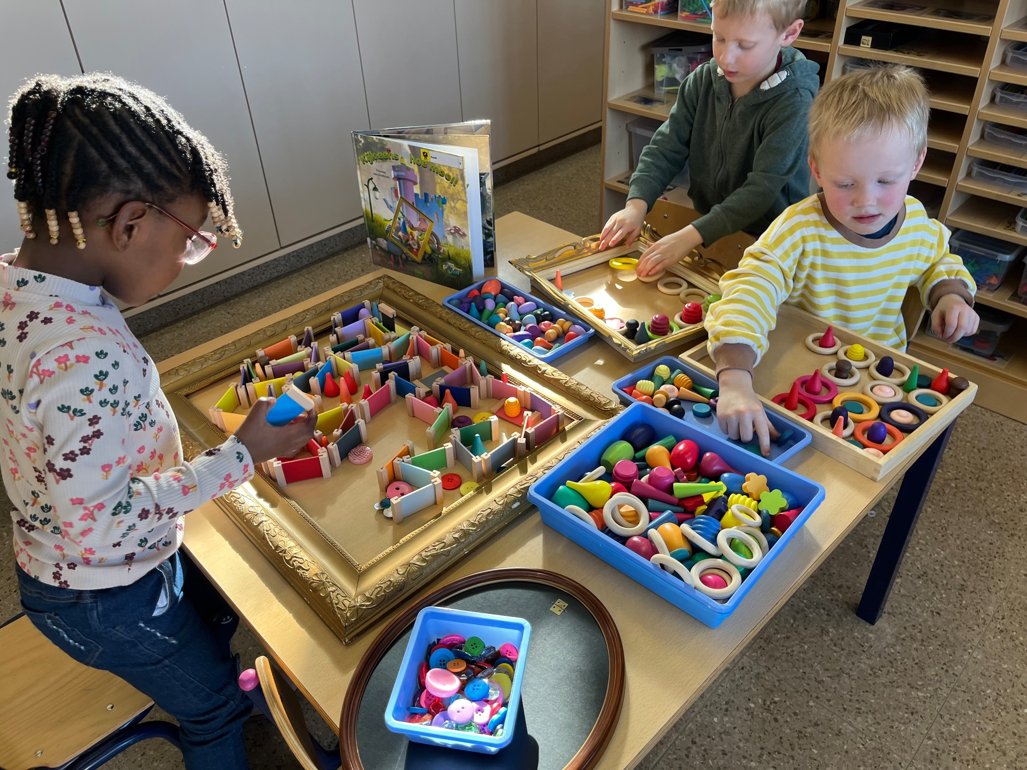 Kunstwerken maken met loose parts, museums bouwen met de magneten, kijken inboeken en vertellen aan elkaar in de boekenhoek