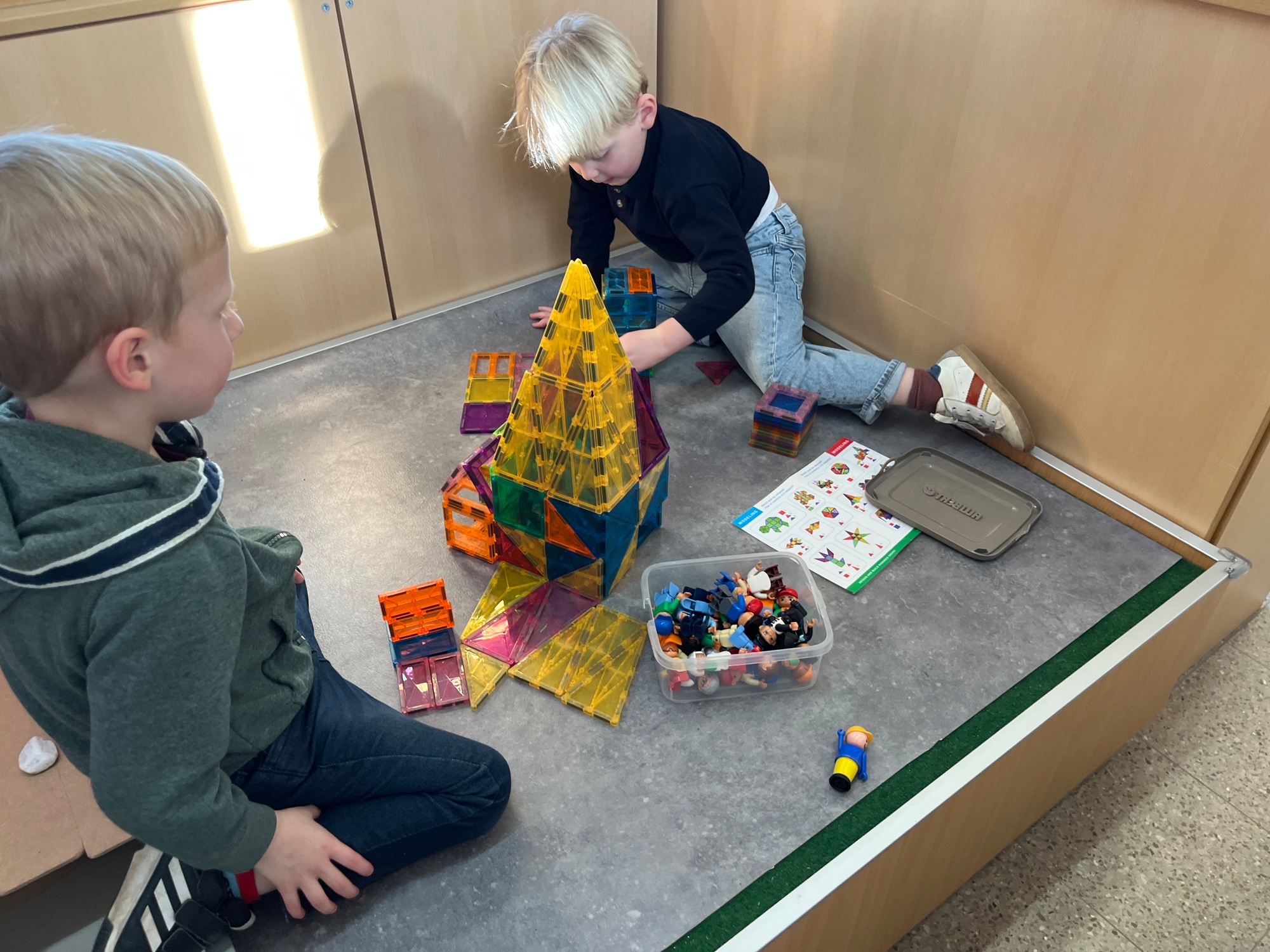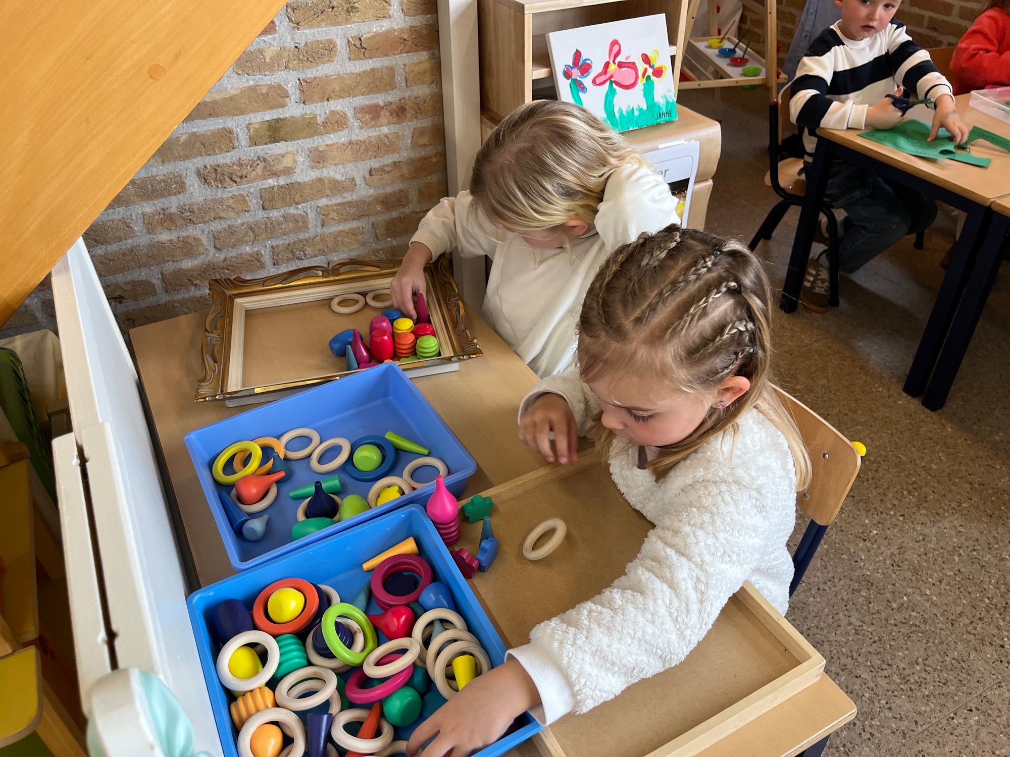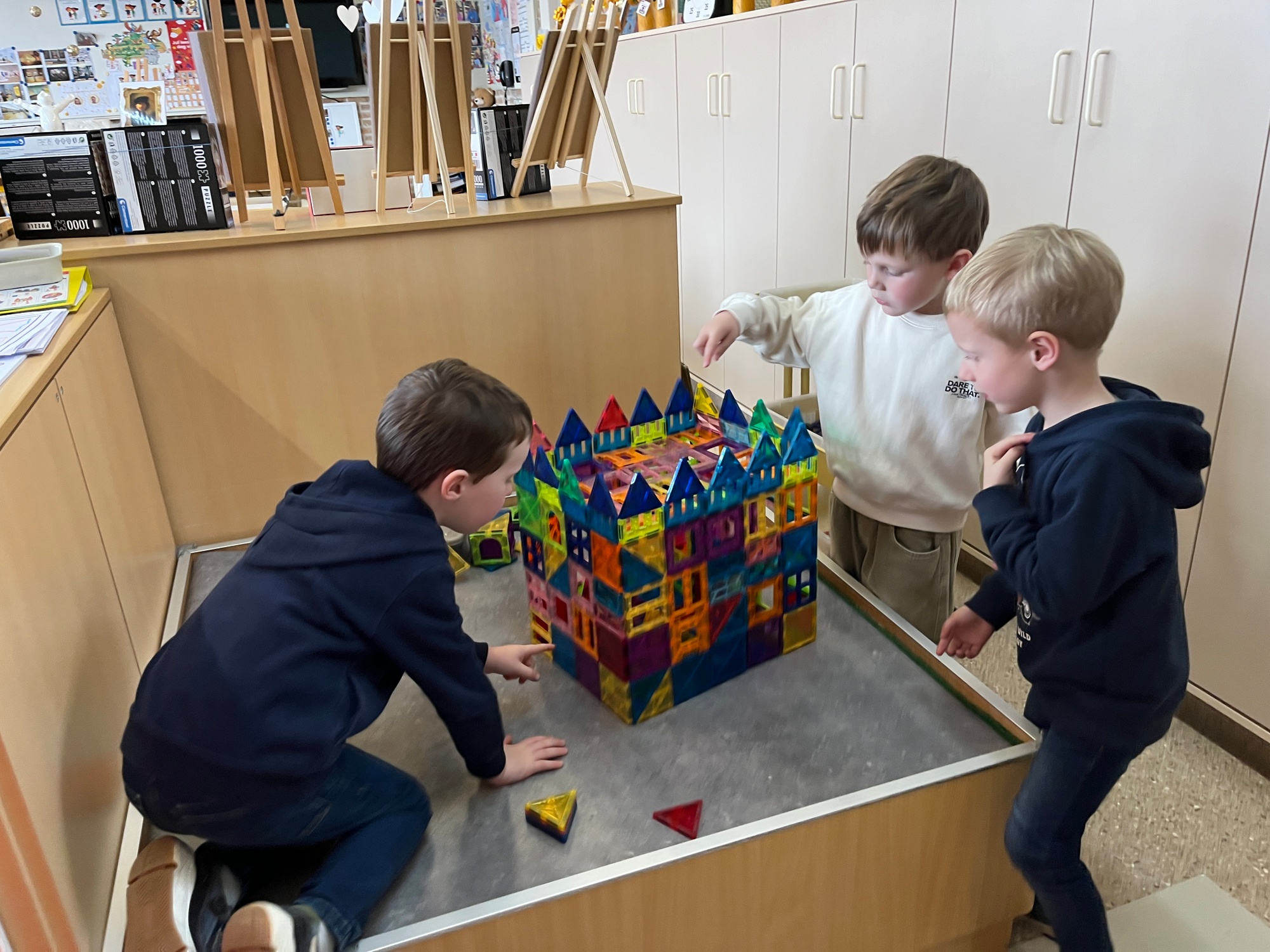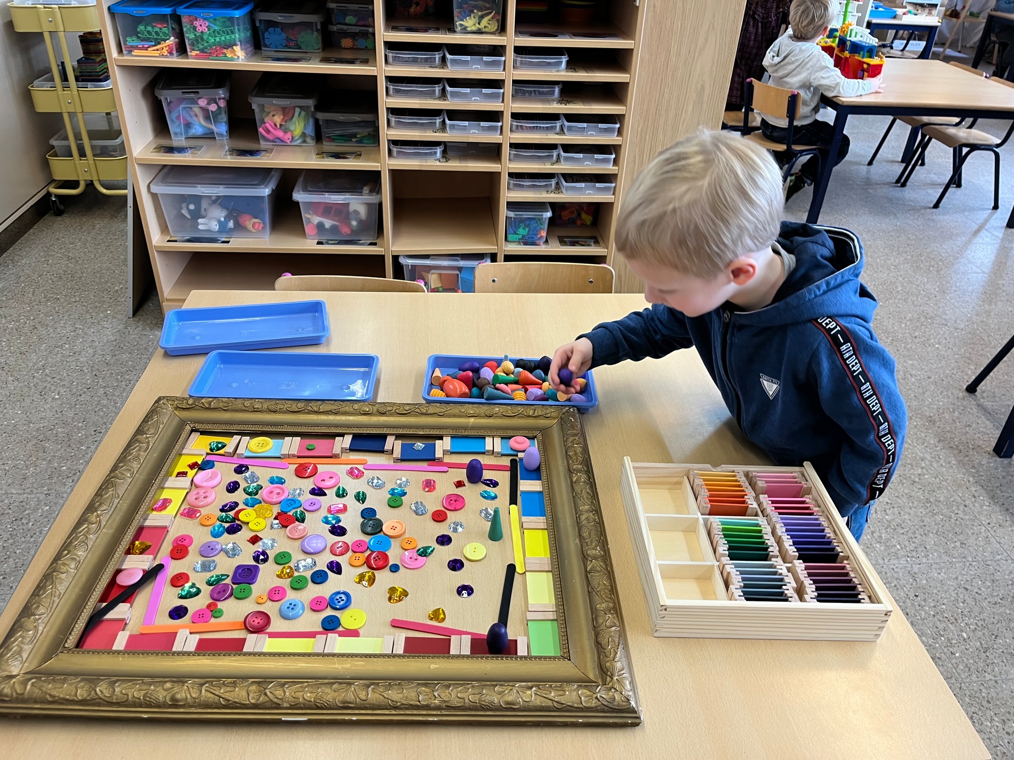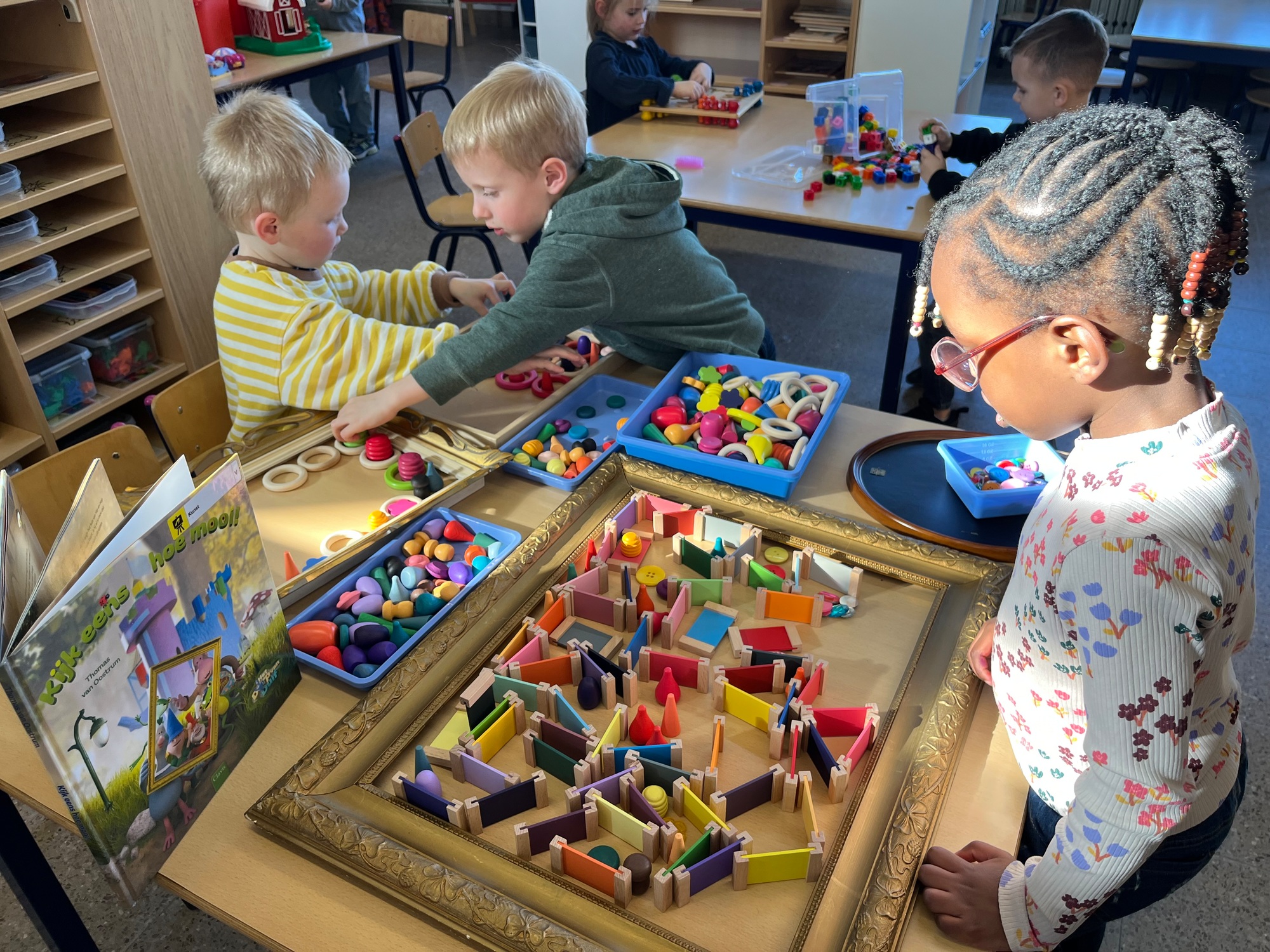 Kunstwerken maken met loose parts, museums bouwen met de magneten, kijken inboeken en vertellen aan elkaar in de boekenhoek